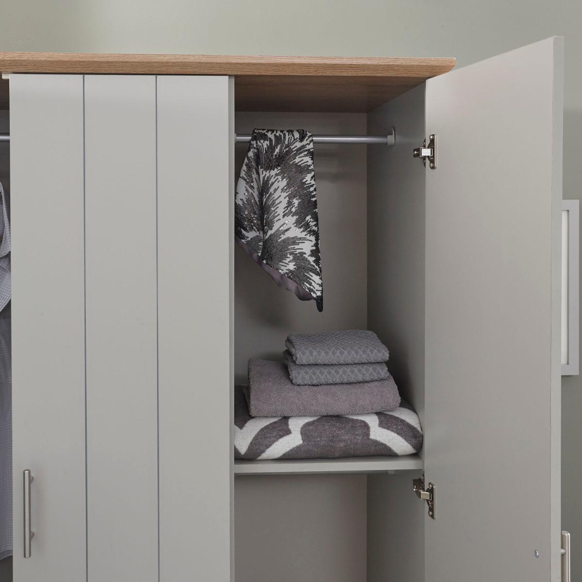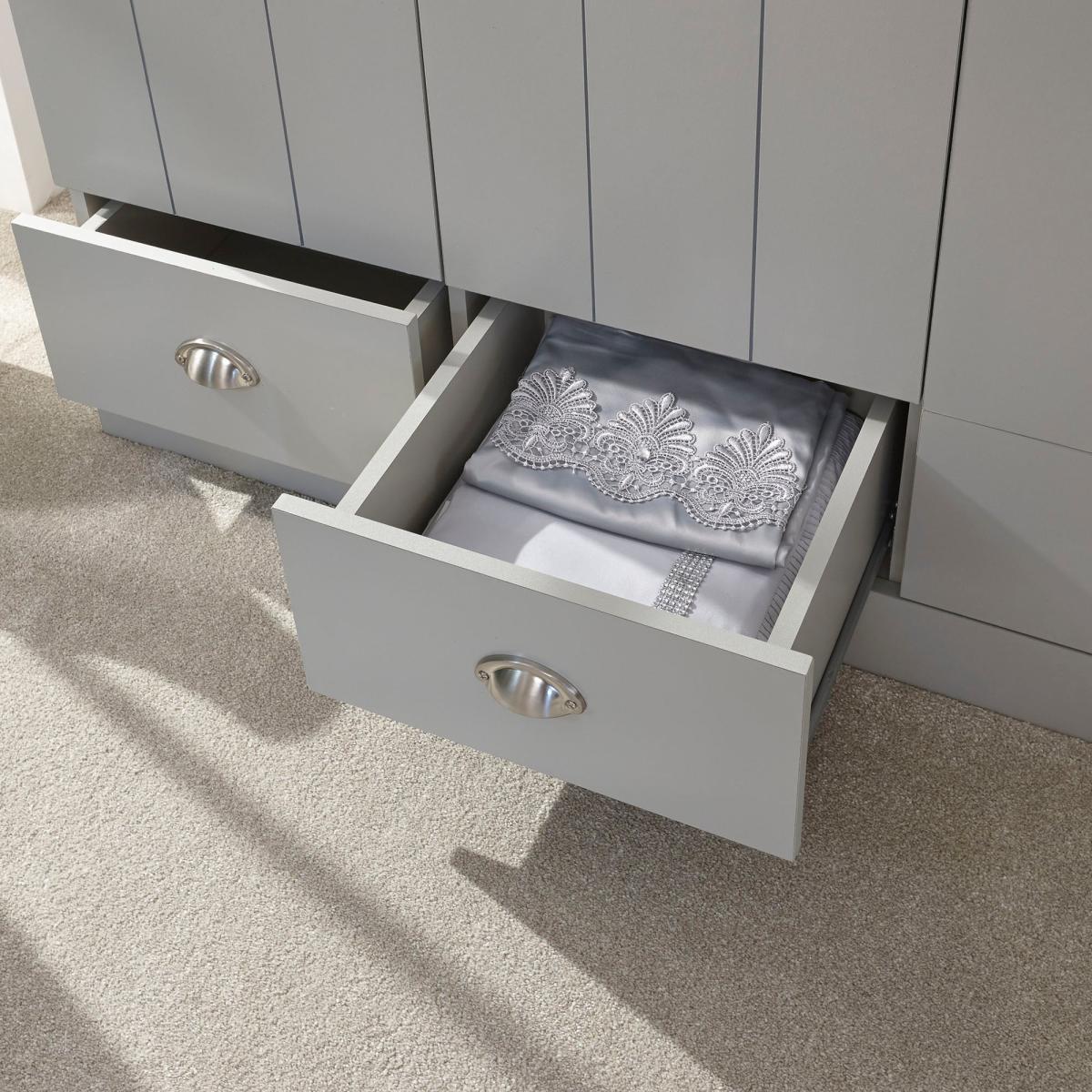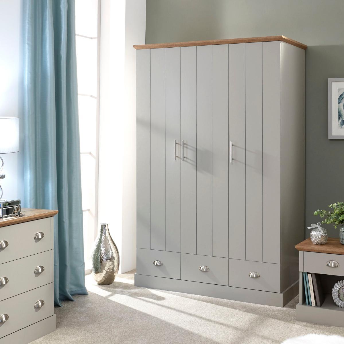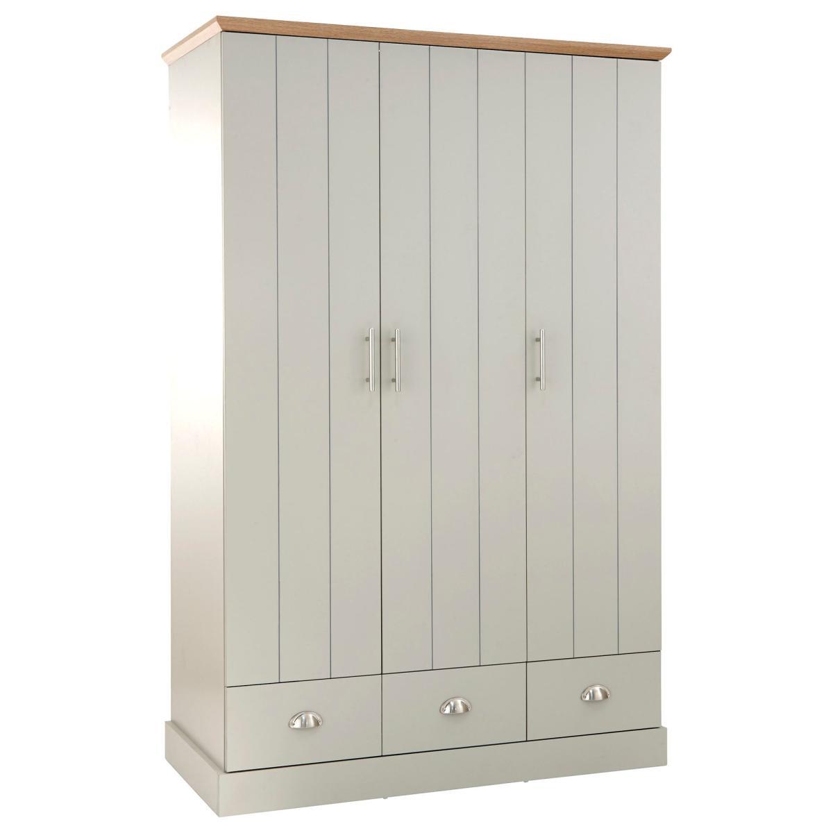 Finished in a grey colourway with a contrasting bevelled edge oak-effect top and brushed steel handles, the Kendal triple wardrobe has a design that would suit any classic or contemporary bedroom. This self-assembly wardrobe features a large hanging rail, two smaller rails and one shelf, with three matching drawers beneath. Please note, unfortunately we cannot deliver this item to the Channel Islands.