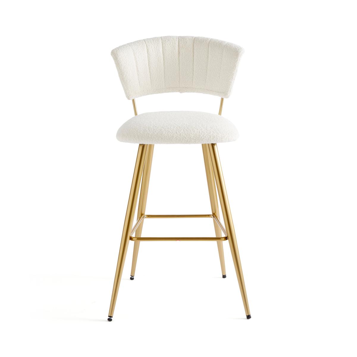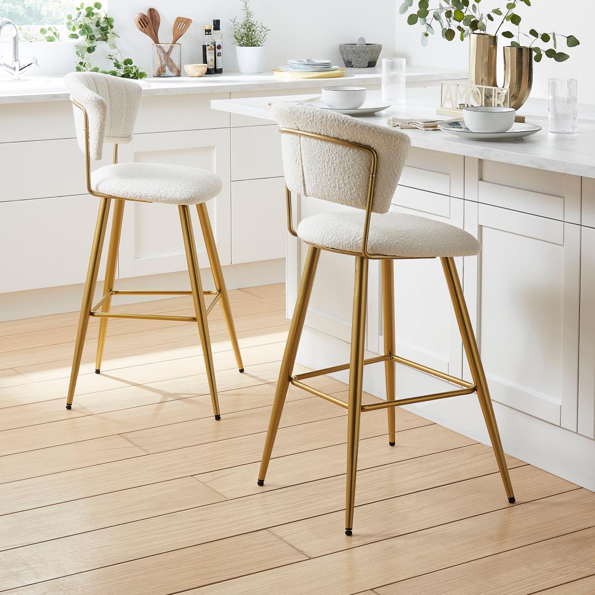 I love this stool because of its versatile and clean design, blending a plush bouclé seat with sleek, gold-toned legs for a timeless look. It works well in both contemporary and classic interiors, especially in kitchens or breakfast bars where a touch of luxury is desired without sacrificing practicality. To style it effectively, consider pairing it with neutral tones or contrasting textures to make it stand out, and keep the surrounding space uncluttered to highlight its sophisticated yet understated appeal. Its comfortable seat and chic finish make it ideal for daily use and a stylish addition to any casual dining or bar area.
