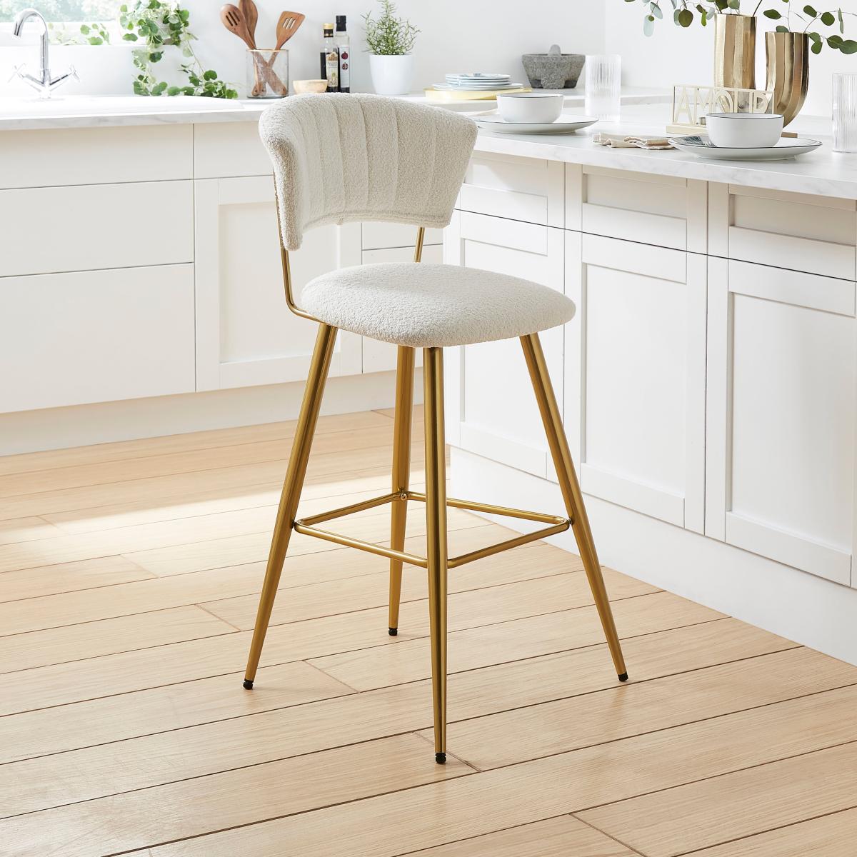 * Plush, boucle upholstery* Gold-finished metal legs* Contemporary, luxe design* Various, trendy colourways Finished in a soft boucle in a choice of stunning colours to match our Kendall chair, this bar stool boasts a contemporary luxe design. This stylish bar stool is crafted with a pleated, curved shell back and gold-finished metal legs to add a modern touch to your kitchen area.