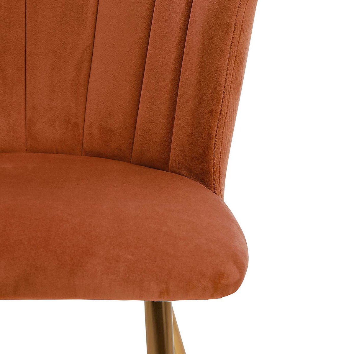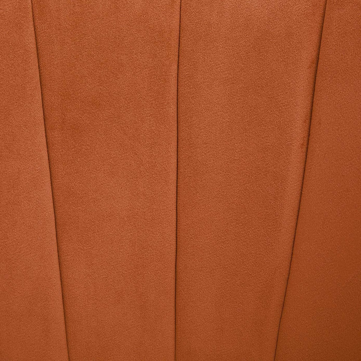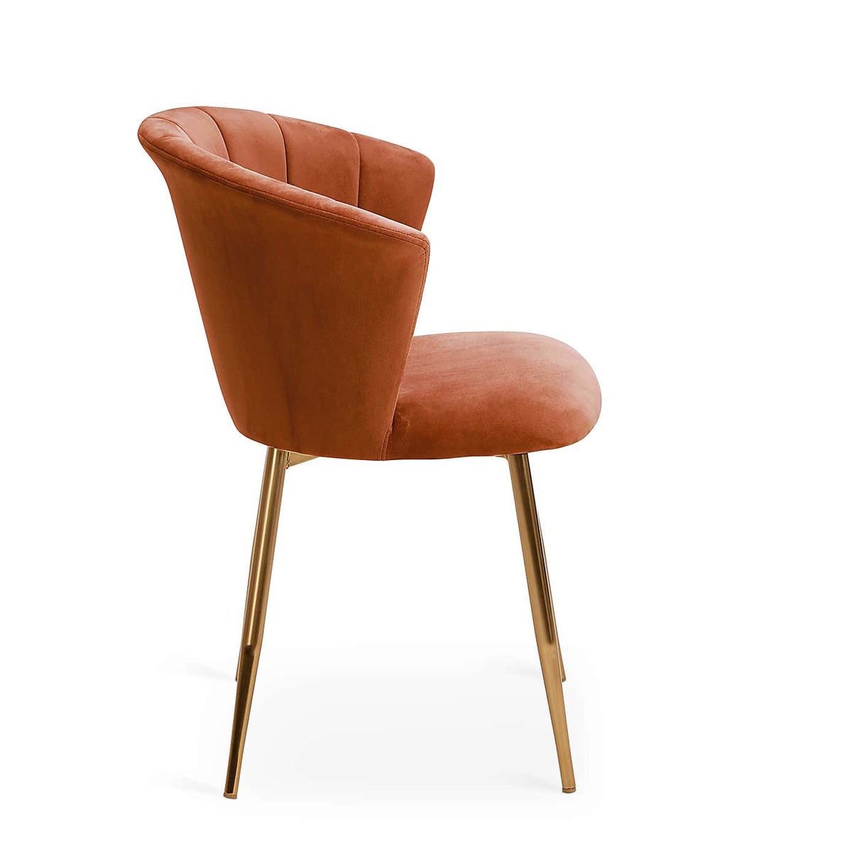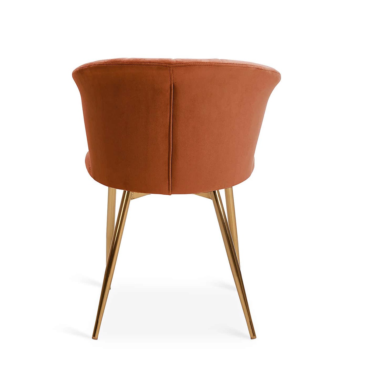 Finished in a rich velvet in a burnt orange colourway, the Kendall chair features a generously proportioned, foam-filled seat for added comfort. Inspired by traditional art deco designs, this stylish chair is crafted with a pleated, curved shell back and gold-finished metal legs to add a contemporary touch.