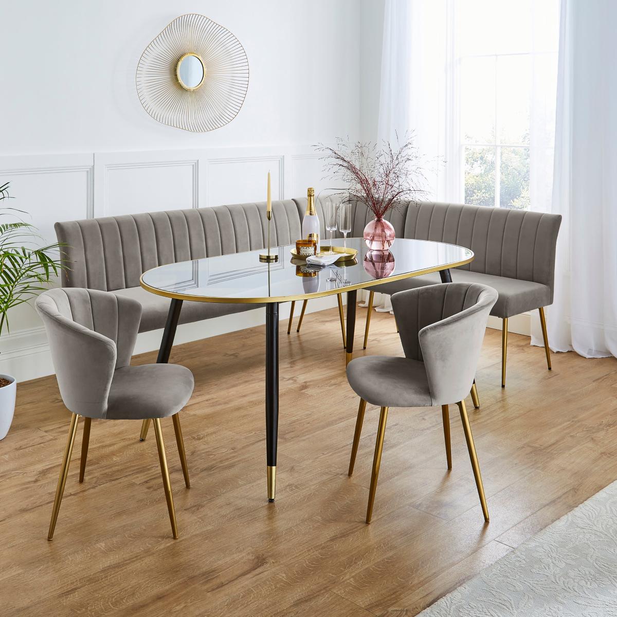 I’m a fan of the Kendall bench for its smart L-shape and soft grey velvet upholstery, which makes even a compact dining corner feel pulled together. The vertical channeling adds subtle texture, so it works equally well in modern Scandi schemes or more polished Art Deco-inspired rooms. To style it, layer in contrasting cushions - think teal or blush - to break up the grey and tie in other accents from your tableware or wall art. Pair with a slim, light-coloured table to keep the corner feeling open, and add a trailing plant or simple mirror nearby to balance the seating area.