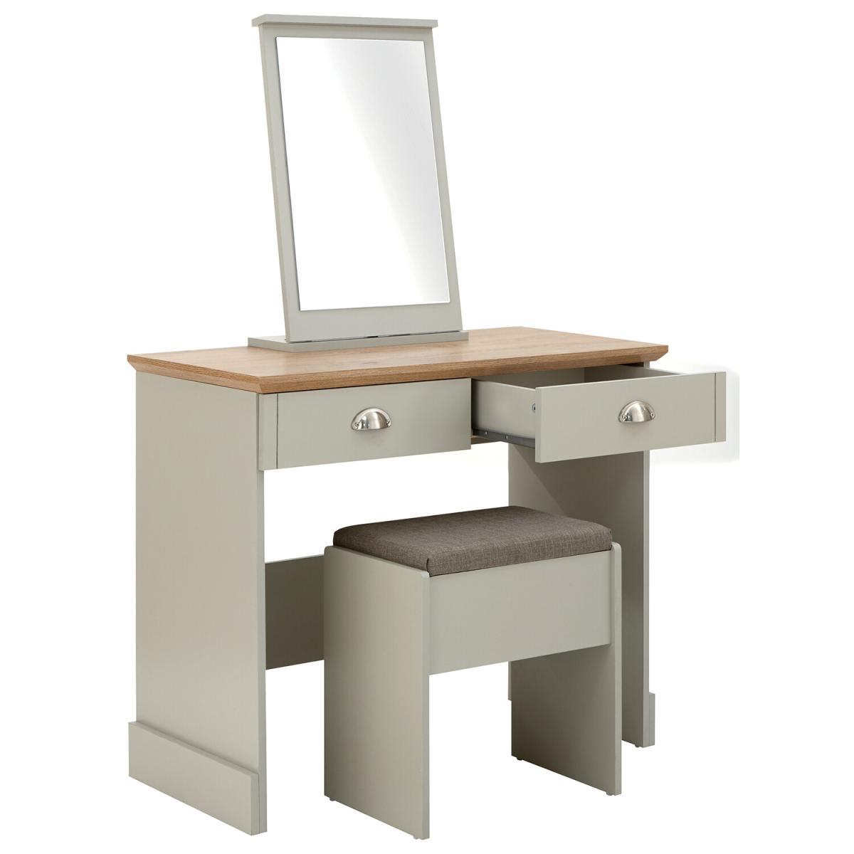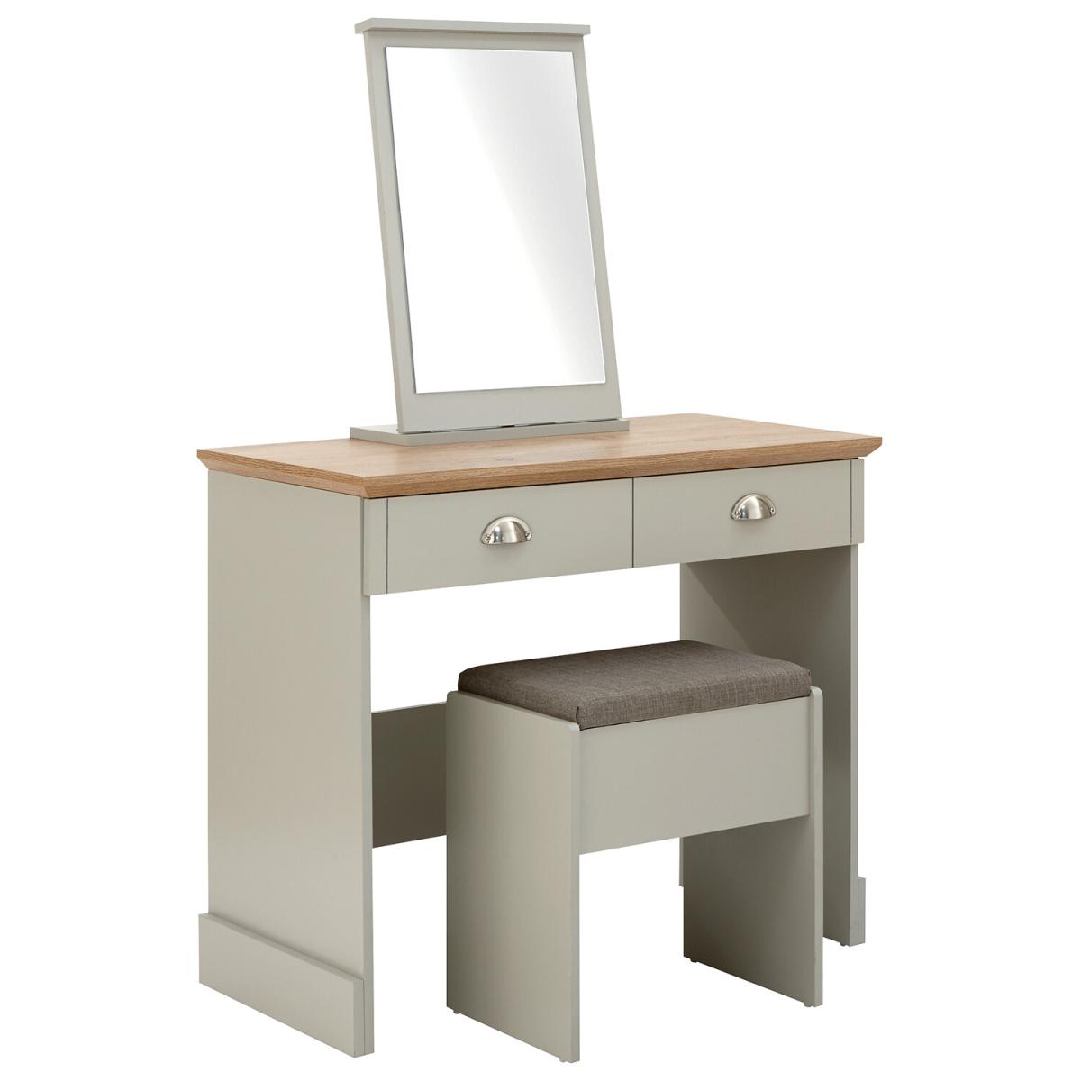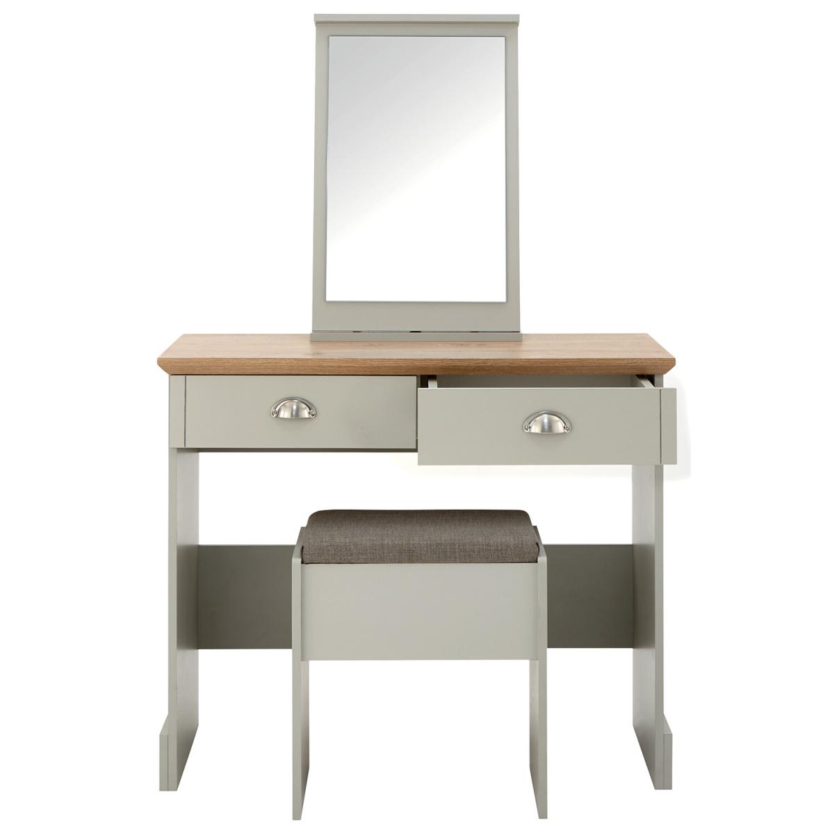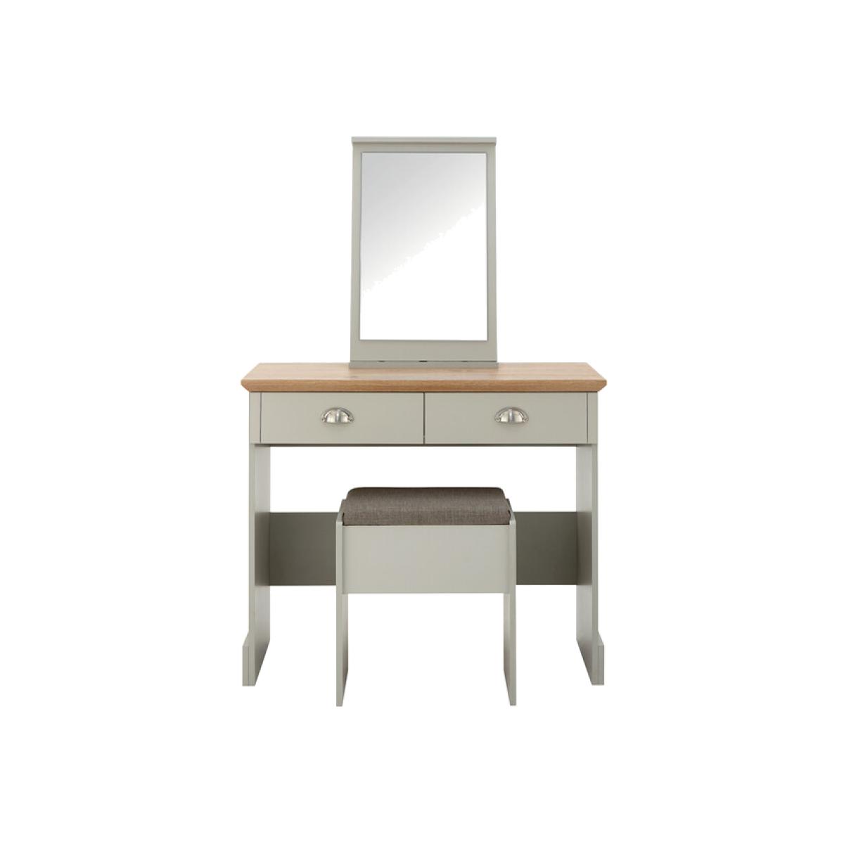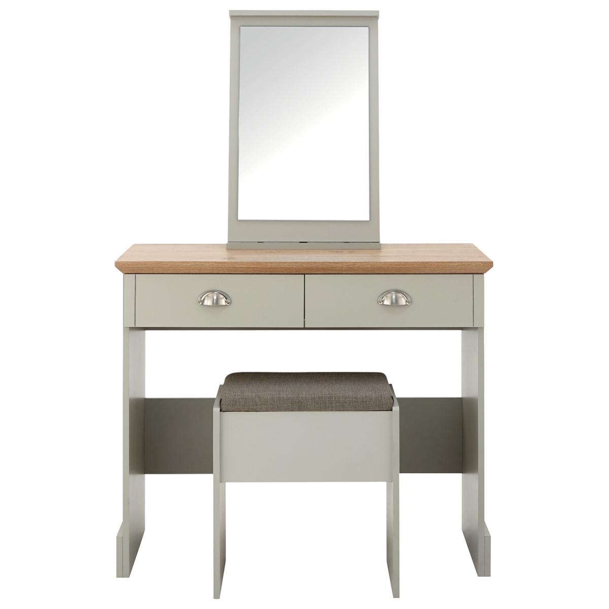 A versatile dressing table is always a smart choice for a bedroom, the Kendall Dressing Table With Stool offers a handy repository for pots and potions and creating a one-stop station for hair and makeup. This cool Kendal set features a console-style table with integrated drawers and oak-effect top plus matching mirror and upholstered stool in soft grey. The stool tucks neatly away when not in use.