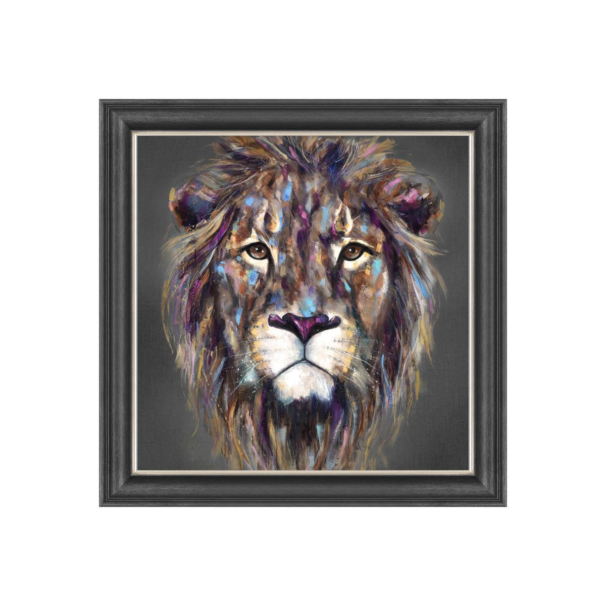 A striking combination of expressive surrealism and roaring colours, the Kendi Framed Picture has a powerful design that’s sure to be a focal point wherever you hang it. Why you'll love it. Modern textured artwork with an eye-catching design. Captivating portrait that captures the majestic spirit of the lion. Reproduced from original artwork by Louise Luton. Hand-embellished on a beautiful linen canvas. Elegantly enclosed in a large dark grey frame with silver detailing. What you need to know. A paper print on an MDF back board. Metal hanging fitting with a nylon cord. Hand-finished with an acrylic gel. Dimensions. Height: 96 cm (38 in). Width: 96 cm (38 in).