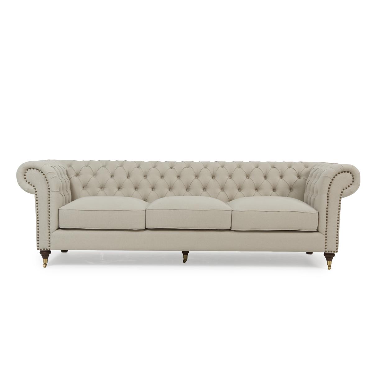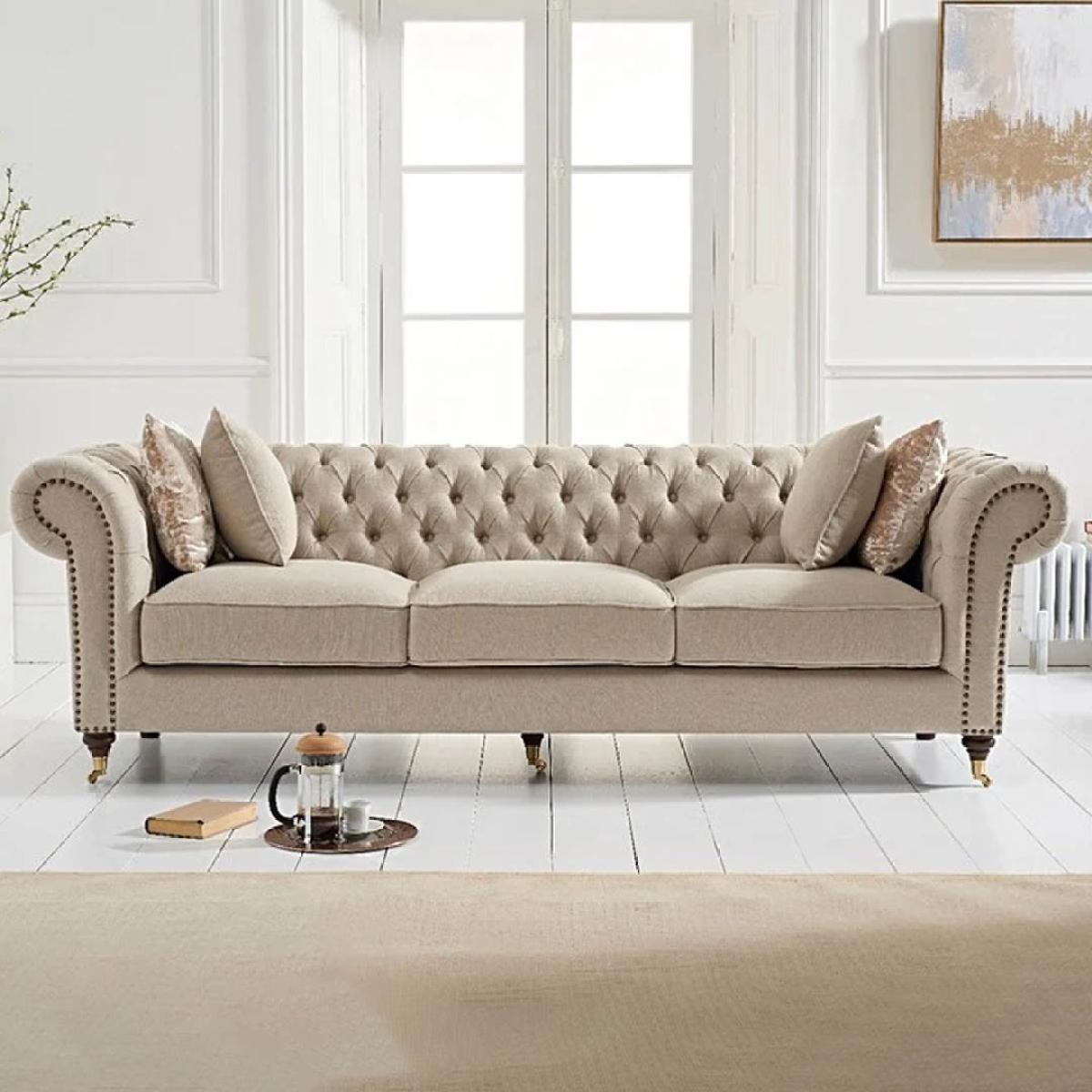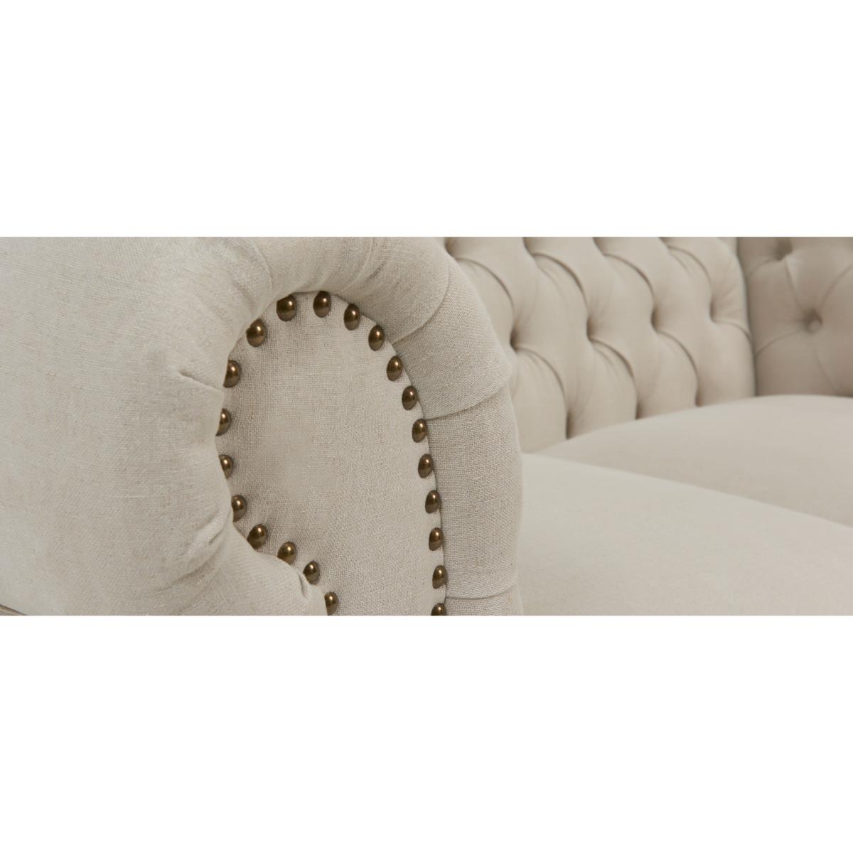 The Kensington sofa is upholstered in smooth cream linen fabric and features an elegant brass stud trim, in traditional Chesterfield-inspired style.