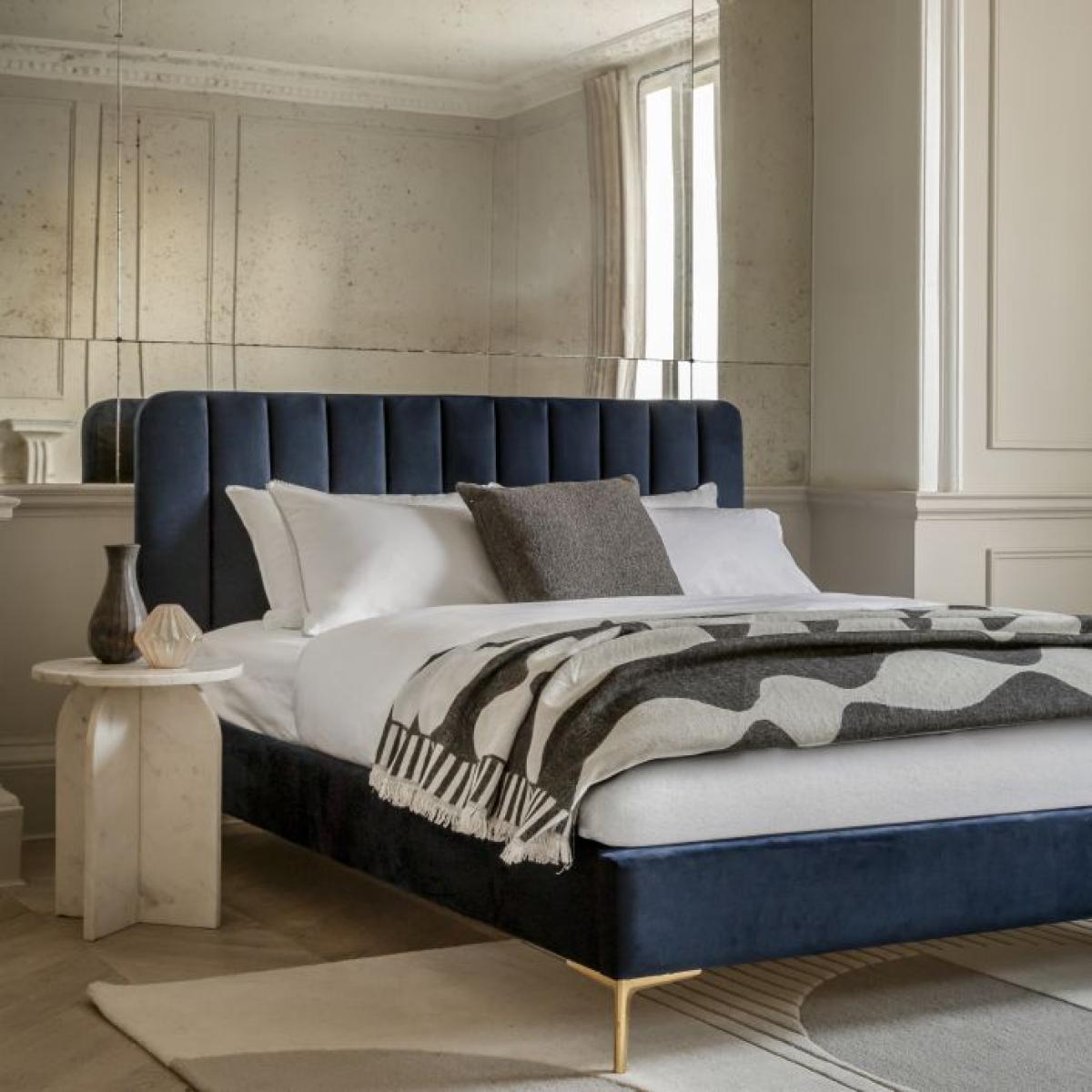 Add a touch of luxe to your bedroom with this lavish double bedstead. Upholstered in dark blue velvet the panelled headboard is cushioned with vertical stitch detailing and is complemented by the slim gold toned metal legs, adding that final touch of luxury. Also available in other sizes and colours.