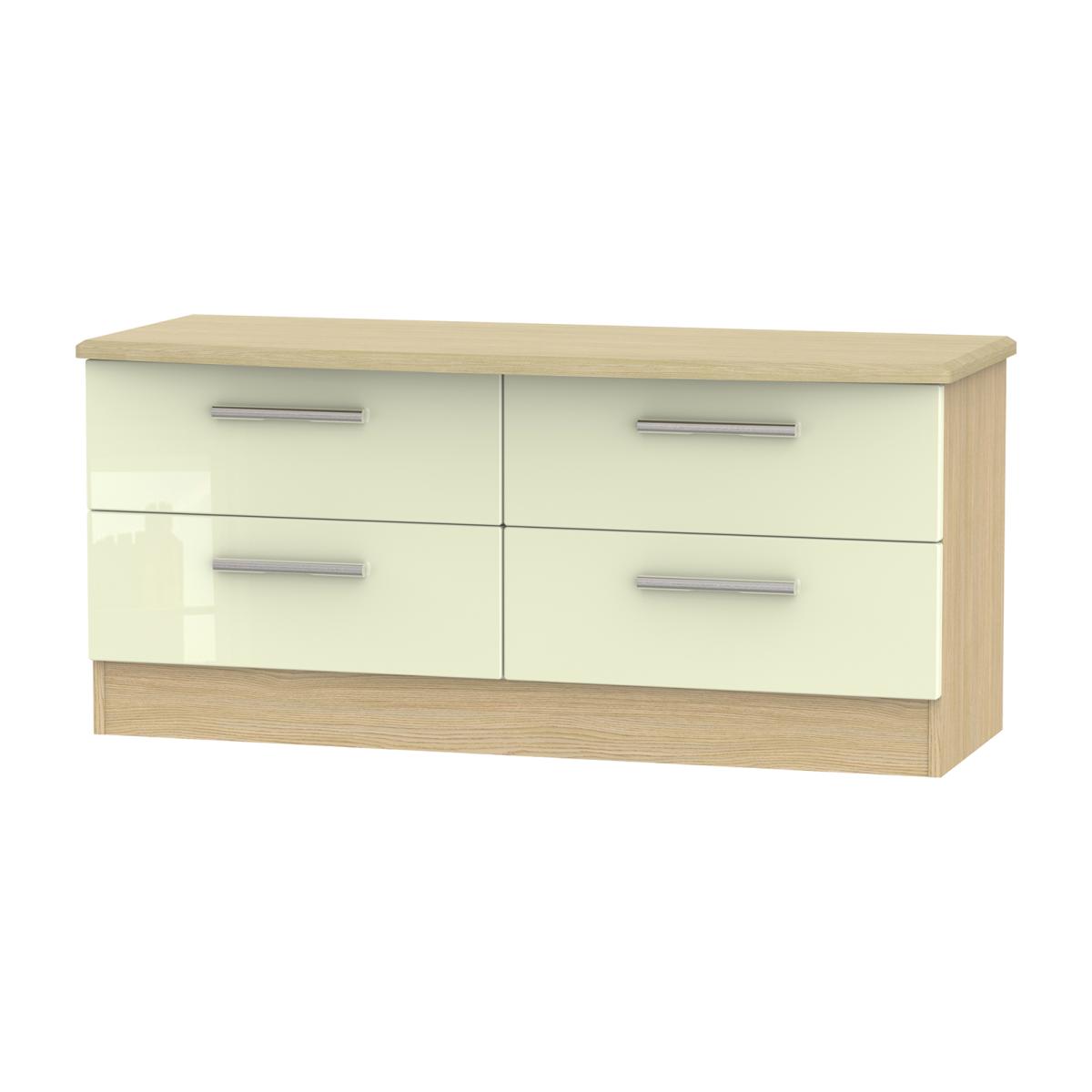 Using a combination of style and practicality, the Kensington Kashmir Four Drawer Bed Box is beautifully crafted with a Kashmir gloss finish to give you spacious storage for everyday use. The sturdy and durable unit is perfect for housing your bed sheets, blankets and garments in the deep drawers, and ideal for placing your favourite ornaments and trinkets on top. The chrome finished metal handles are rounded and slim, adding to the glossy exterior and creating depth and character to the simple design. The minimalist style matches well with modern interior decor, perfect to place at the bottom of your bed, without overpowering your existing furniture.