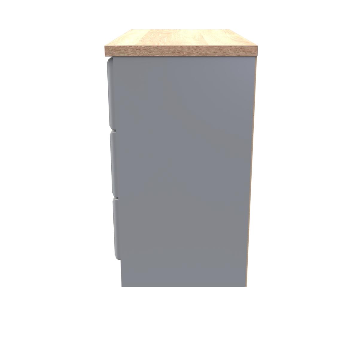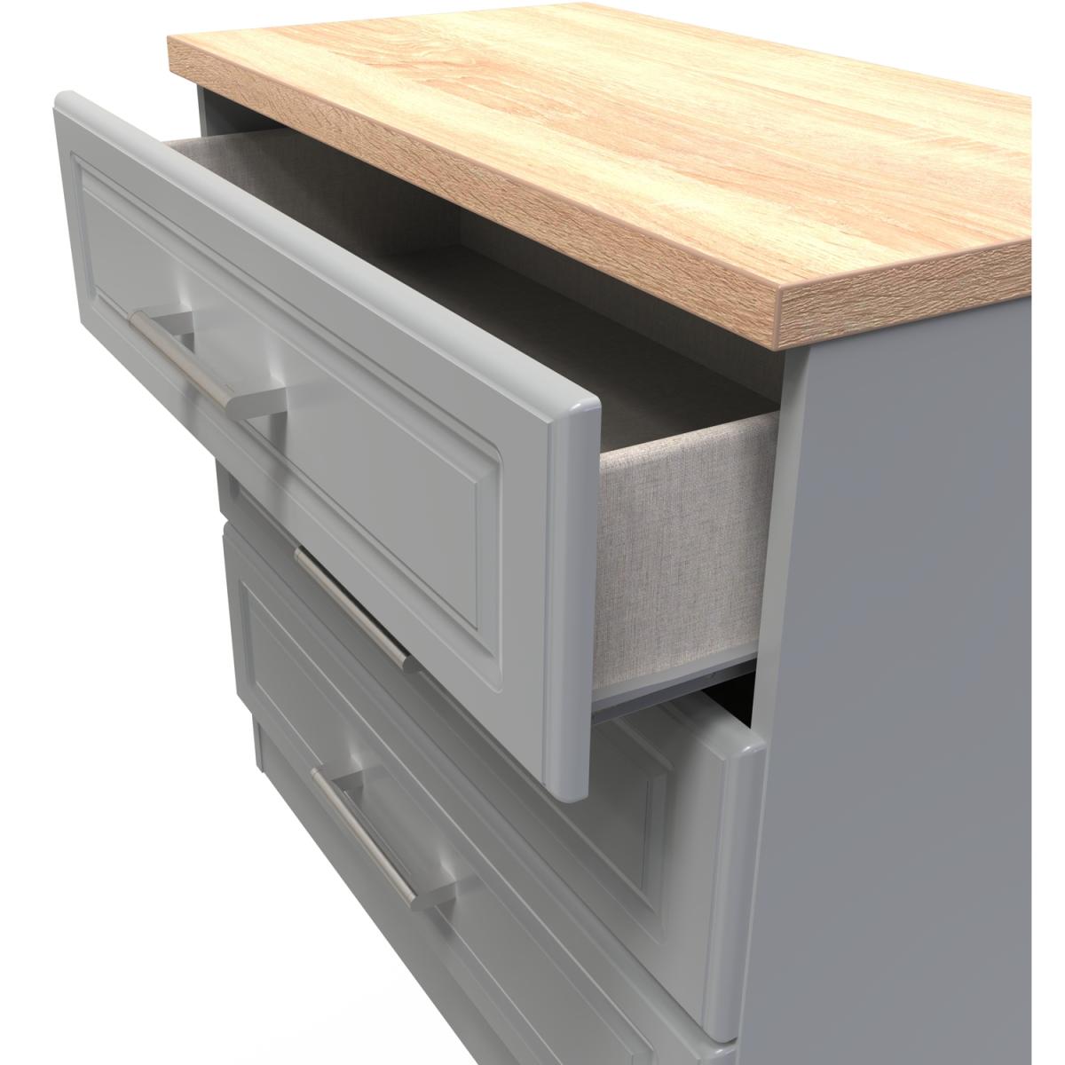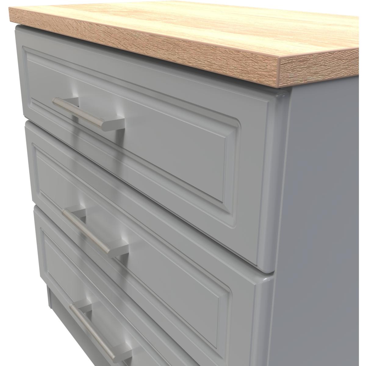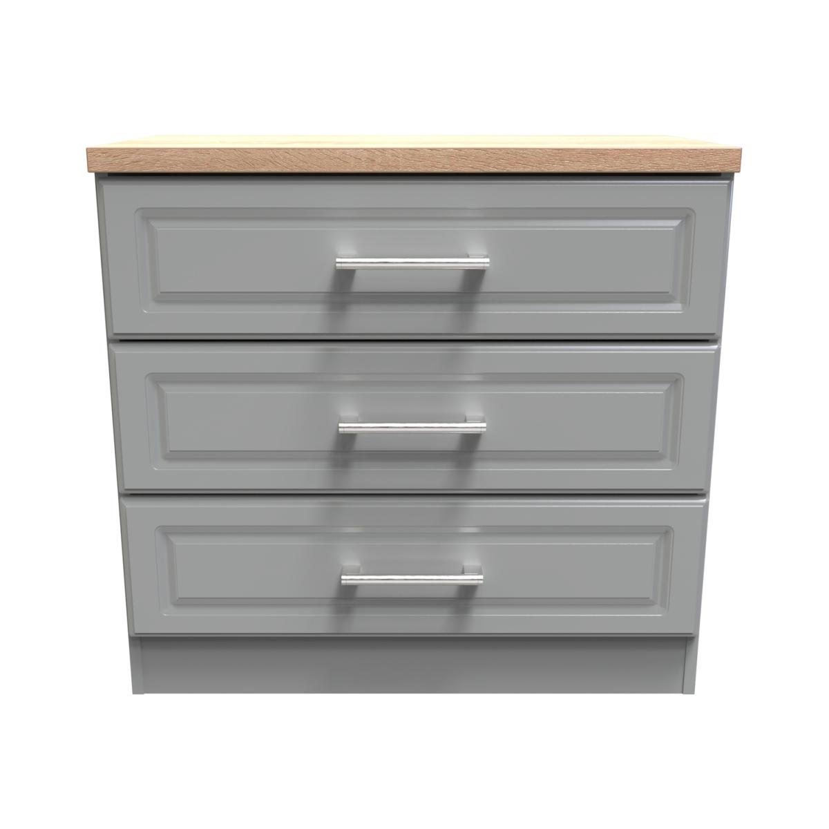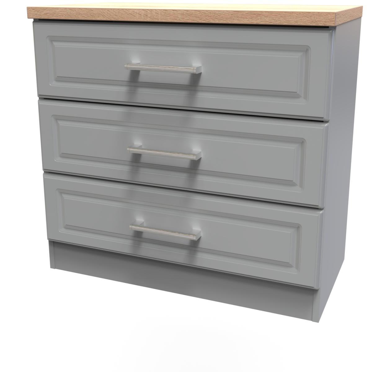 This wide 3 drawer chest of drawers is practical and stylish. Perfect for any home as a free standing storage unit. The Kent range uses traditional edge finishes and wood effect tops, to create a range of classic looking furniture pieces. Contrasting finishes create the tonal variations seen here with brushed steel handle mounted on wood grained fronts. All our furniture is made in the United Kingdom, to the highest quality. It is delivered direct to your location of choice by one of our two man delivery teams, and come full assembled (although legs may be removed to prevent damage in transit).