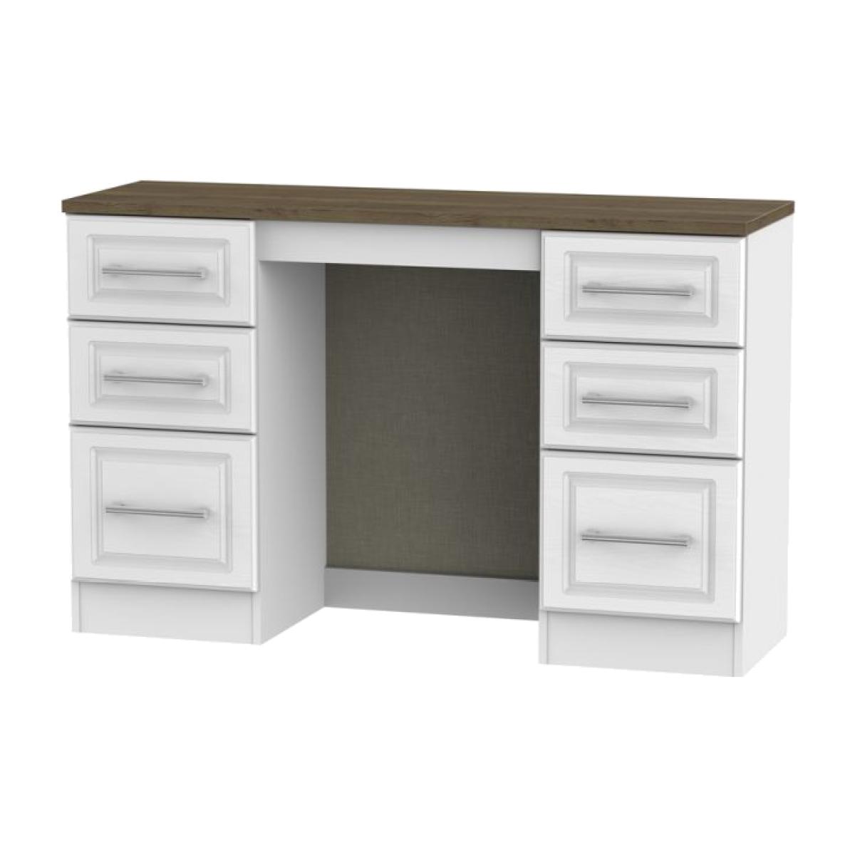 The Kent bedroom furniture range is a fantastic, practical choice for those looking for some hassle-free and attractive furniture. This Kent Kneehole Dressing Table features 6 spacious drawers for storing your bedside belongings or any clothing, with quality drawer runners and a durable, scratch resistant vinyl that ensures its long life. A linen effect on the inside of the drawers means your items are protected too. Features:.