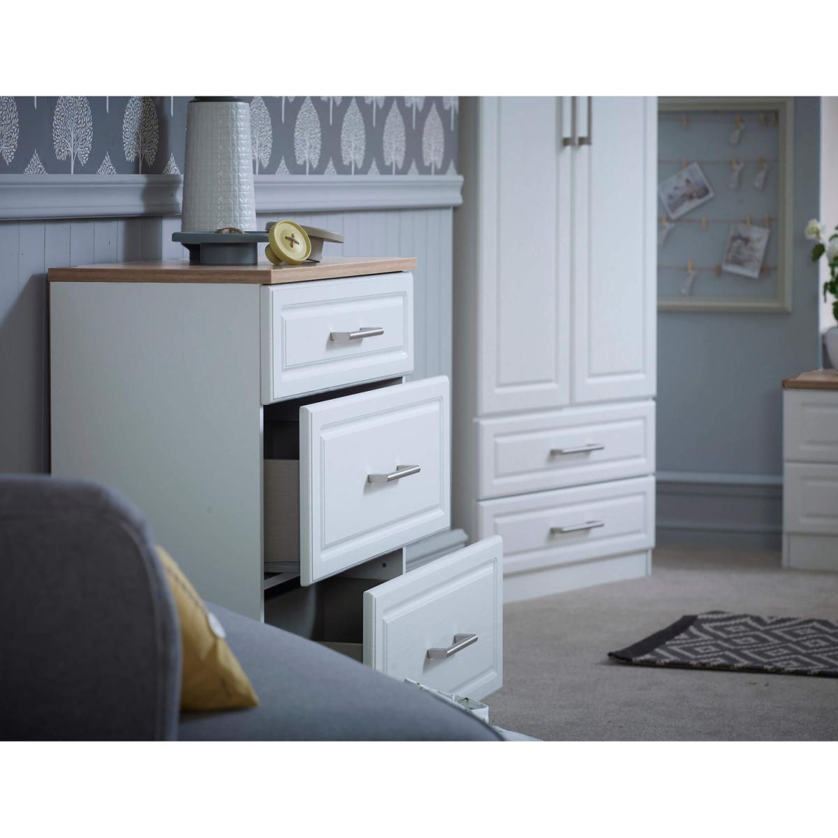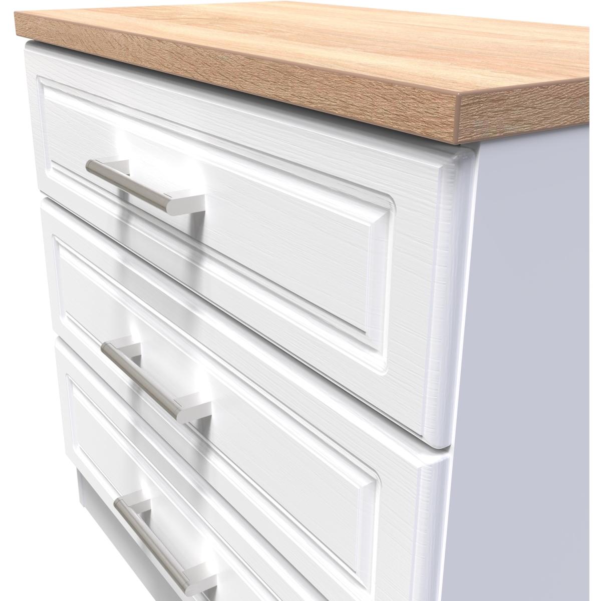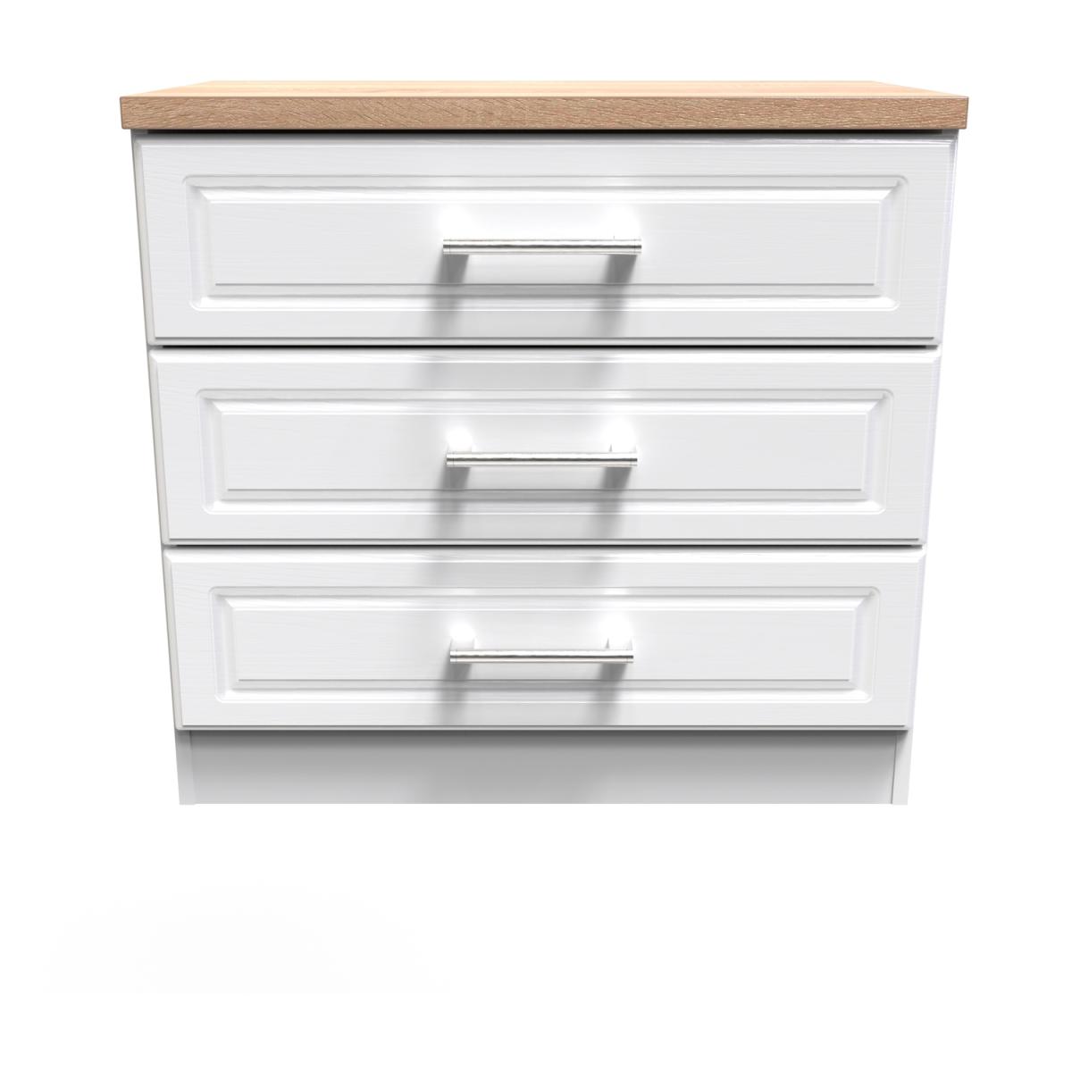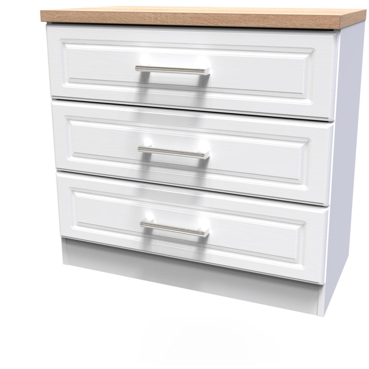 This wide 3 drawer chest of drawers is practical and stylish. Perfect for any home as a free standing storage unit. The Kent range uses traditional edge finishes and wood effect tops, to create a range of classic looking furniture pieces. Contrasting finishes create the tonal variations seen here with brushed steel handle mounted on wood grained fronts. All our furniture is made in the United Kingdom, to the highest quality. It is delivered direct to your location of choice by one of our two man delivery teams, and come full assembled (although legs may be removed to prevent damage in transit).