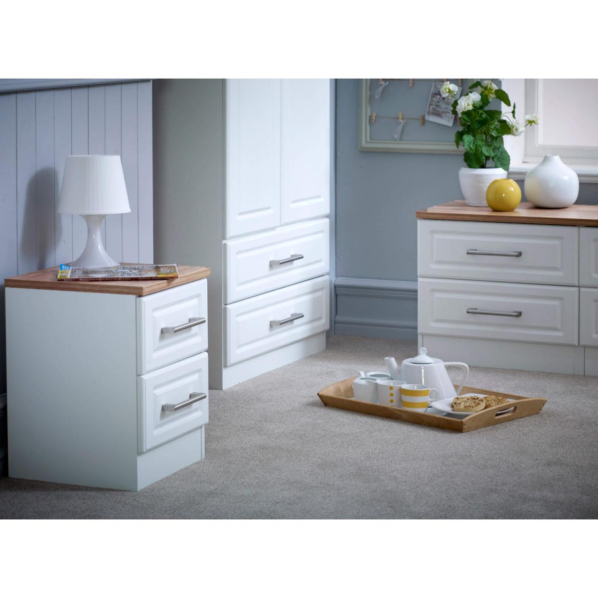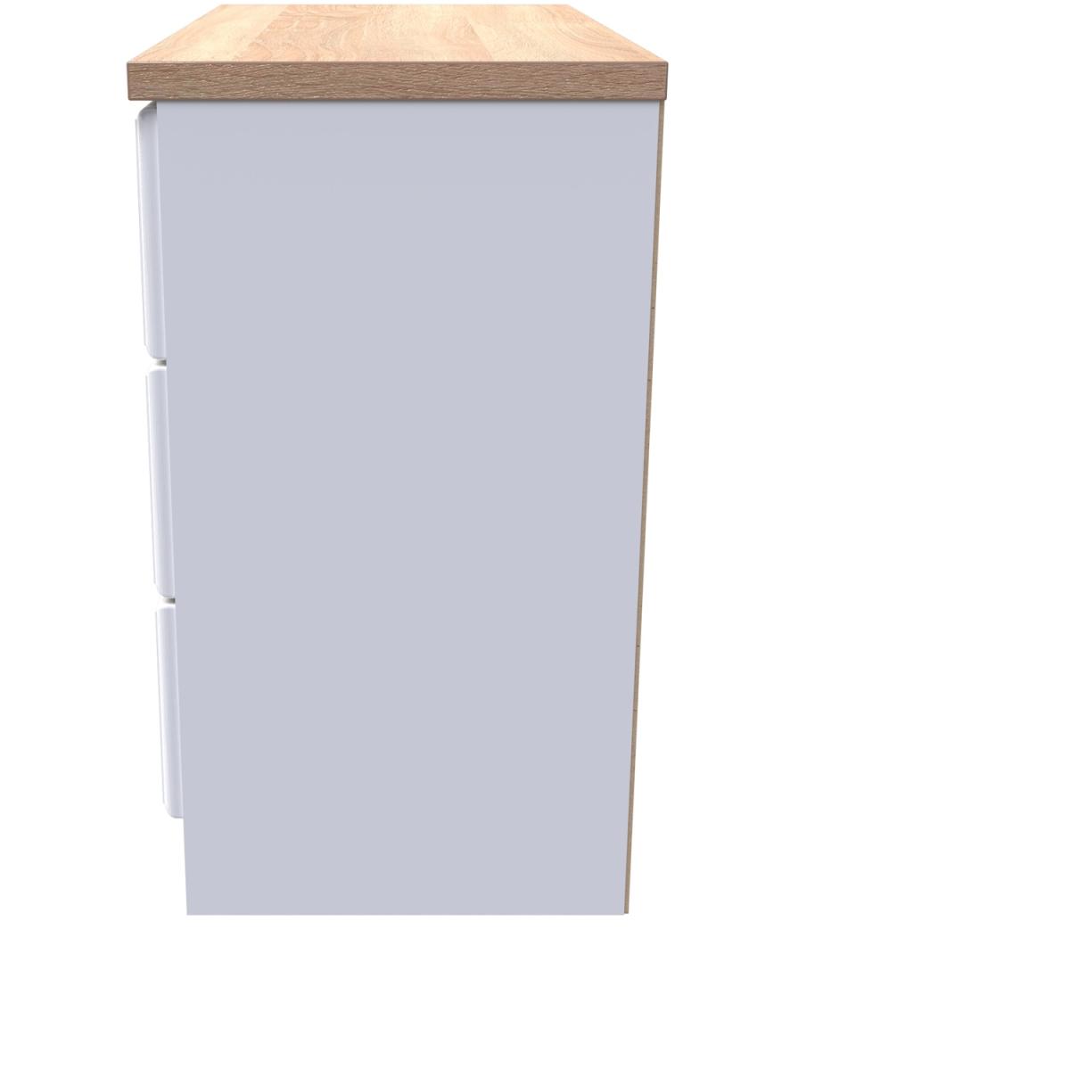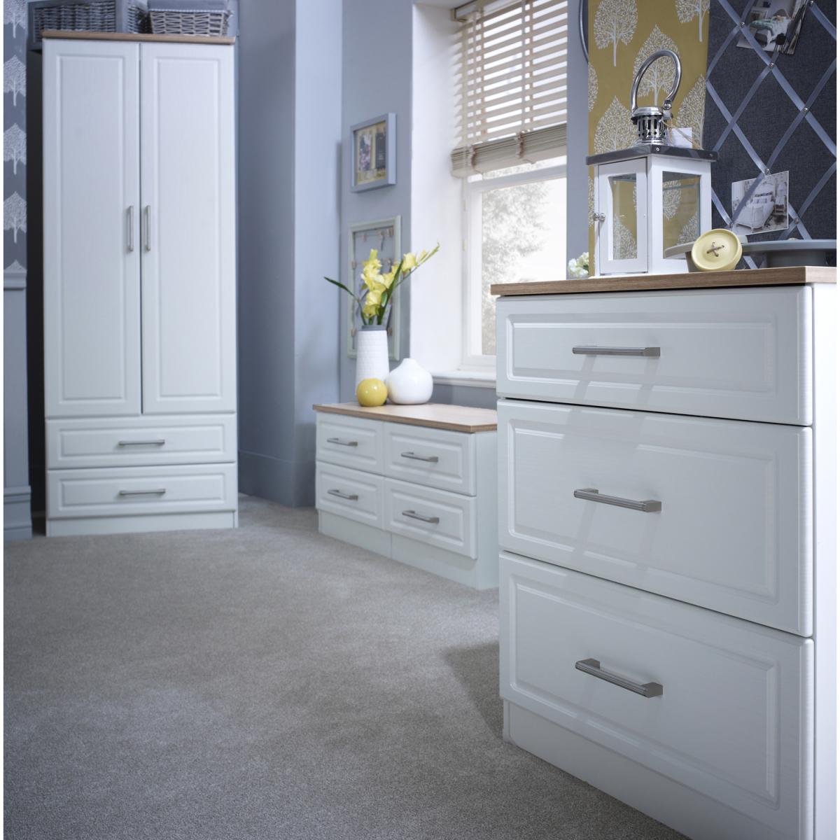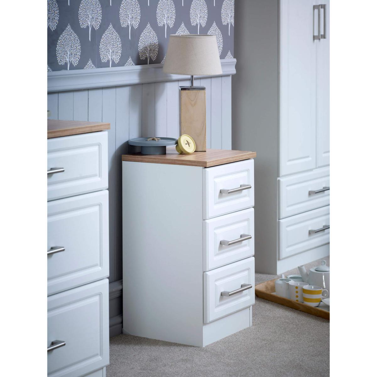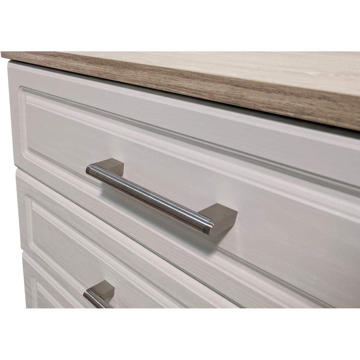 This wide 3 drawer chest of drawers is practical and stylish. Perfect for any home as a free standing storage unit. The Kent range uses traditional edge finishes and wood effect tops, to create a range of classic looking furniture pieces. Contrasting finishes create the tonal variations seen here with brushed steel handle mounted on wood grained fronts. All our furniture is made in the United Kingdom, to the highest quality. It is delivered direct to your location of choice by one of our two man delivery teams, and come full assembled (although legs may be removed to prevent damage in transit).
