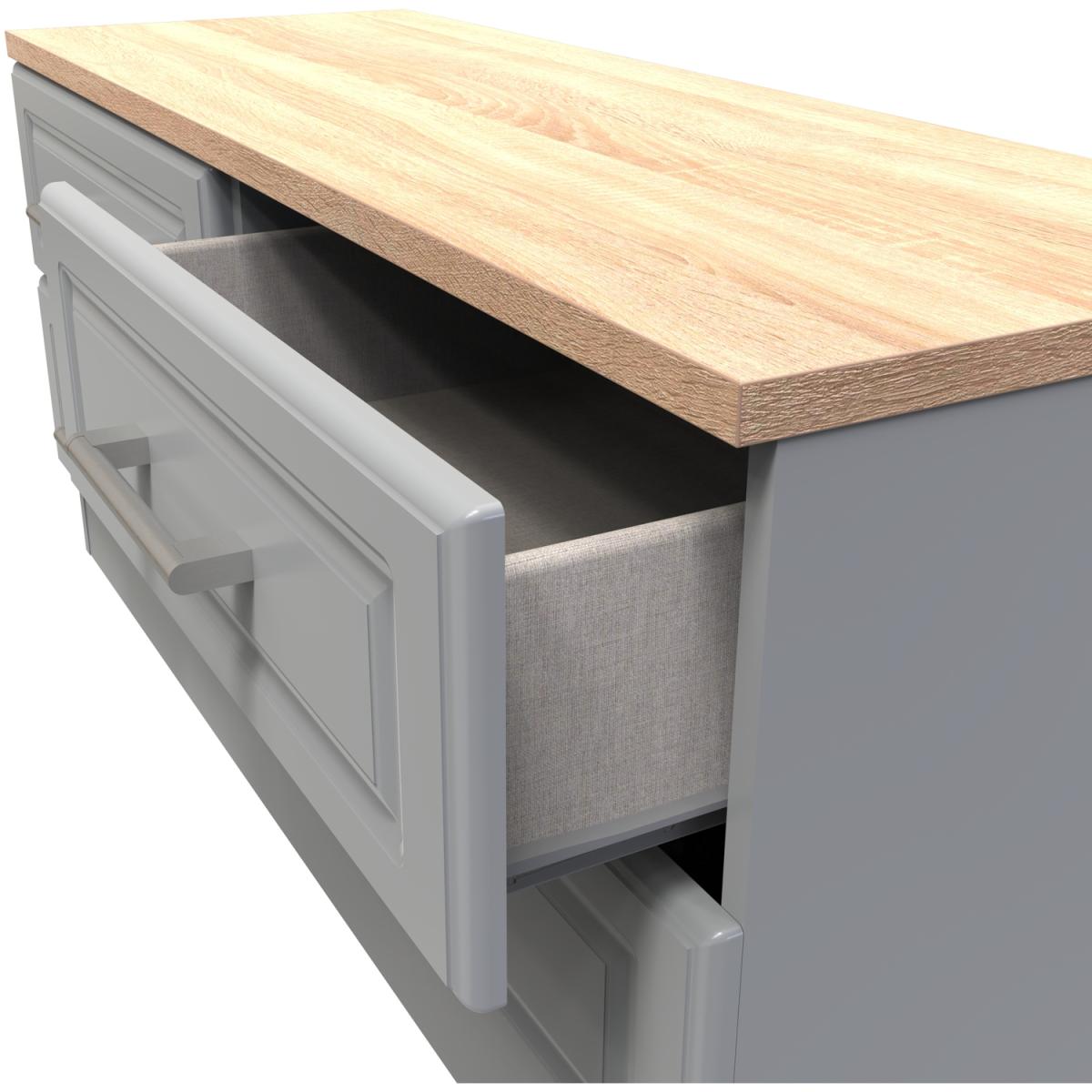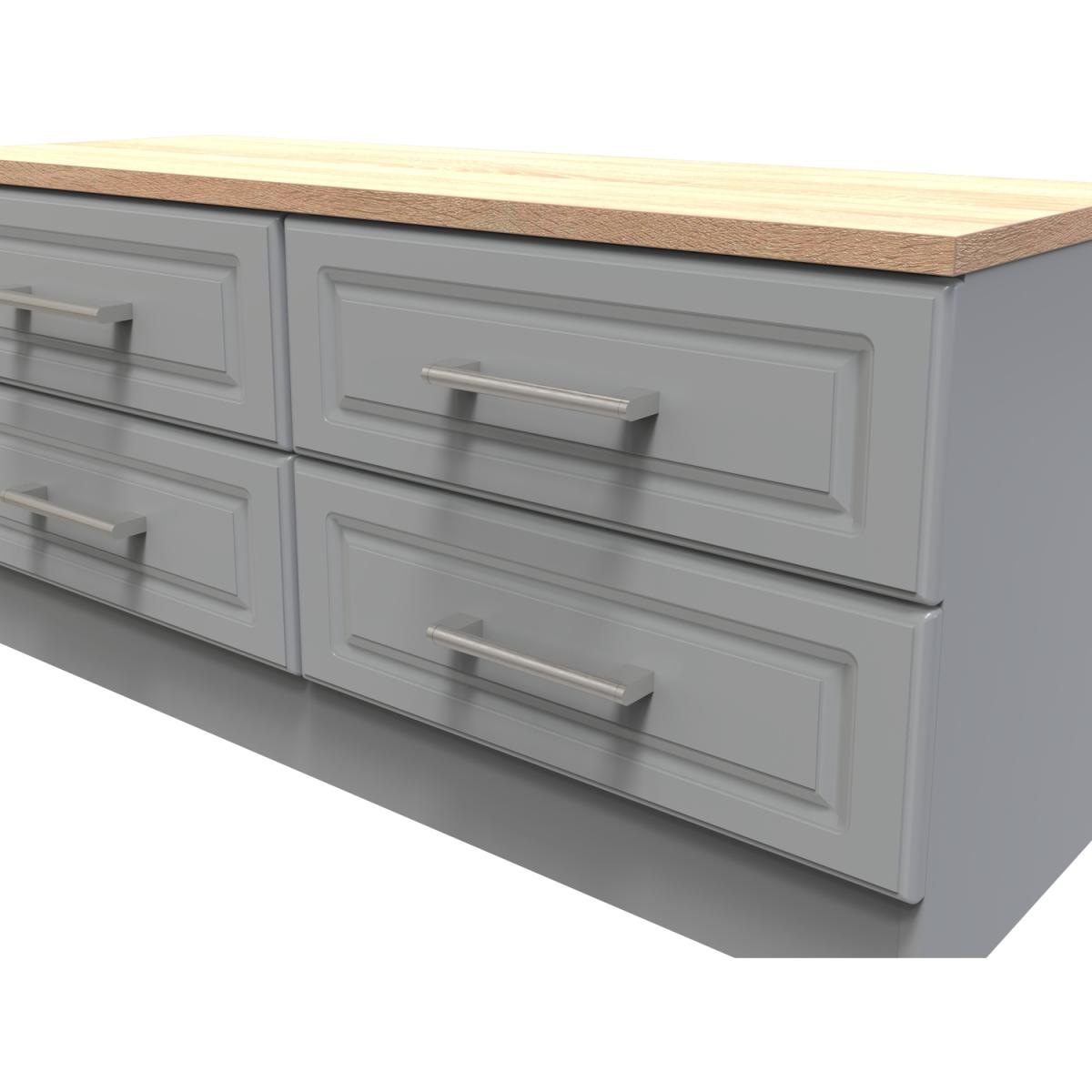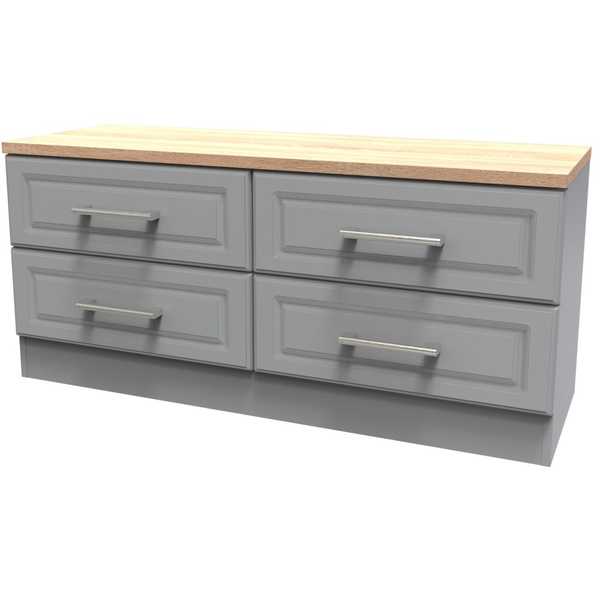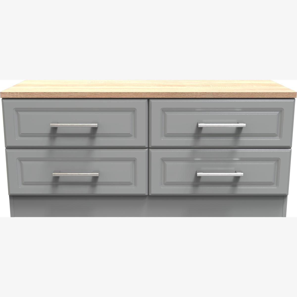 A large 4 drawer bed box. A Perfect storage solution for any room (not just the end of your bed). Could also be used as a low level TVMedia stand The Kent range uses traditional edge finishes and wood effect tops, to create a range of classic looking furniture pieces. Contrasting finishes create the tonal variations seen here with brushed steel handle mounted on wood grained fronts. All our furniture is made in the United Kingdom, to the highest quality. It is delivered direct to your location of choice by one of our two man delivery teams, and come full assembled (although legs may be removed to prevent damage in transit).