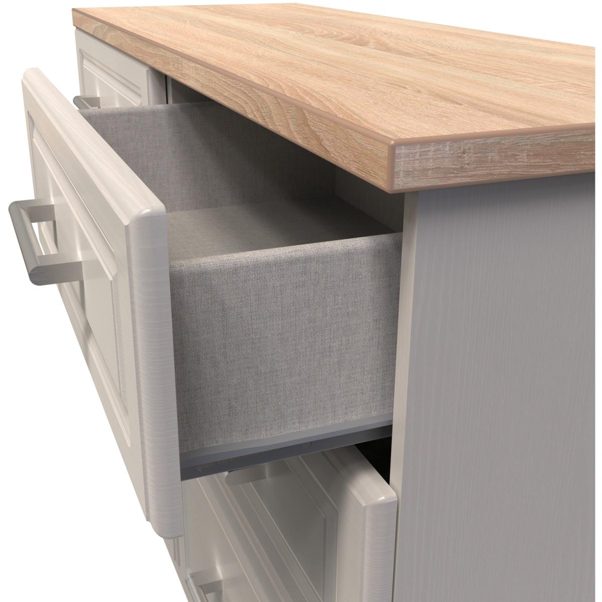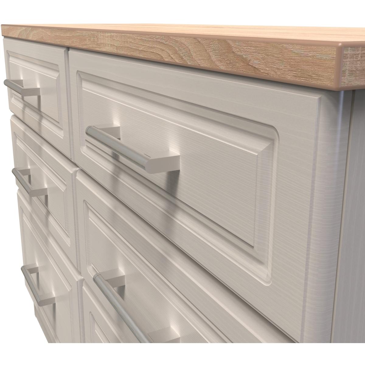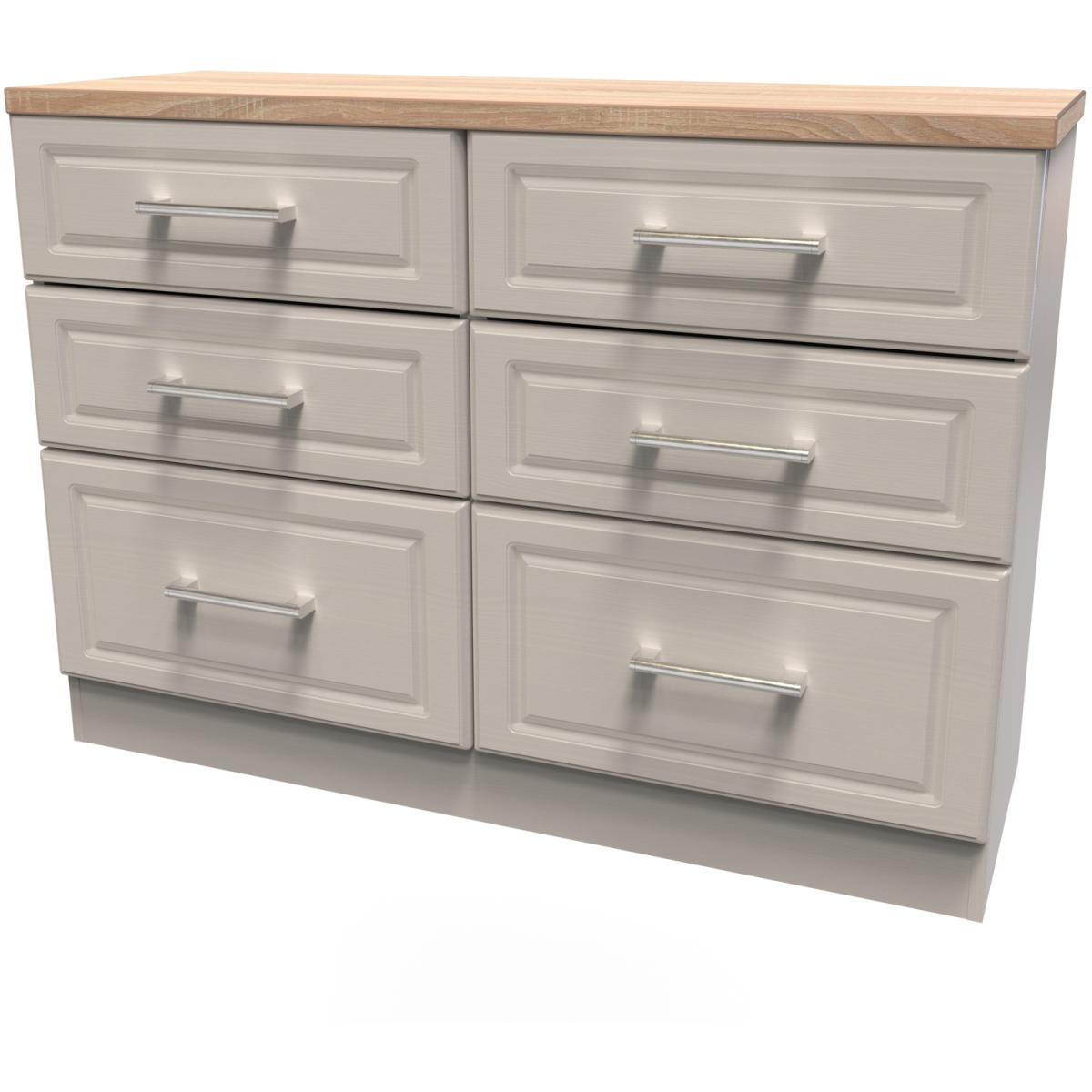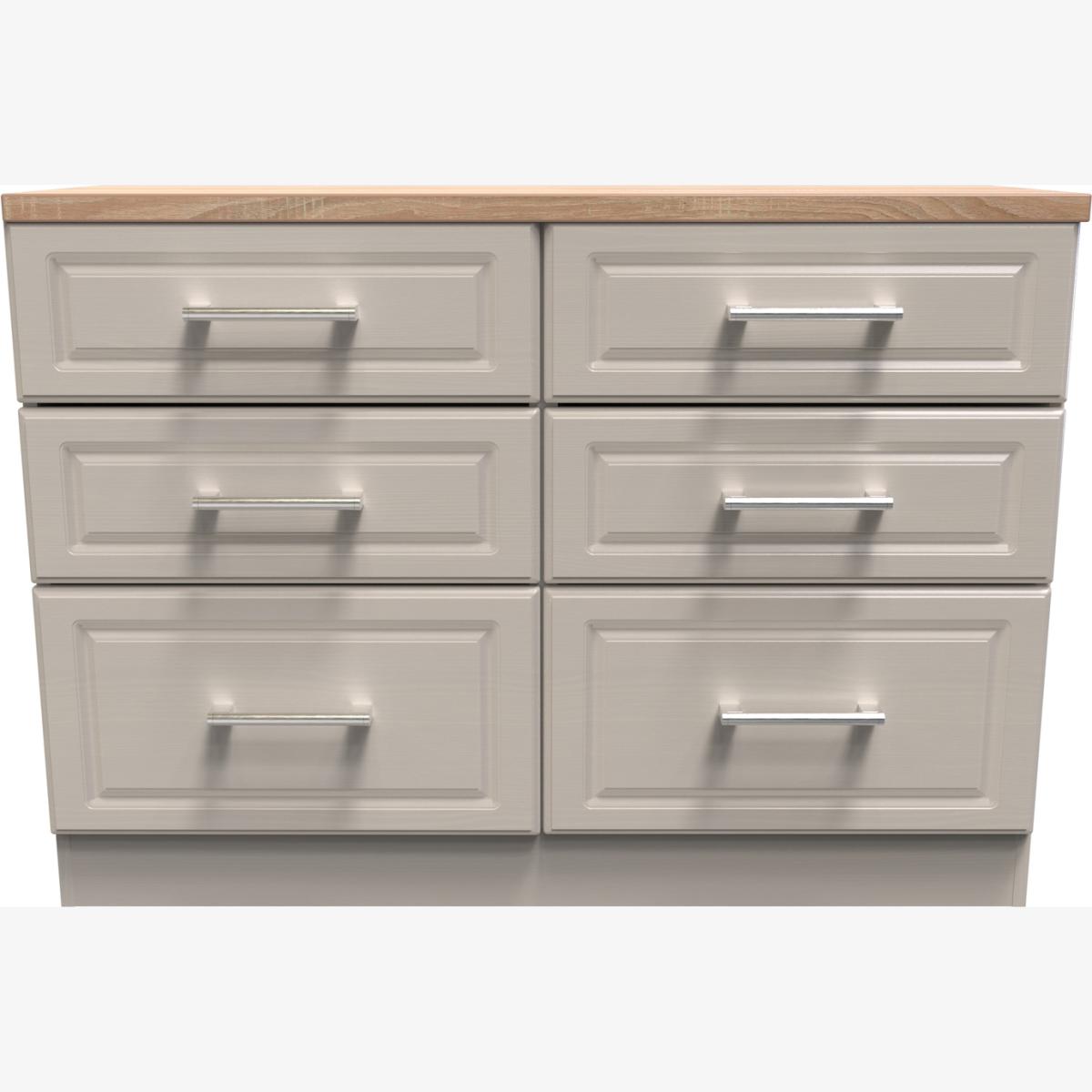 This double width 6 drawer chest of drawers is practical and stylish. Perfect for any home as a free standing storage unit. The Kent range uses traditional edge finishes and wood effect tops, to create a range of classic looking furniture pieces. Contrasting finishes create the tonal variations seen here with brushed steel handle mounted on wood grained fronts. All our furniture is made in the United Kingdom, to the highest quality. It is delivered direct to your location of choice by one of our two man delivery teams, and come full assembled (although legs may be removed to prevent damage in transit).