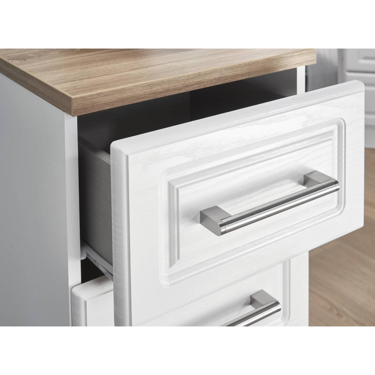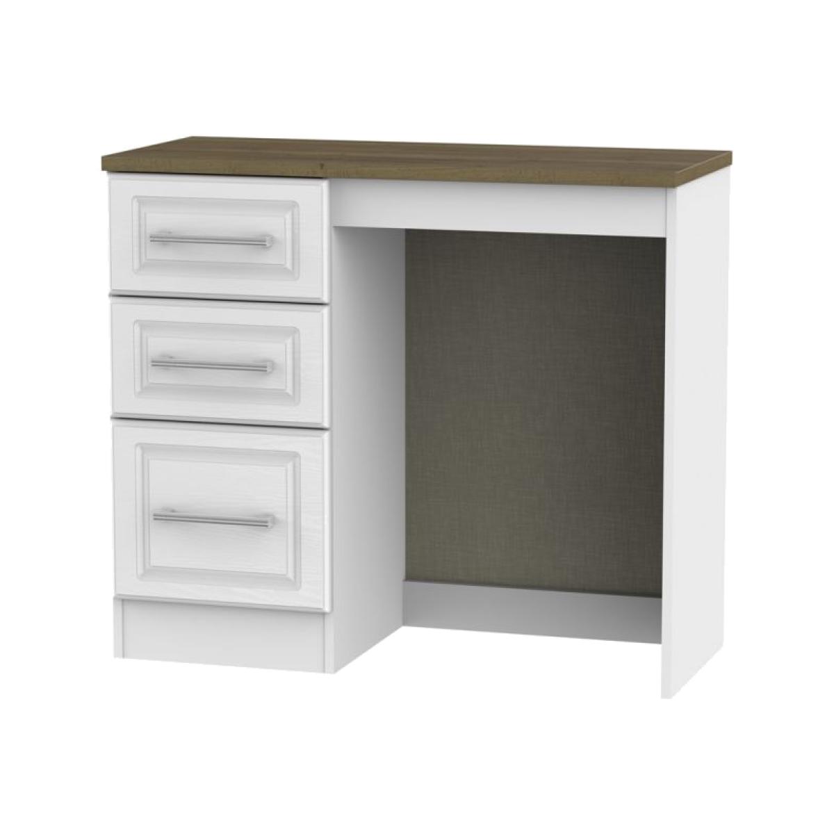 The Kent bedroom furniture range is a fantastic, practical choice for those looking for some hassle-free and attractive furniture. This Kent Vanity Dressing Table features 3 spacious drawers for storing your bedside belongings or any clothing, with quality drawer runners and a durable, scratch resistant vinyl that ensures its long life. A linen effect on the inside of the drawers means your items are protected too. Features: Ready assembled Dimensions: 79.5cm H x 93cm W x 41.5cm D Available in a white ash and oak top finish Metal handles 3 spacious, linen lined drawers  British made