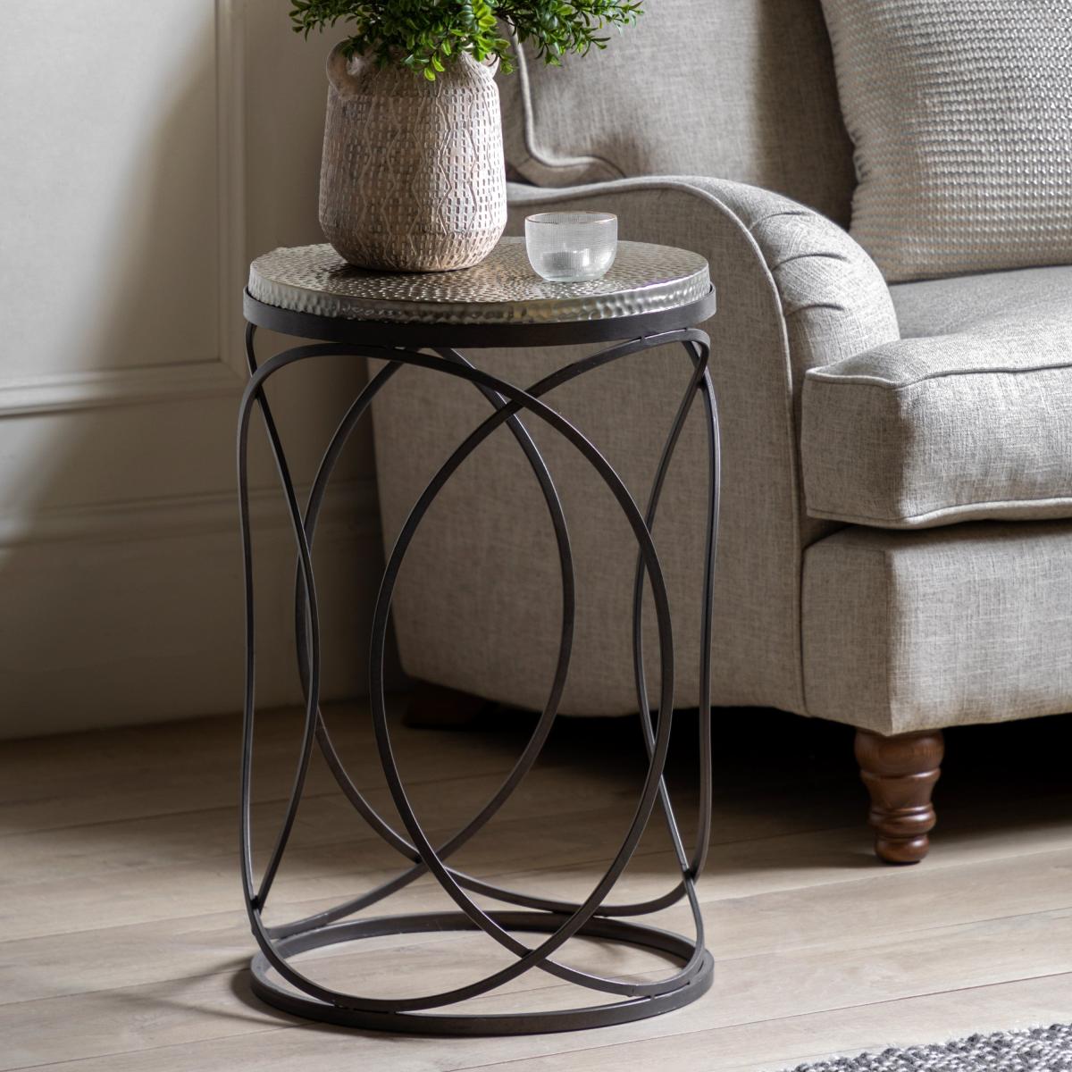 * Stylish and practical* Gold hammered table top* Clean cut metal legs* Curved spiral design* Cool and industrial look A stylish and practical side table with a gold hammered table top and clean cut metal legs in a curved spiral design, adding a cool and industrial look to your interior.