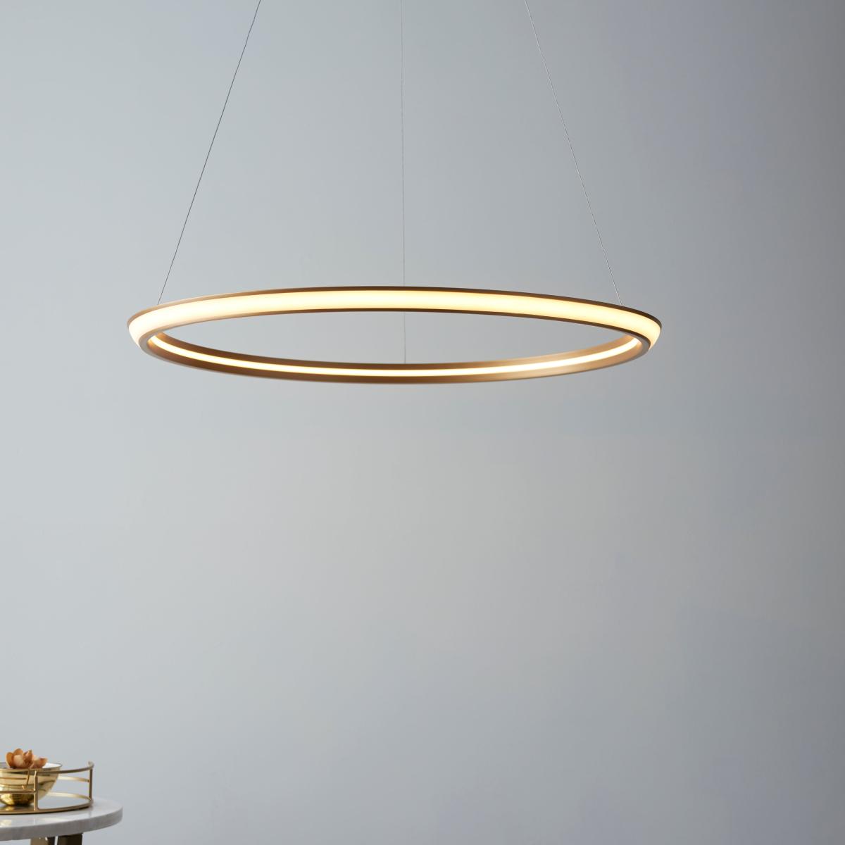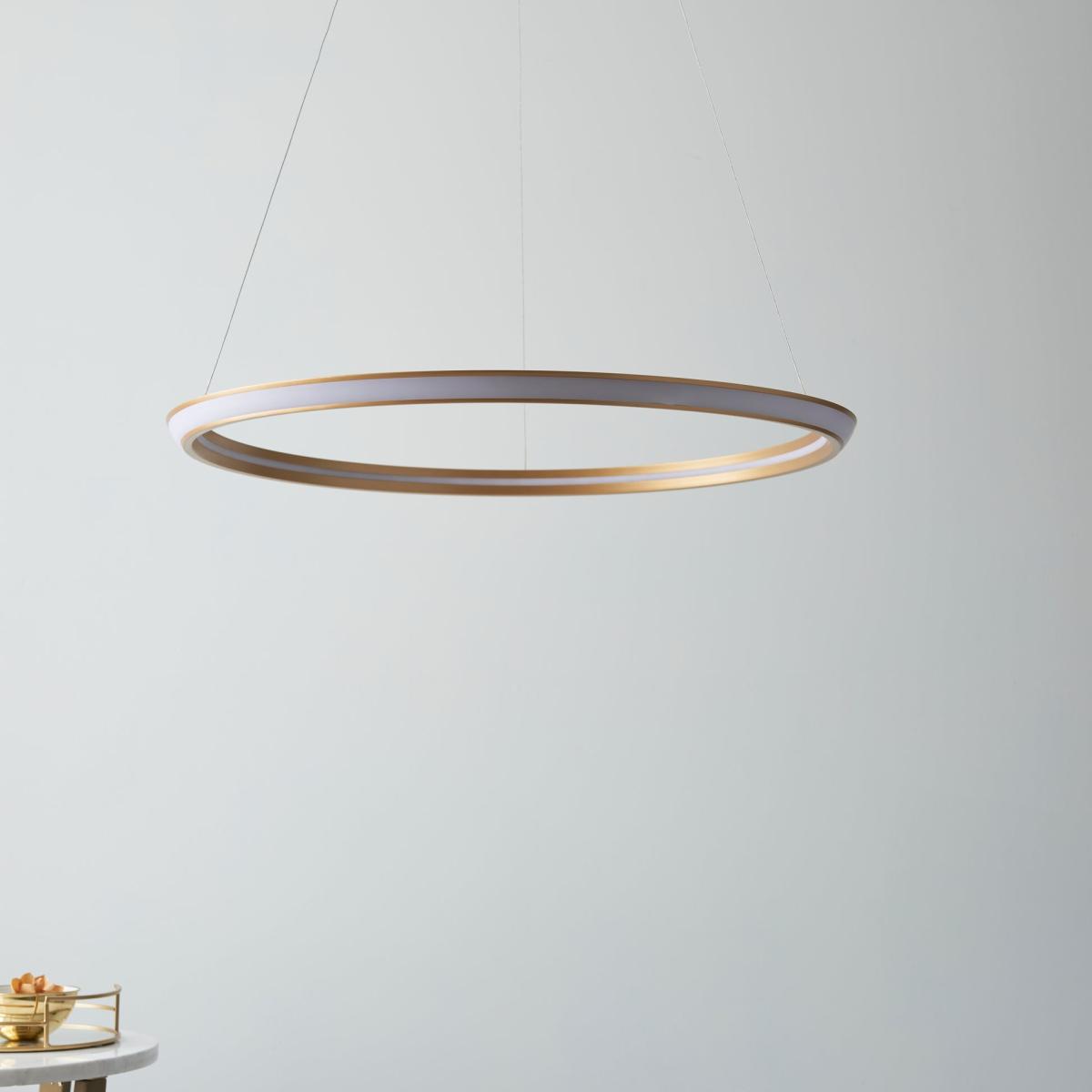 Simple, elegant and modern. This understated ceiling pendant scores high in the style stakes offering a beautiful level of light in this delicate gold ring design. The luxurious, high quality gold finish will perfectly compliment your interiors while the Integrated LED removes the need for changing light bulbs for over 3 years! Why choose LED? Not only is it better for the enviroment to switch to LED lighting, it saves you money on energy bills too costing up to 75% less to run than standard light fittings. Simple, elegant and modern. This understated ceiling pendant scores high in the style stakes offering a beautiful level of light in this delicate gold ring design. The luxurious, high quality gold finish will perfectly compliment your interiors while the Integrated LED removes the need for changing light bulbs for over 3 years! Why choose LED? Not only is it better for the enviroment to switch to LED lighting, it saves you money on energy bills too costing up to 75% less to run than standard light fittings.