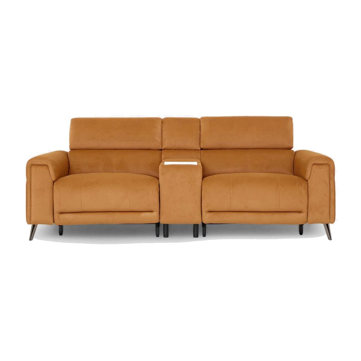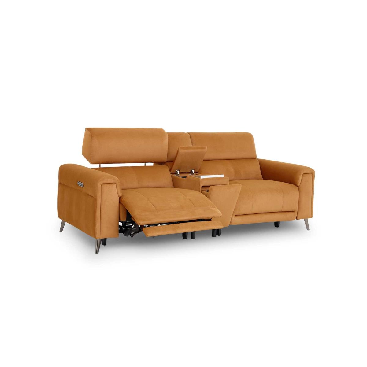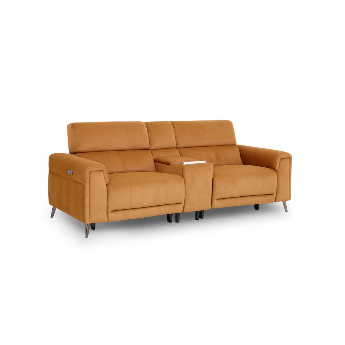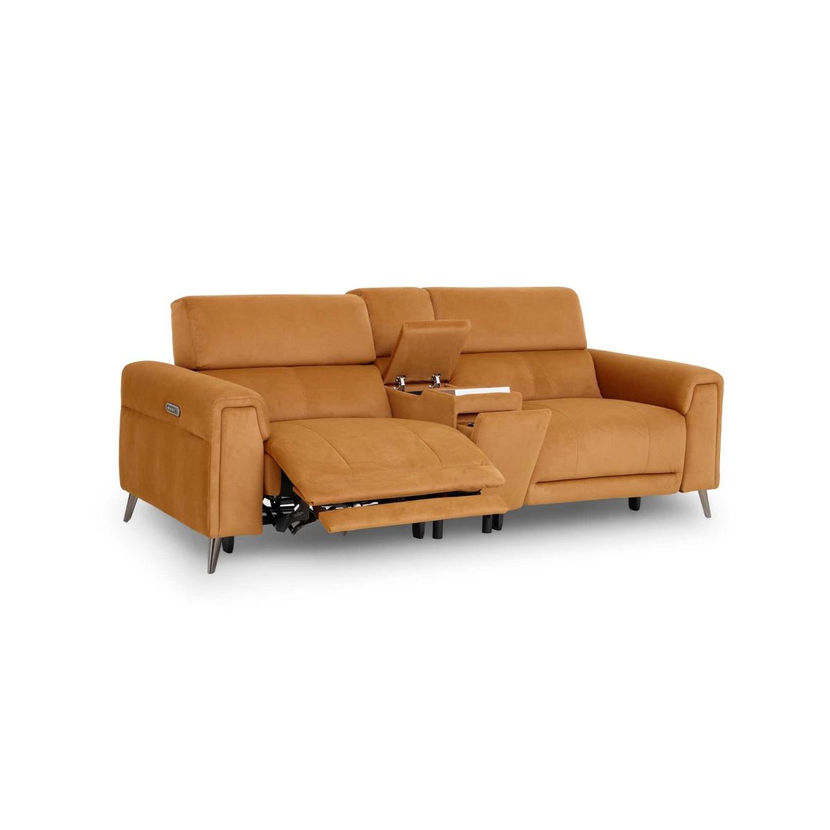 Elevate your living space with the Orange Fabric Power Recliner 2.5 Seater Sofa - a bold blend of comfort, innovation, and modern style. Wrapped in a striking orange fabric, this sofa instantly brightens any room while offering indulgent features designed for pure relaxation. Experience power reclining with adjustable head tilt, lumbar support, heating, and gentle vibration for a spa-like feel at home. A smart middle wedge transforms into a table with a built-in screen, speaker, and USB-C charging, making it perfect for work or entertainment. Plush cushions with pocket springs and foam deliver balanced softness and long-lasting support, while the solid pine frame and sleek metal legs ensure enduring strength. More than a sofa, it is a lifestyle upgrade.