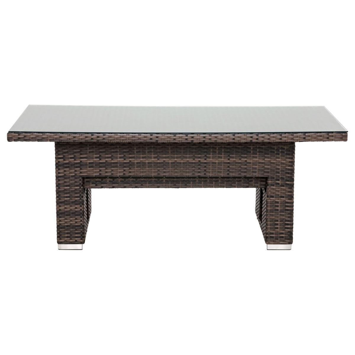 Design. With clean lines, understated design and a rich two-tone weave, the Kersey garden dining set brings sophisticated style to any outdoor area. A brilliant feature that is sure to come in handy, the table contains a mechanism which allows it to transition easily from a casual low level to a raised height ideal for meals al fresco. A comfortable experience is guaranteed atop foam and fibre cushioned seats, and three compact stools provide flexible options for additional guests. Exceptional in quality, the handwoven rattan surfaces display beautiful textures that revive both contemporary and traditional spaces, whilst the Kersey's warm colour palette enhances natural surroundings.