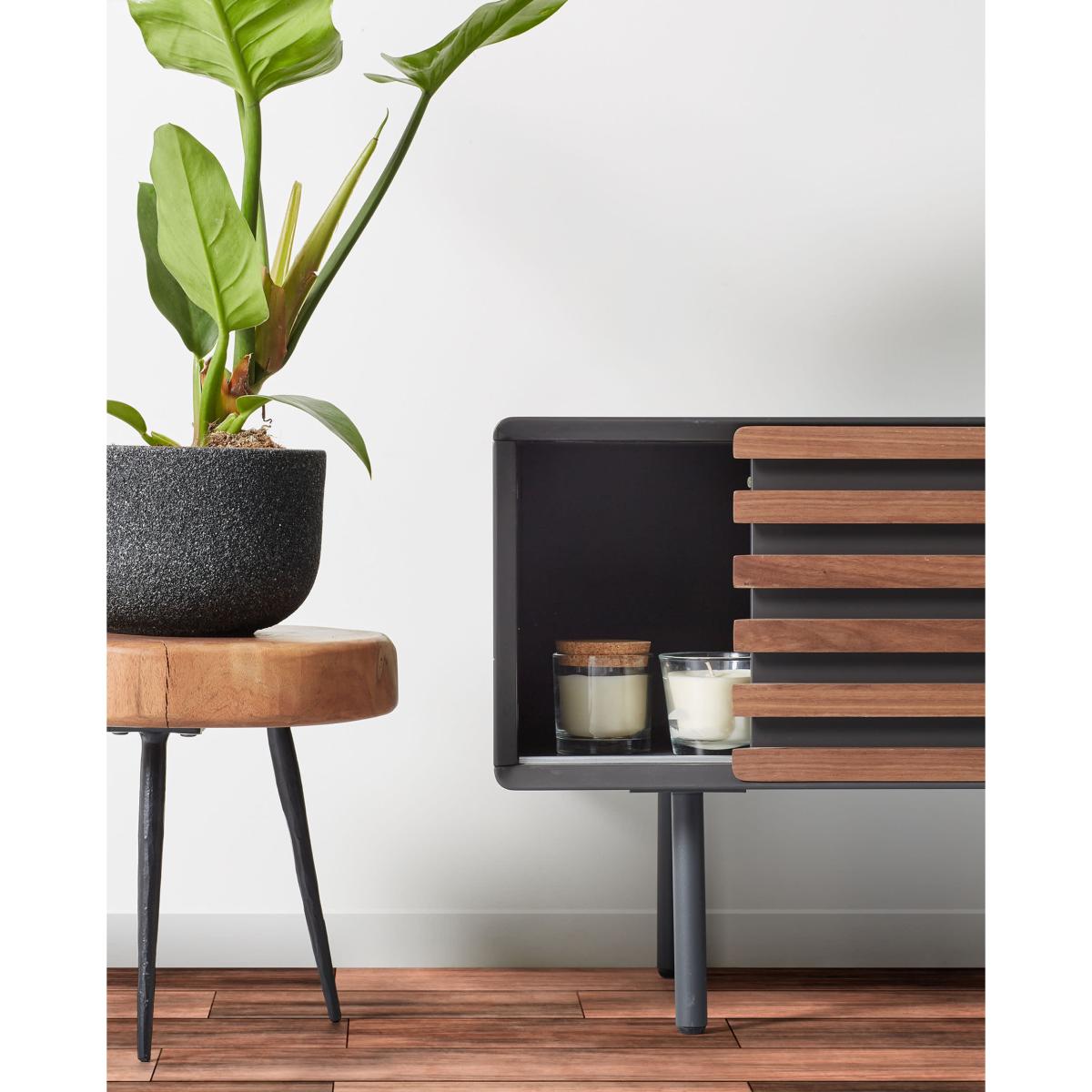 I’m a fan of this walnut-and-black TV stand for its clean lines and versatile mix of warm wood veneer with matte steel. It sits neatly in modern, Scandinavian or industrial schemes and its single-door design keeps media kit out of sight while open shelves let you show off books or a slim soundbar. For styling, group a couple of low-profile photo frames and a small plant on one side of the top surface, stack a few art or design books in the shelf beneath, and tuck games or remotes behind the door to maintain an uncluttered look.