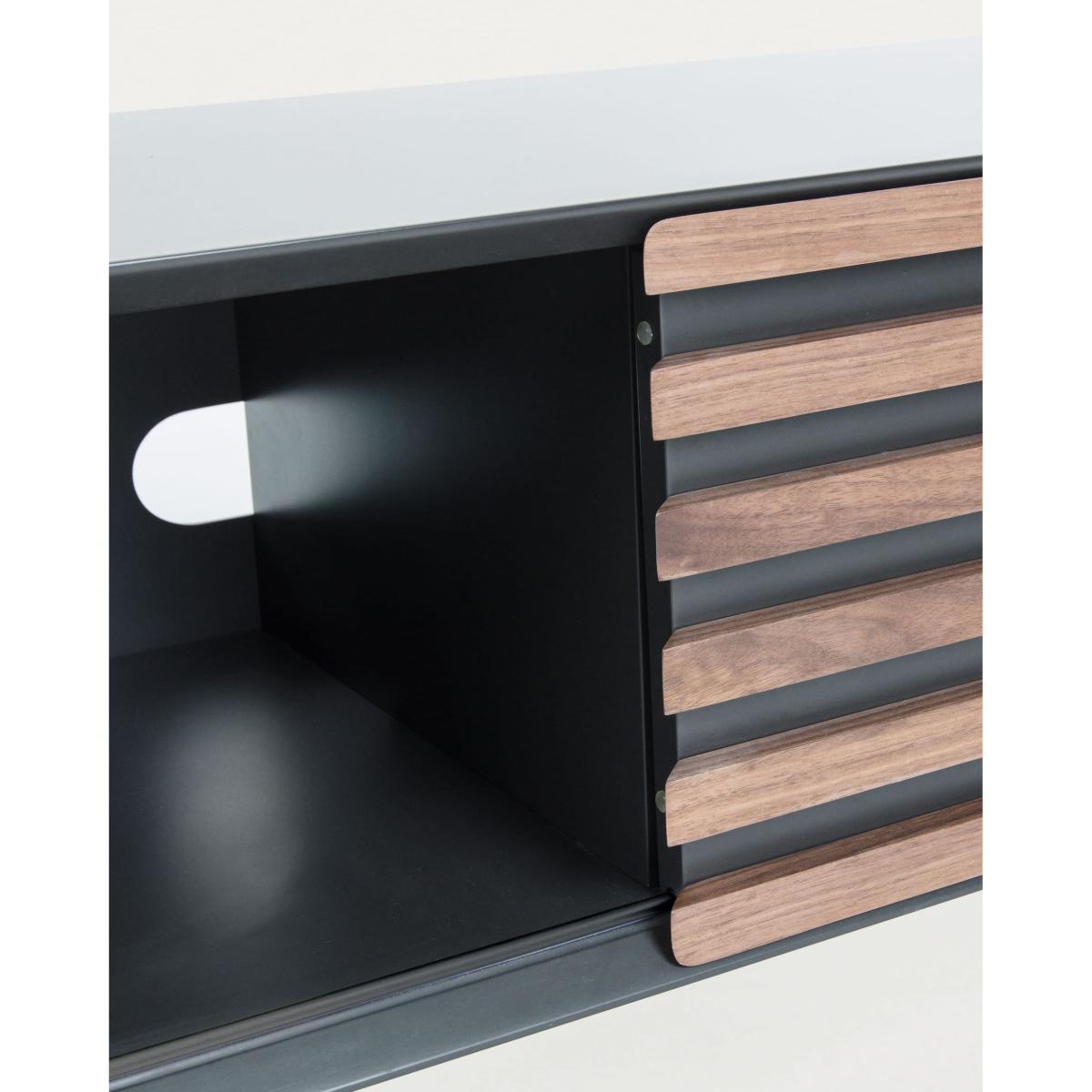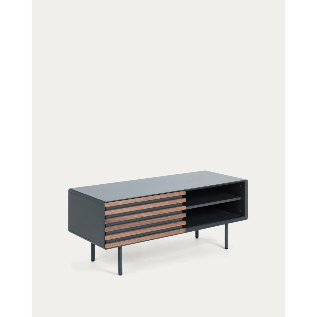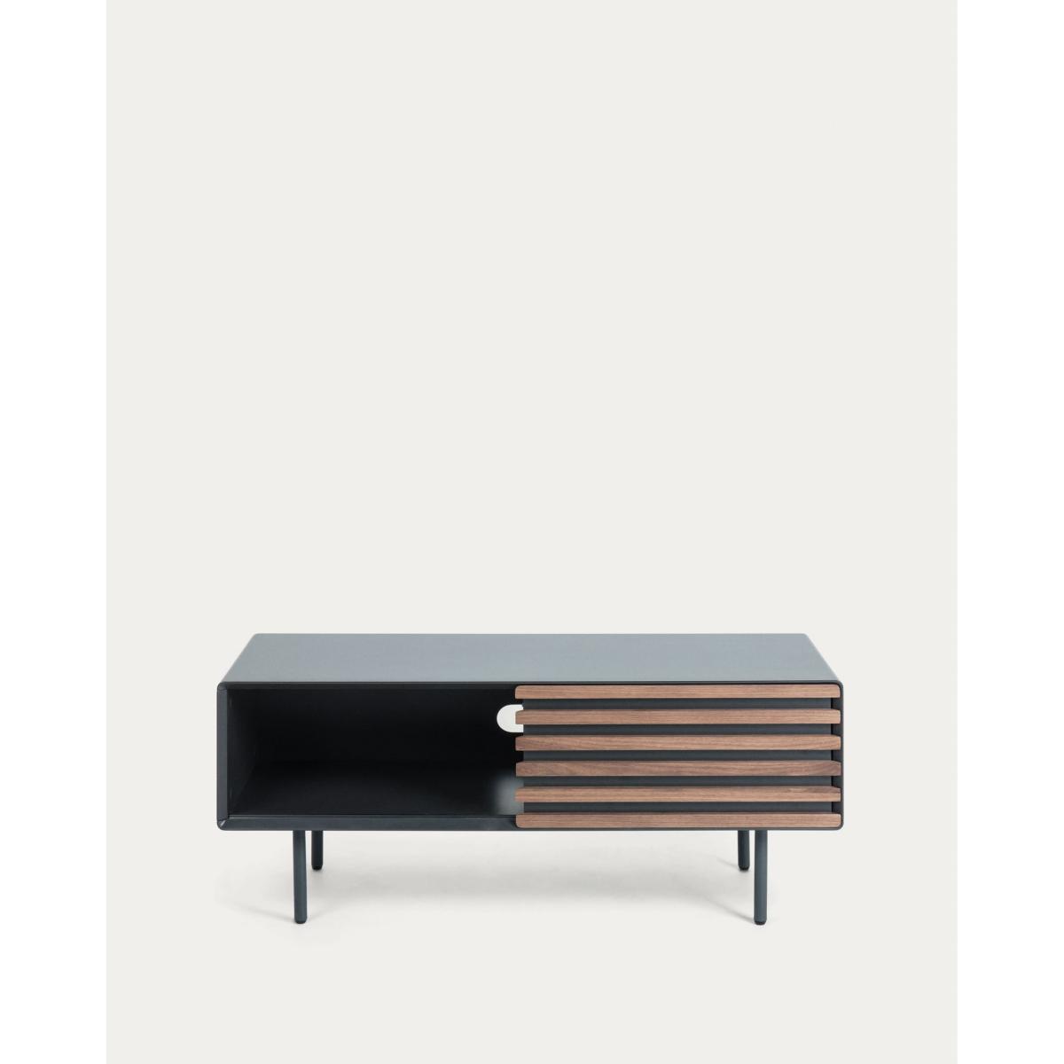 Kesia single door TV stand with walnut wood veneer with black lacquer & black steel, 120 x 48.5 cm