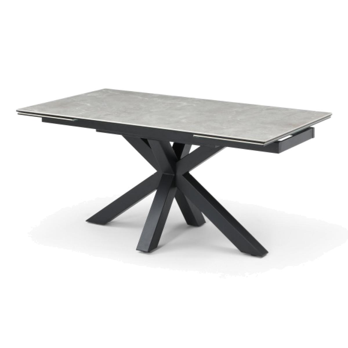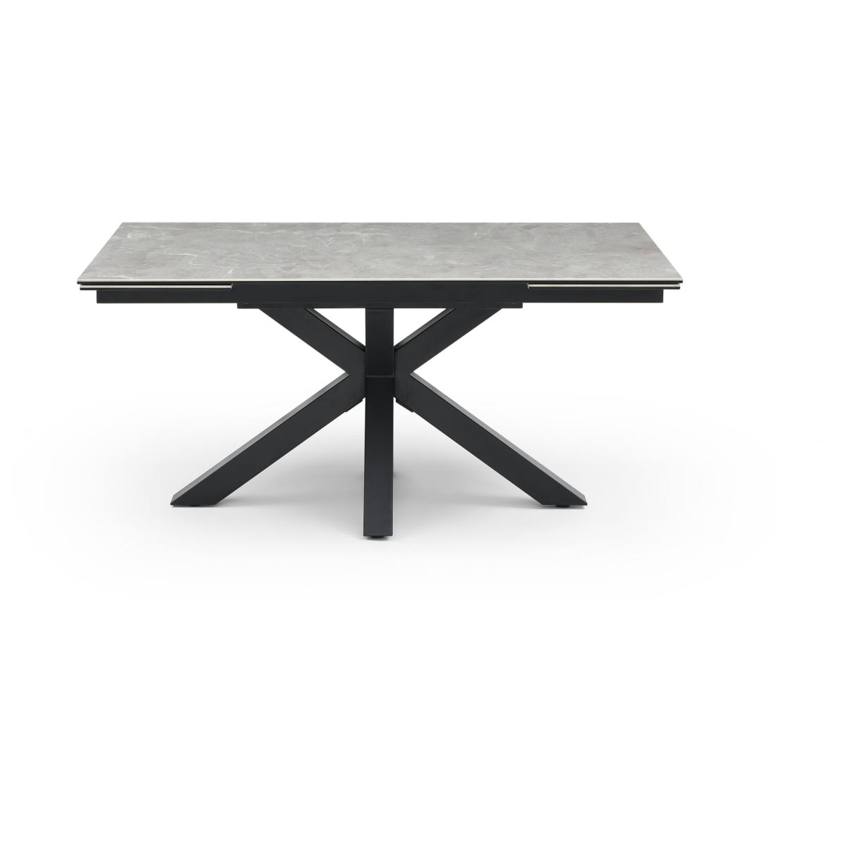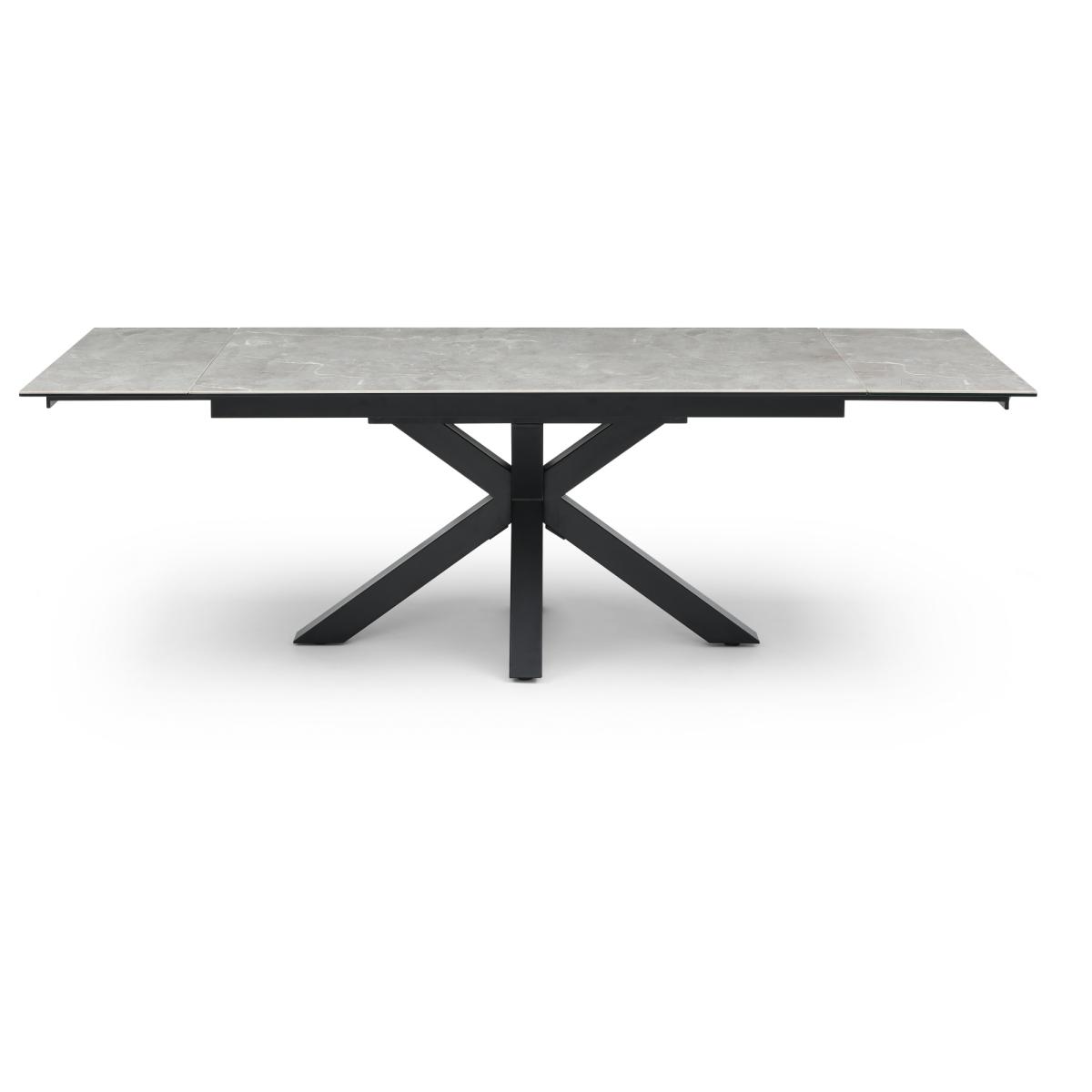 Supported by a minimalist black metal base, the Kalufa table with a ceramic top in a grey marble effect effortlessly combines functionality and style. The simple extending mechanism allows you to seat up to ten guests creating the perfect setting for unforgettable evenings. 2 built in extension leaves simply pull out and lock into place at each end of the table. Each leaf adds an additional 40cm of seating space. The ceramic top is durable, scratch-resistant, heat-resistant, and can withstand daily wear and tear. Perfect for a busy family where chips, scratches and crayons could cause damage on another table type!.Ceramic is also non-porous making it resistant to stains any spillage can be quickly wiped up and easily cleaned. Dimensions: Extending from 160-240 cm wide Depth 89.5cm Height 75cm Home assembly is required. All screens vary in colour reproduction and whilst every effort has been made to display the colour as accurately as possible it is for guidance only.