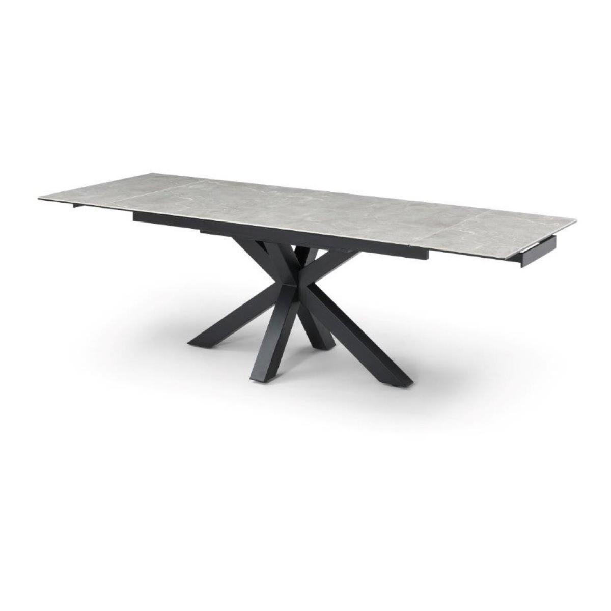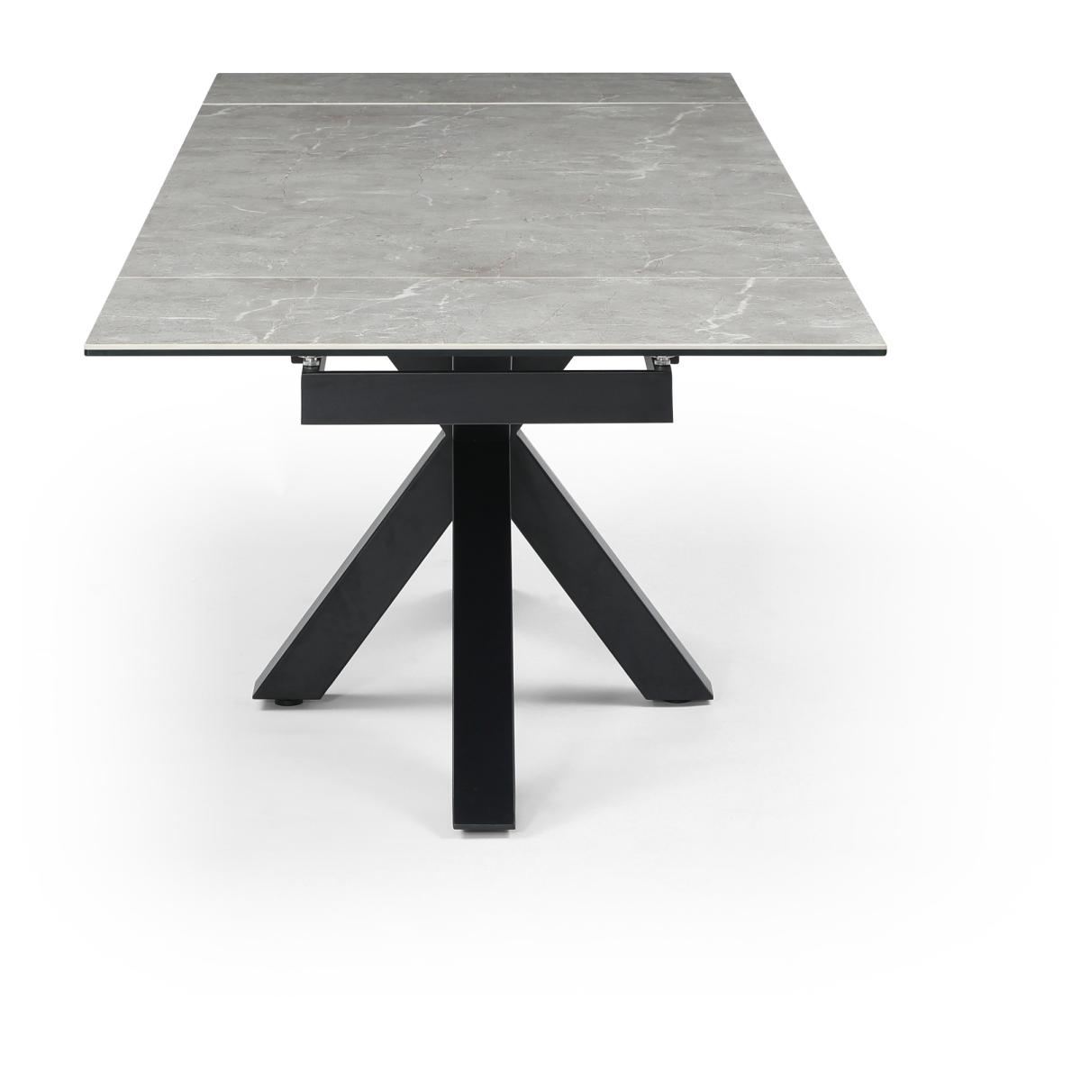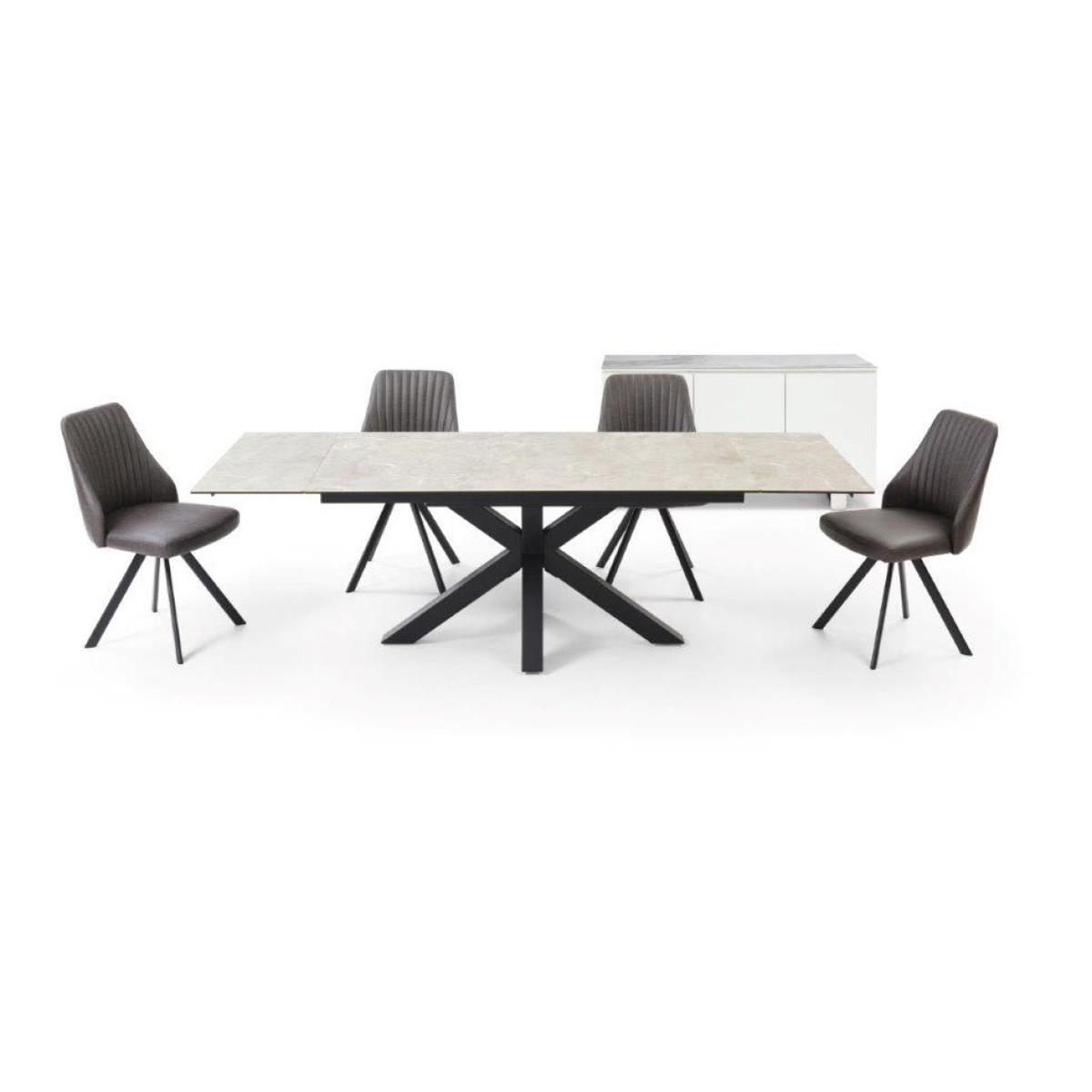 Supported by a minimalist black metal base, the Kalufa table with a ceramic top in a grey marble effect effortlessly combines functionality and style. The simple extending mechanism allows you to seat up to ten guests creating the perfect setting for unforgettable evenings. 2 built in extension leaves simply pull out and lock into place at each end of the table. Each leaf adds an additional 40cm of seating space. The ceramic top is durable, scratch-resistant, heat-resistant, and can withstand daily wear and tear. Perfect for a busy family where chips, scratches and crayons could cause damage on another table type!.Ceramic is also non-porous making it resistant to stains any spillage can be quickly wiped up and easily cleaned. Dimensions: Extending from 160-240 cm wide Depth 89.5cm Height 75cm Home assembly is required. All screens vary in colour reproduction and whilst every effort has been made to display the colour as accurately as possible it is for guidance only.