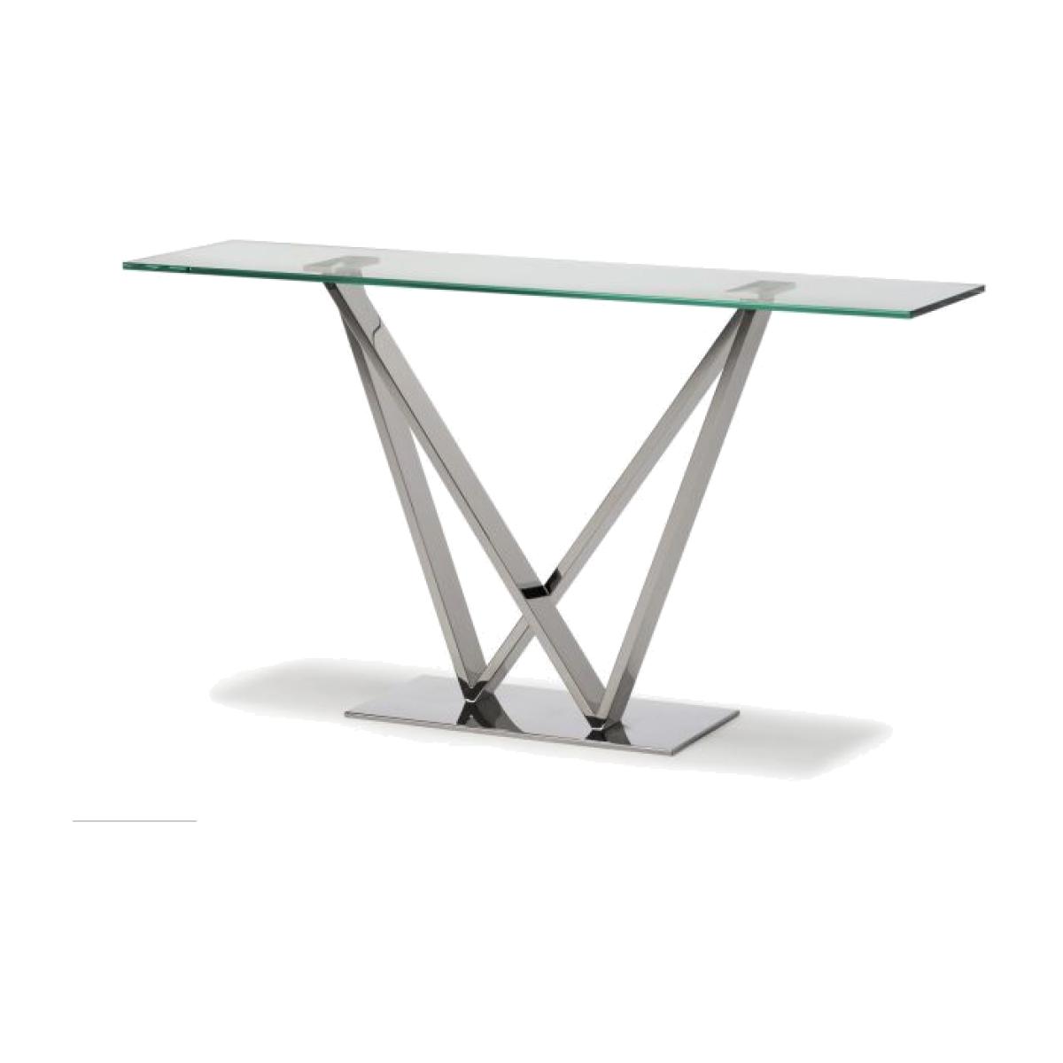 I’m a fan of the Westwind console for its sleek combination of glass and stainless-steel that keeps a hallway or living space feeling open and light. It works especially well in contemporary and minimalist interiors, where clean lines and reflective surfaces help to amplify natural light and create a sense of space. Pair it with a low-profile mirror or an abstract print above, then style sparingly on top - a slim vase of fresh foliage plus a small decorative bowl for keys or trinkets keeps the look uncluttered. If you need a bit more warmth, add a textured runner or a pair of slender table lamps with fabric shades to soften the metallic base.