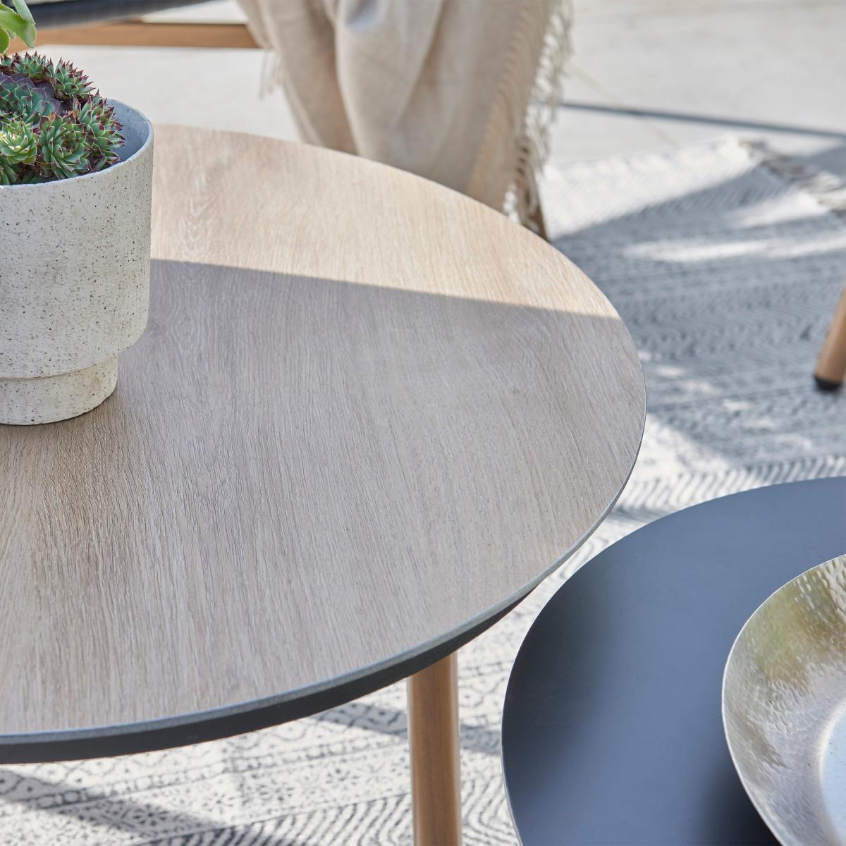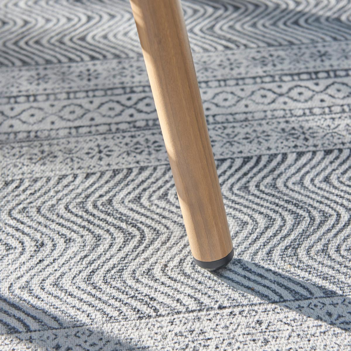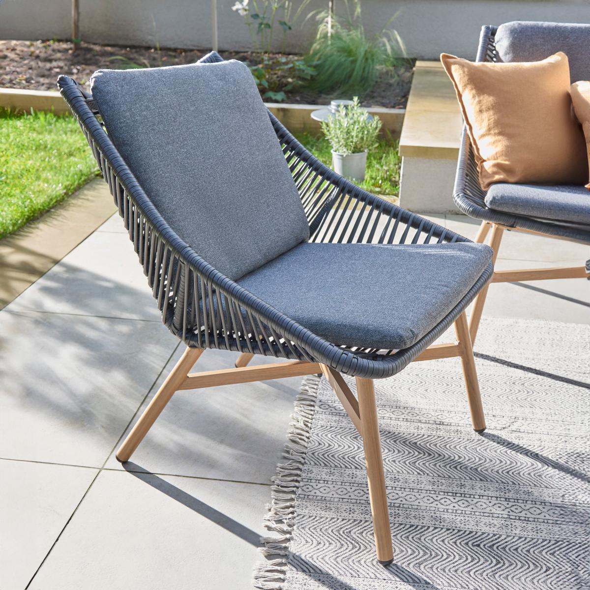 * 1 x table, 1 x sofa and 2 x armchairs * Wicker seats * Wooden frames * Weather resistant This outdoor lounge set features modern flat wicker detailing and heat transfer wood-effect legs for a stylish, contemporary look. Dual coffee tables with Beech and Black SPC tops offer the natural appeal of wood, along with waterproof, durable, and eco-friendly properties. Dark Stone Grey cushions with 'easy care' stain protection and shower resistance provide added comfort and convenience.