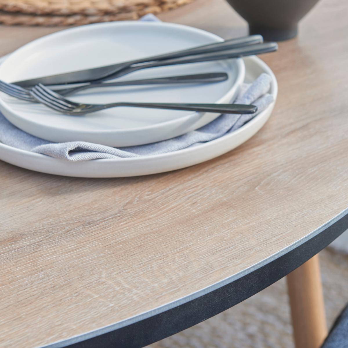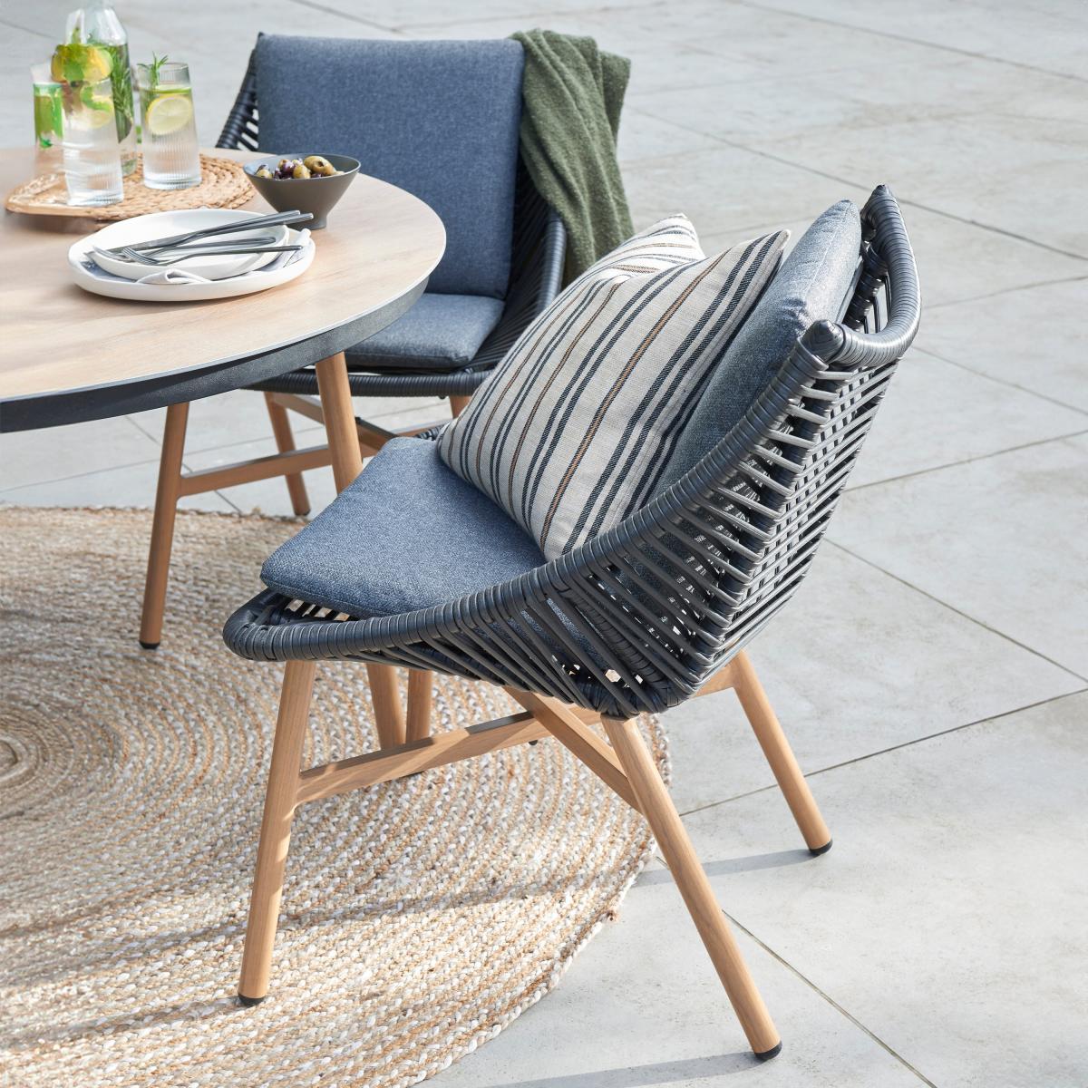 * 1 x table and 4 x chairs * Wicker seats * Wooden frames * Weather resistant The Keswick 4 Seat Dining Set combines elegance with practicality for outdoor dining. The spacious table accommodates four diners, ideal for gatherings, while black flat wicker seats offer lasting quality and comfort. The wood-effect legs are waterproof, eco-friendly, and resistant to wear. The Beech SPC table top is waterproof, durable, and provides a natural wood look. Dark Stone Grey cushions ensure a comfortable dining experience.