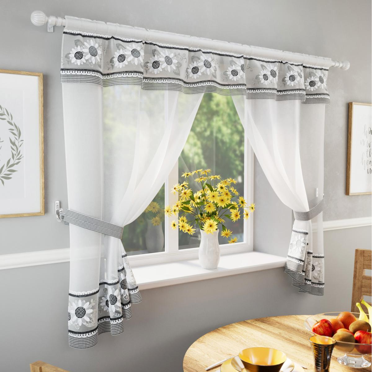 Brighten up your home with the charming Keswick window set. The design features embroidery and applique sunflower motifs, with matching tie backs. Crafted from high quality fabric for long lasting beauty and easy care. The window set provides light filtration allowing natural light to gently through whilst still providing privacy. The set includes an attached valance for easy installation using the rod pocket header.