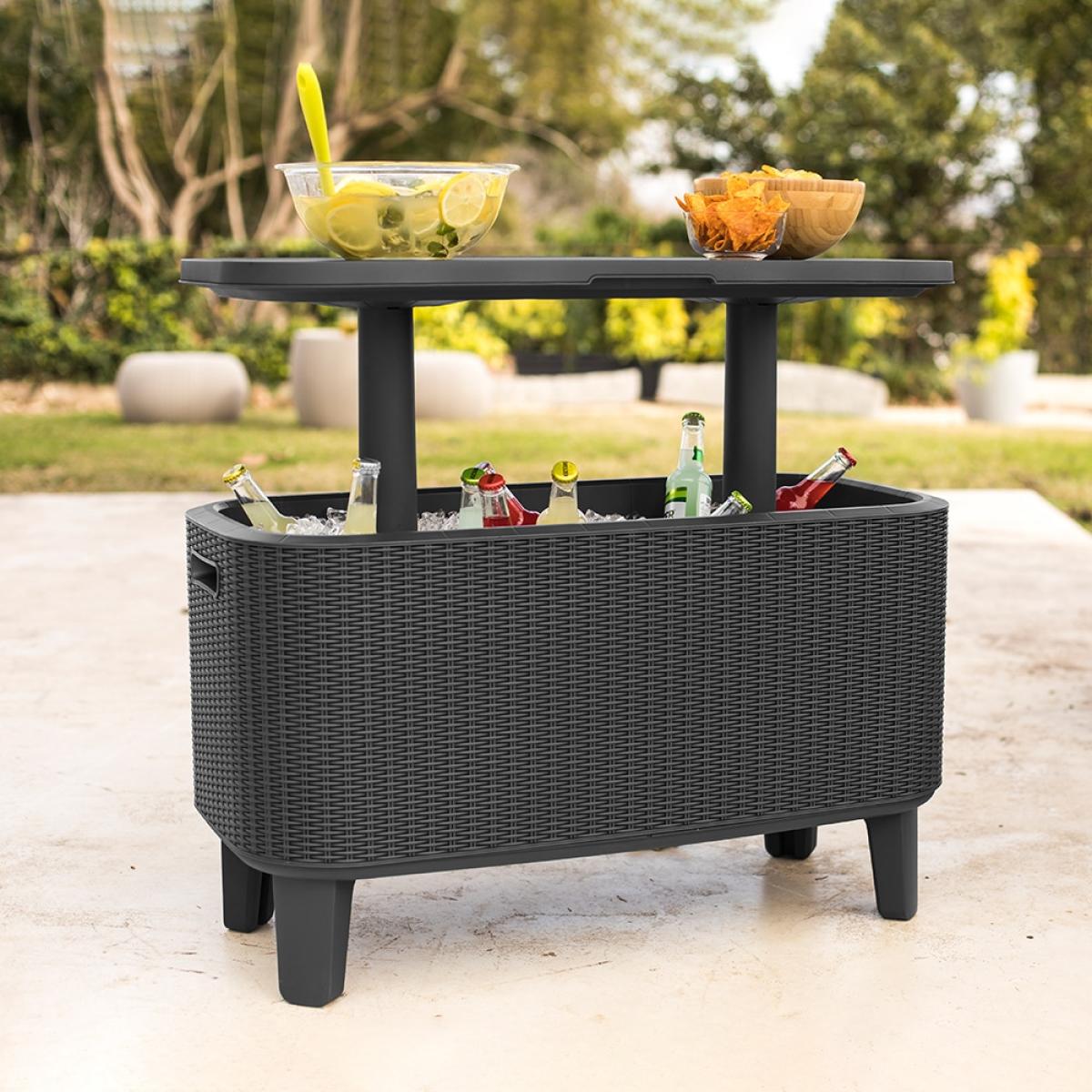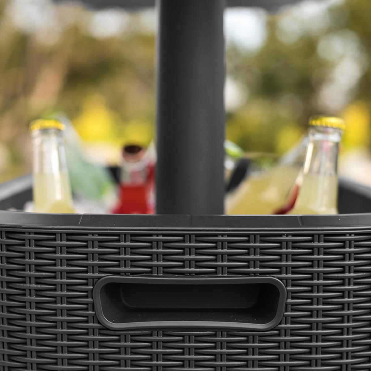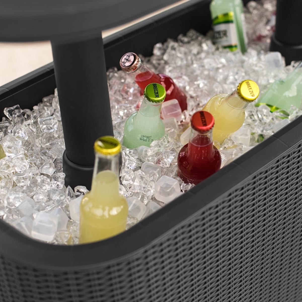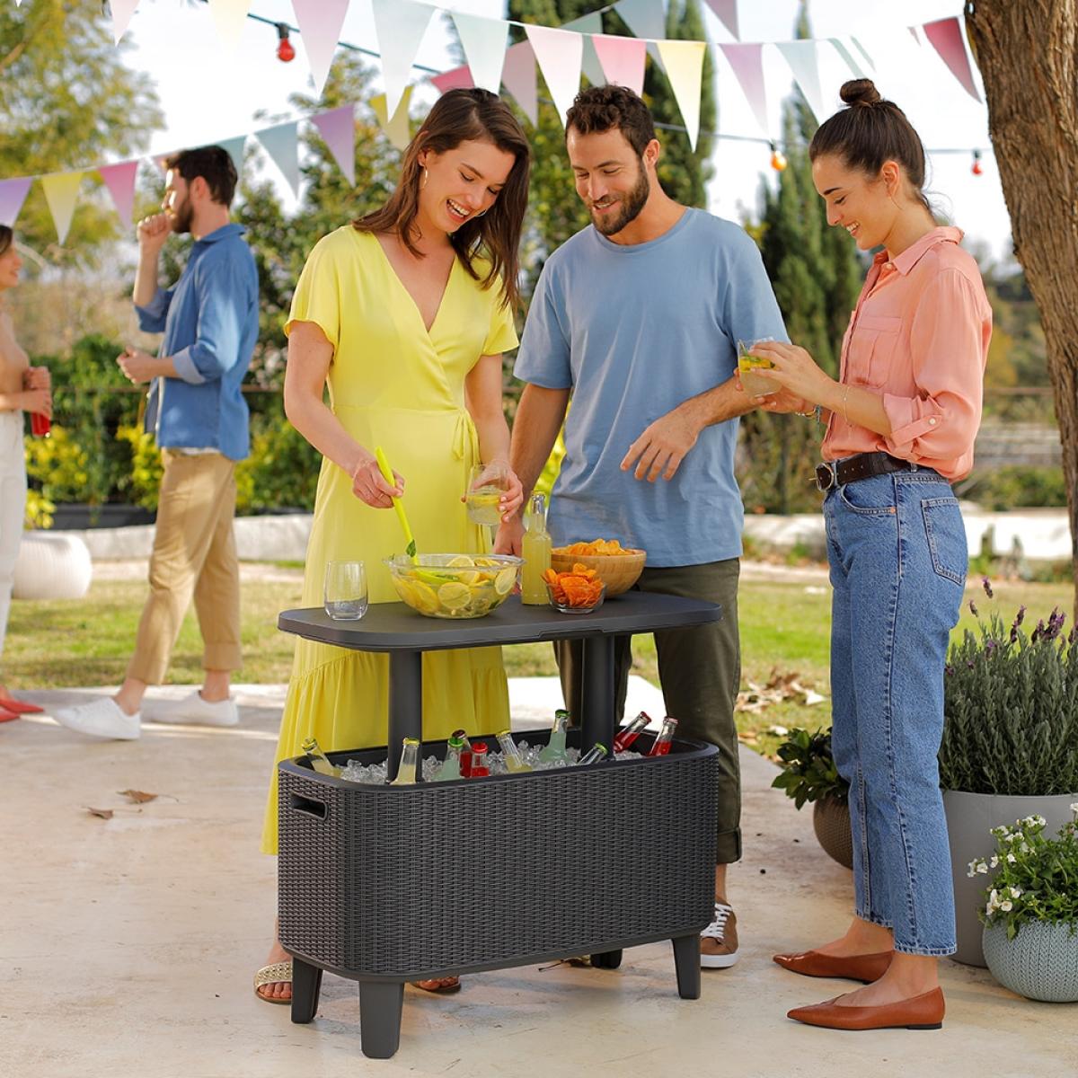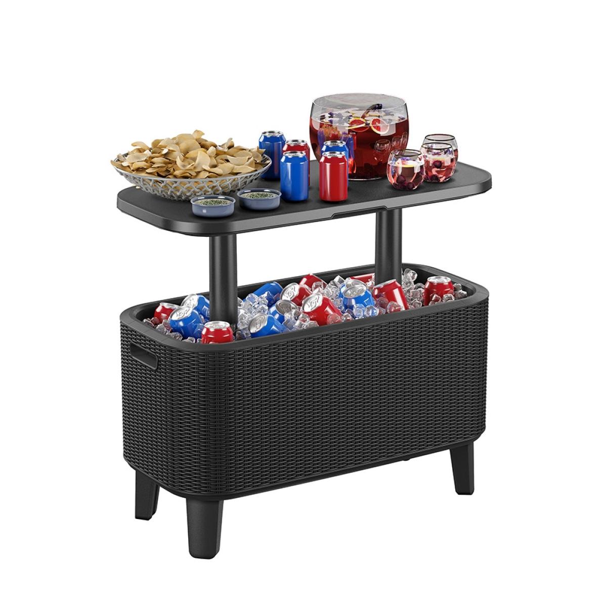 Get the party started with the Bevy Bar from Keter! With a double wall cooler, you'll have no shortage of perfectly chilled beverages ready to pass around at the next BBQ or family get together! With space for 65 bottles or 130 cans, no one will be going thirsty and what's even better is the top is perfect for housing all those chips, dips and tasty snacks. What more could you want from a table?! Did we mention it's water-resistant too, so even if the British weather decides to give you a shower this hardy piece of kit will survive all weathers!.