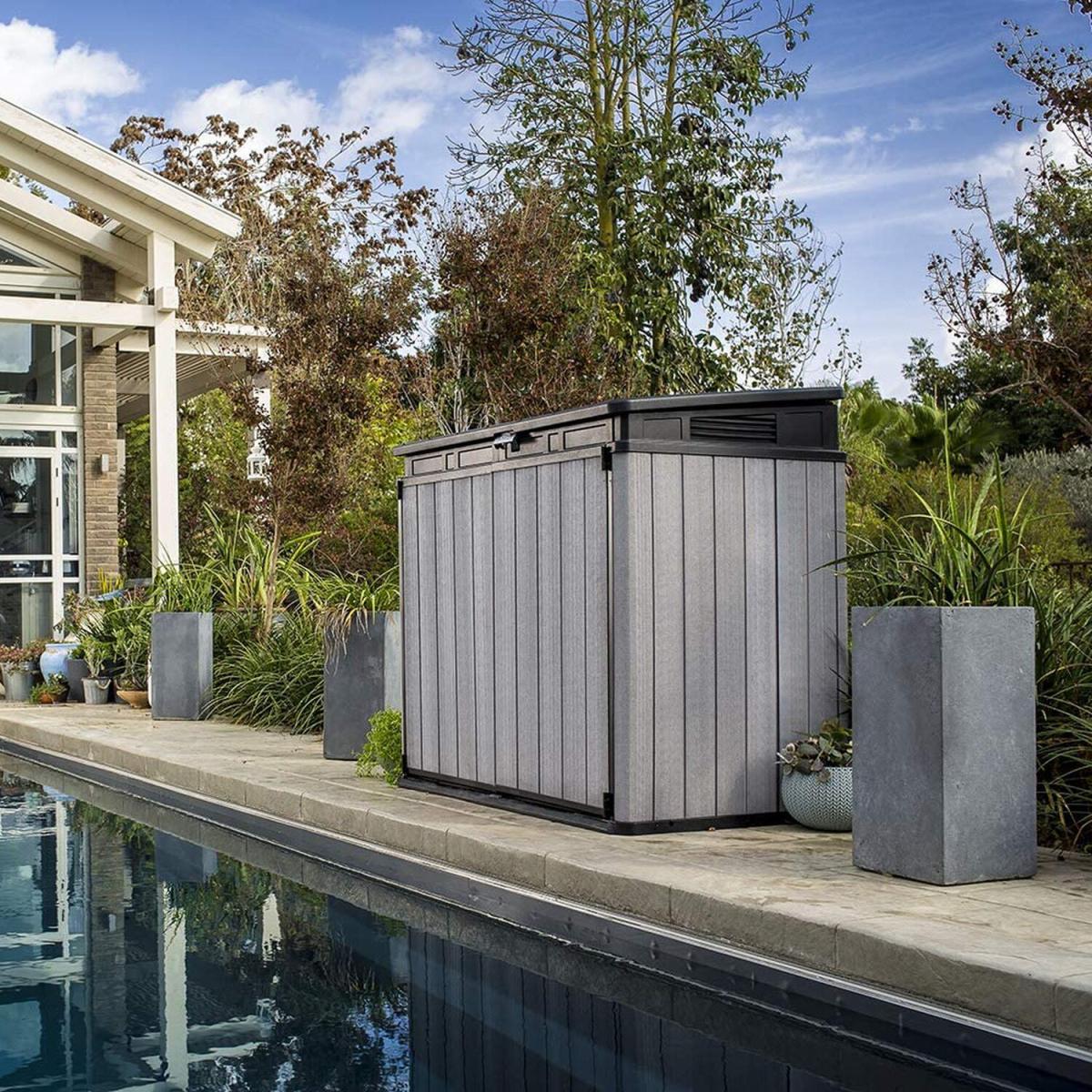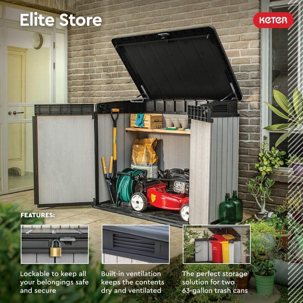 Organize all your garden tools and outdoor accessories in a secure Dry environment with the Keter Elite store horizontal storage shed Constructed of weather-resistant resin this shed features one of a kind detach panels which have a textured wooden look and can be painted to match your home or outdoor living space Strong and durable This shed boasts reinforced double wall panels and will not rush dent or peel It is easy to assemble with its tongue and groove panels The double doors have chrome hinges and a lockable metal handle to ensure smooth operation and security