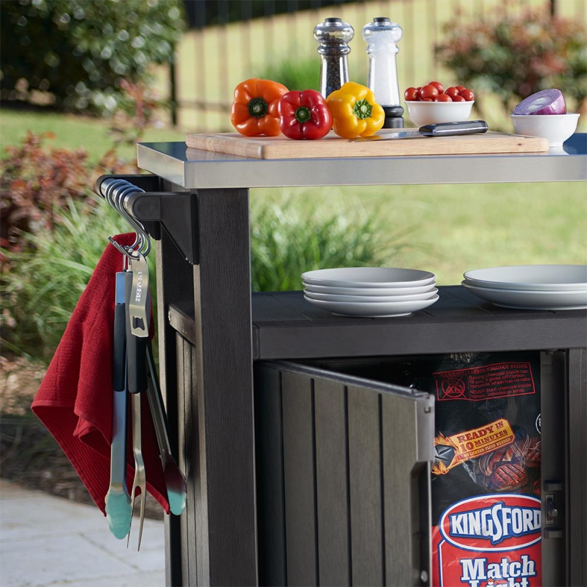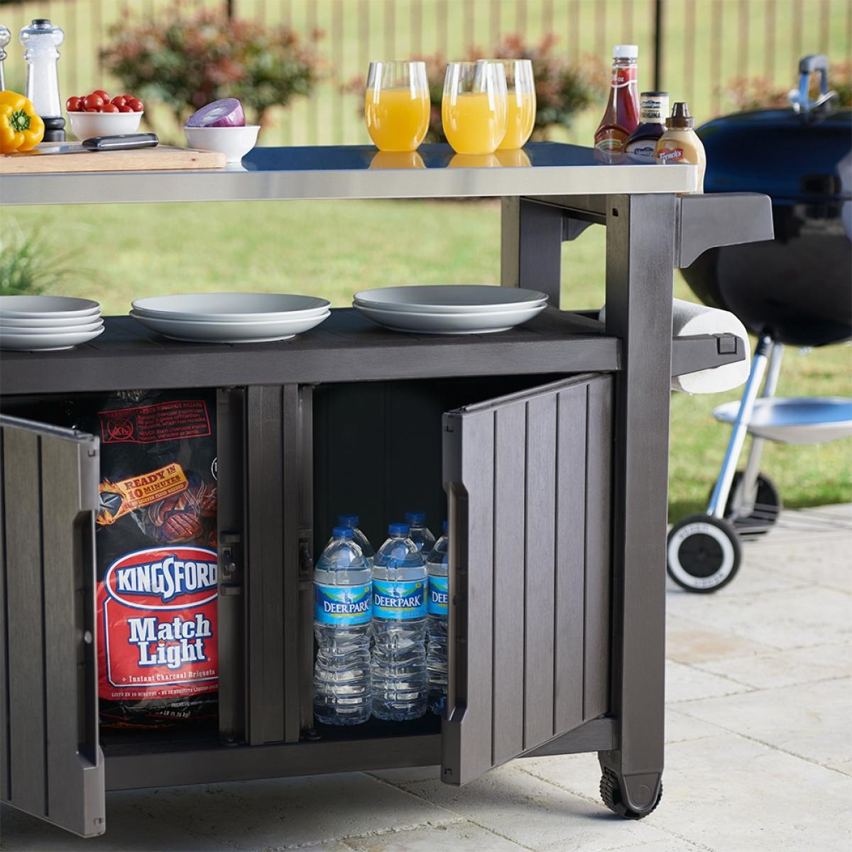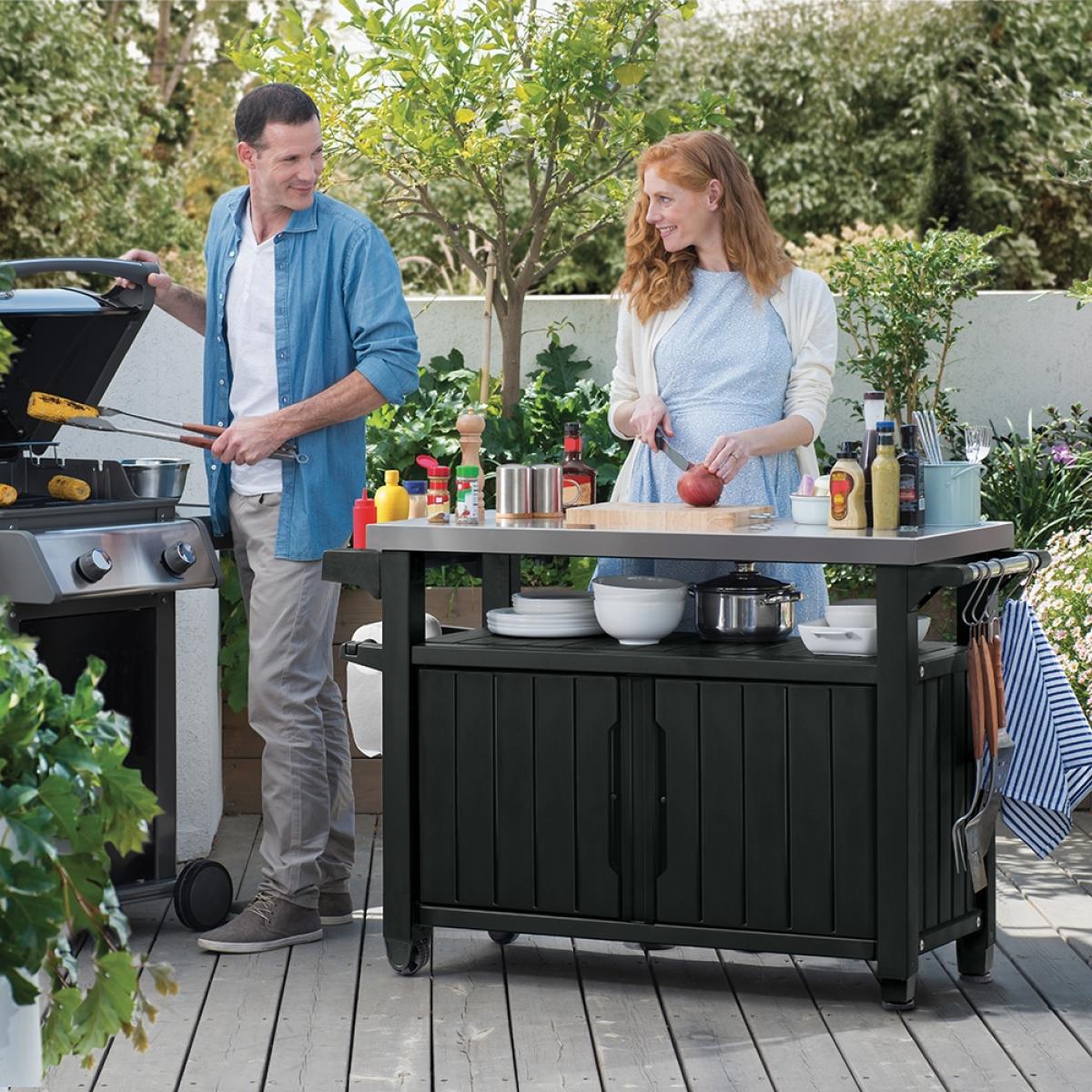 A great addition to any garden or patio of a barbeque enthusiast is the Keter Large BBQ Table in Anthracite Grey. When entertaining guests, or just the family, wheel out this bad boy as an impressive accessory for all your outdoor dining needs. In a durable design with a stainless steel worktop and plenty of storage space, for all those barbeque accessories, not only is it practical but it looks good too. Made from heavy-duty resin making it maintenance-free and able to be left outside whatever the weather, which is a bonus!.