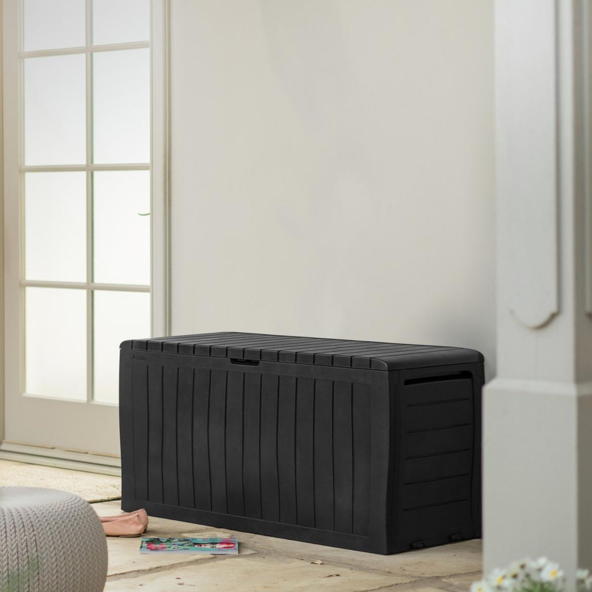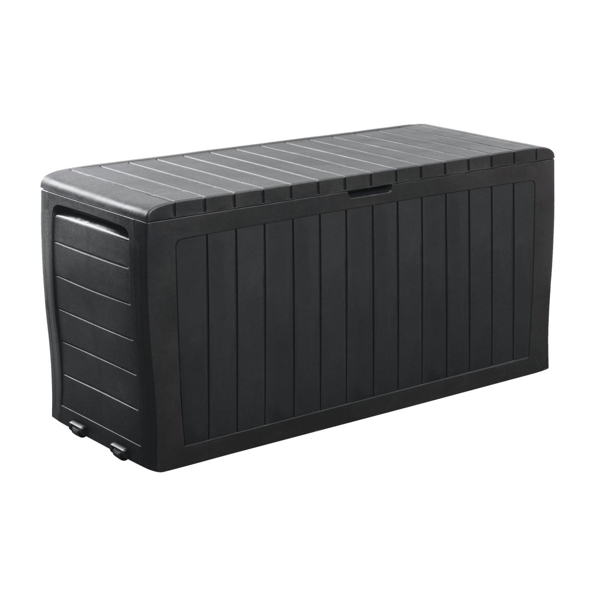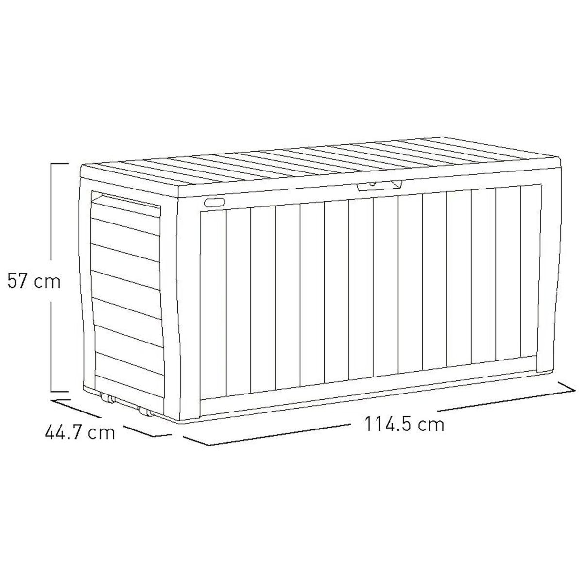 The Keter Marvel Plus wood effect storage box is weather resistant and perfect for use in the garden or patio all year. With a generous 270. L storage capacity, this box is ideal for storing outdoor furniture cushions and garden equipment. It can even double up as extra seating for up to 2 adults, so it's perfect for when you're entertaining family and friends. Low maintenance and it is lockable (with your own padlock) to keep your belongings secure. Easy to assemble so you can use it straight away. Low maintenance, weather-resistant and easy to assemble. Can be used as seating for up to two adults. The lid will take a weight capacity of 220kg / 485lbs. Built in handles, wheels and a large 270. L capacity. Made of plastic. Capacity 270 L. Lockable. External size H57, W116.7, D44.7cm. Internal size H51.2, W114.4, D40cm. Weight 6.3kg. 1 person self-assembly. Manufacturer's 2 year guarantee.