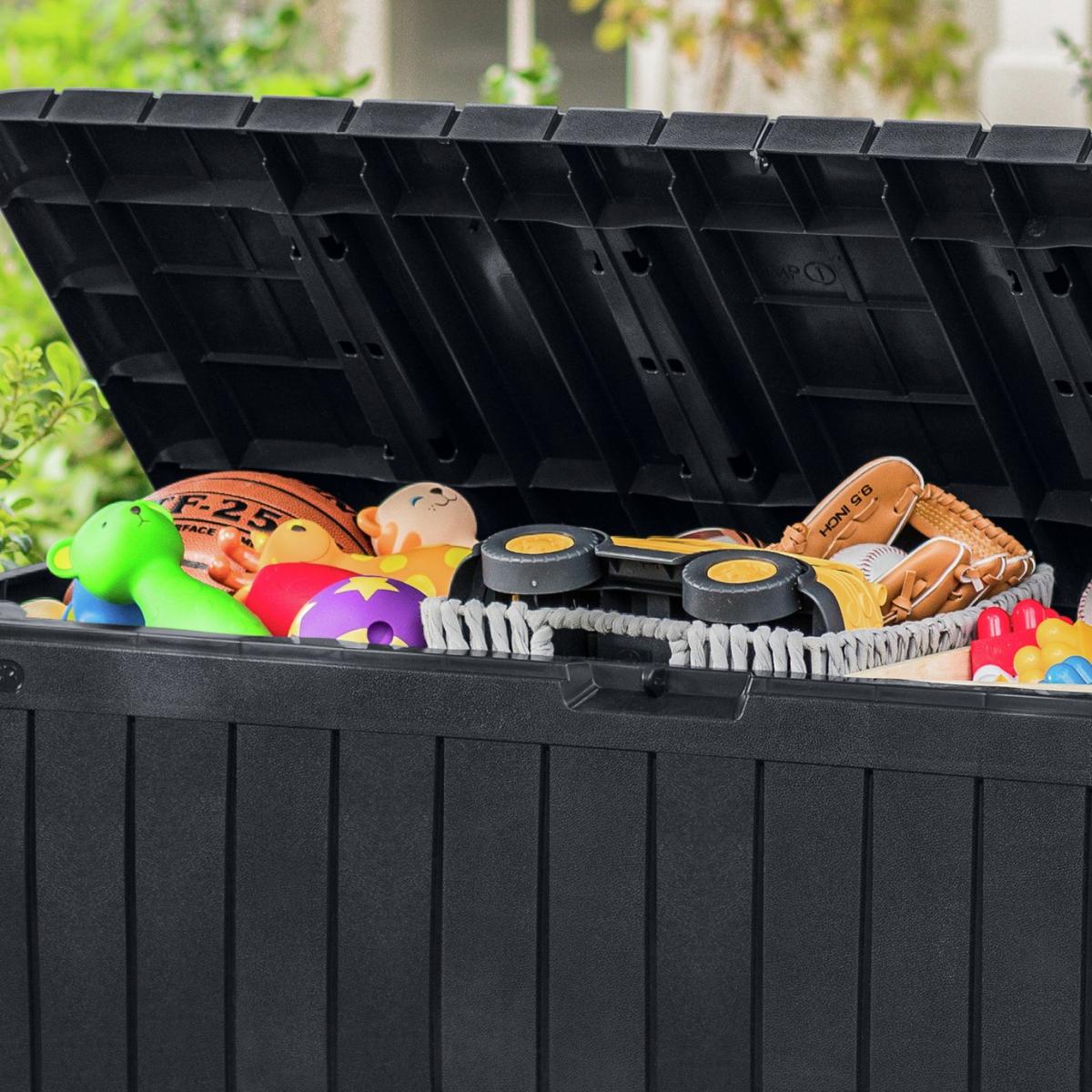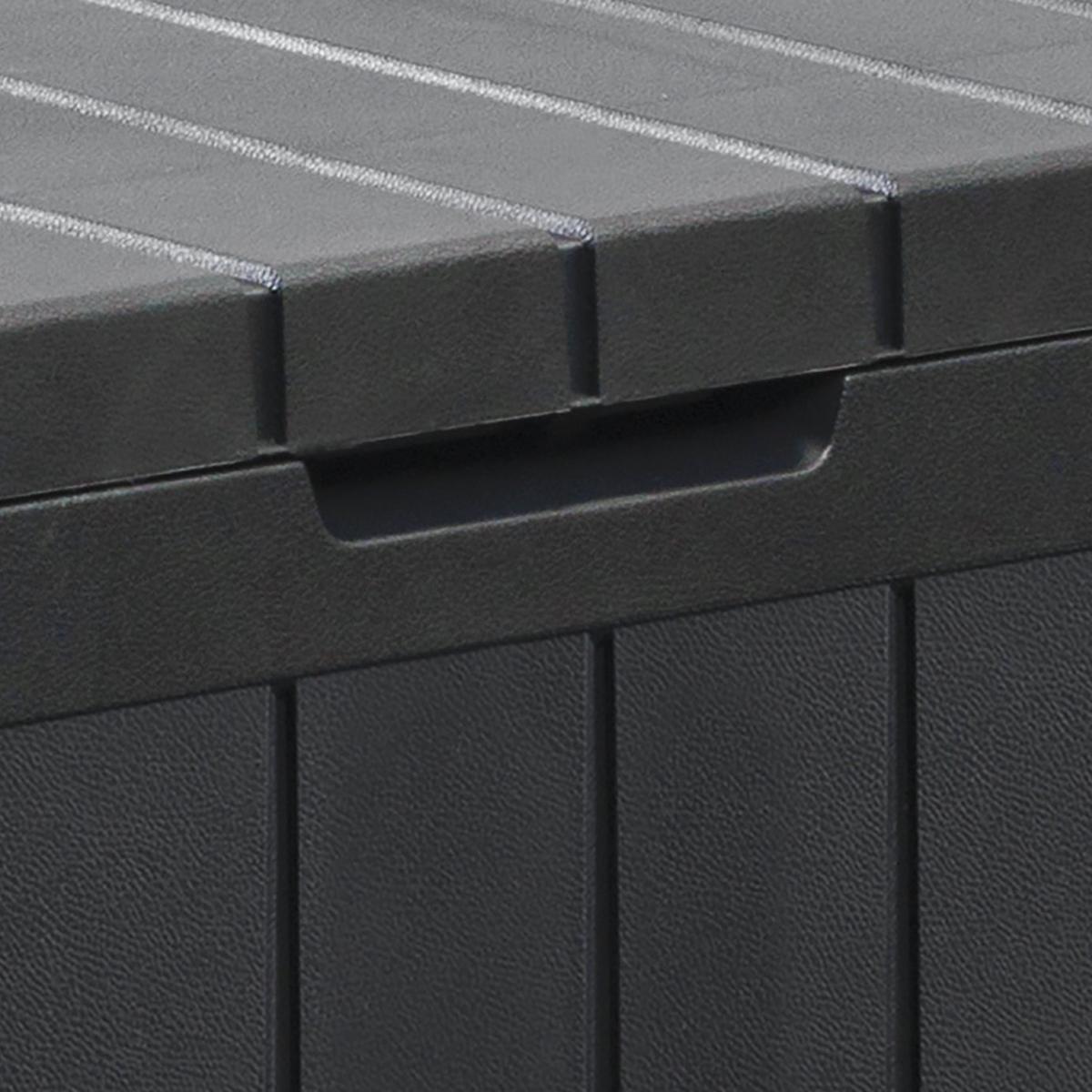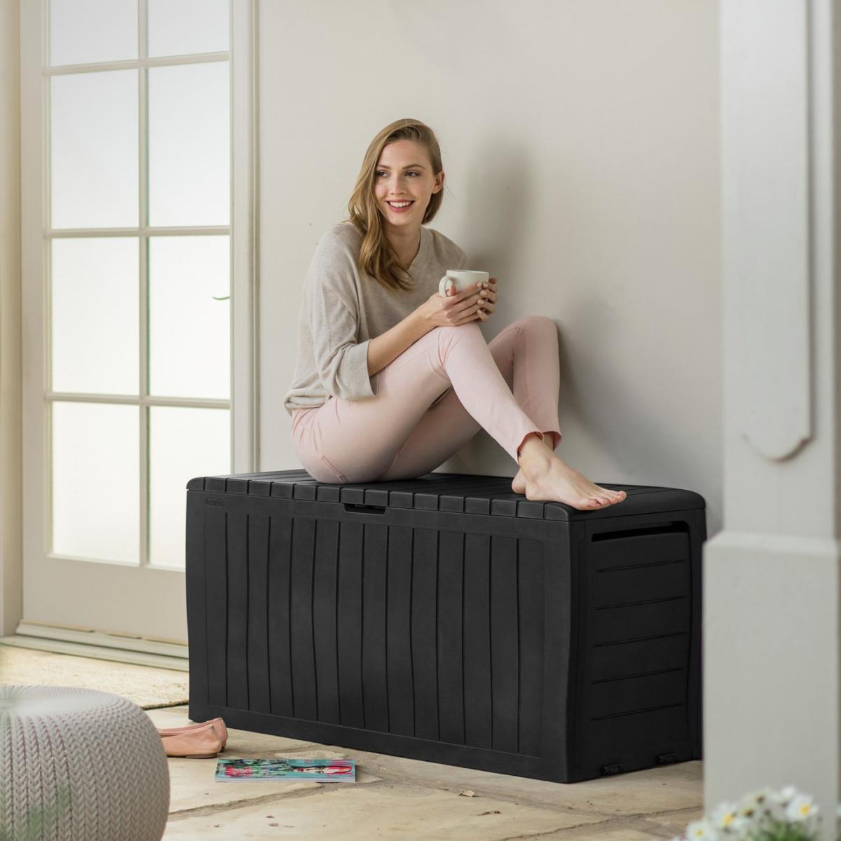 The Keter Marvel Plus wood effect storage box is weather resistant and perfect for use in the garden or patio all year. With a generous 270. L storage capacity, this box is ideal for storing outdoor furniture cushions and garden equipment. It can even double up as extra seating for up to 2 adults, so it's perfect for when you're entertaining family and friends. Low maintenance and it is lockable (with your own padlock) to keep your belongings secure. Easy to assemble so you can use it straight away. Low maintenance, weather-resistant and easy to assemble. Can be used as seating for up to two adults. The lid will take a weight capacity of 220kg / 485lbs. Built in handles, wheels and a large 270. L capacity. Made of plastic. Capacity 270 L. Lockable. External size H57, W116.7, D44.7cm. Internal size H51.2, W114.4, D40cm. Weight 6.3kg. 1 person self-assembly. Manufacturer's 2 year guarantee.