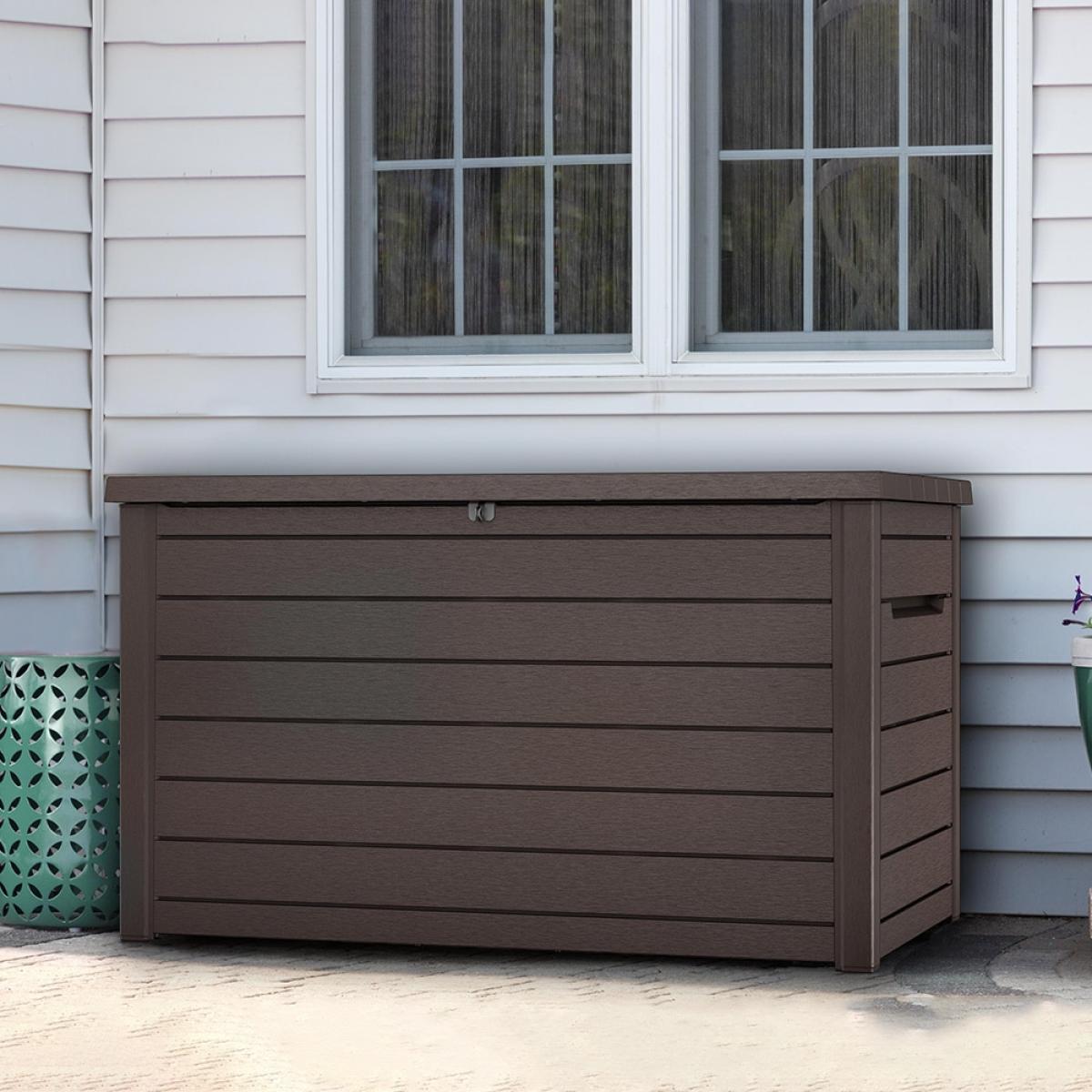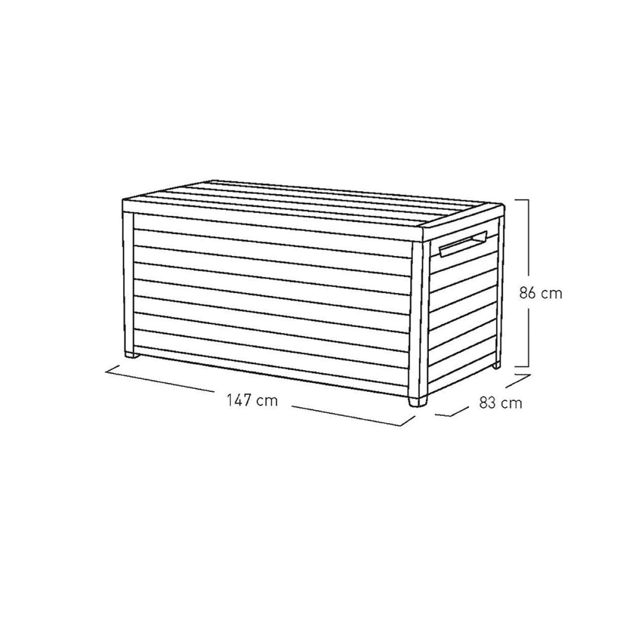 Store cushions, blankets, rugs and the occasional water pistol and pool float safely inside the Outdoor XXL Deck Storage Box from Keter. Designed from weatherproof Duo Tech resin with the addition of a lockable catch, you'll be safe in the knowledge everything is well protected. Featuring handles and piston hinges, easily transport and access your chosen contents. And with a natural wood effect, this practical storage box will fit perfectly in any outdoor space!.