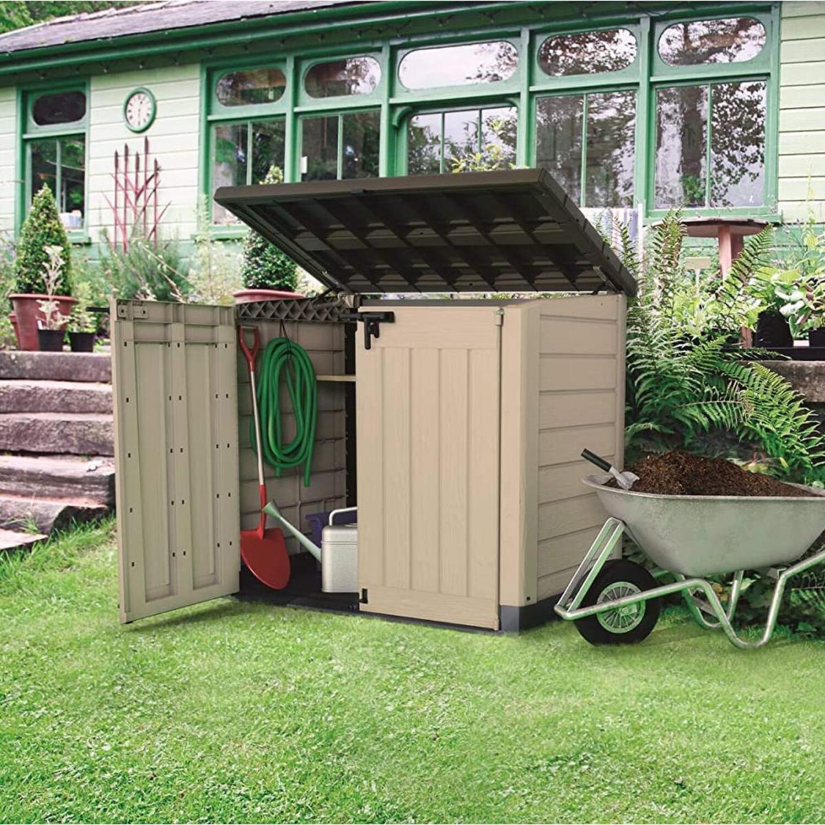 The Store-it-out Max is the all-purpose outdoor storage box, ideal for garden tools, mowers and other equipment, garden furniture and cushions, wheelie bins and others. Providing dry and ventilated storage, it features a piston-assisted lid and two wide opening doors for easy access to contents. There are also two lid-lifter chains included to facilitate hands-free opening of wheelie bins stored inside. The Store-it-out Max's durable design is weather resistant and virtually maintenance and fade-free. Just an occasional light wash is all that is required to keep it looking like new. A heavy duty floor and not one but two closure mechanisms - a main door bolt with padlock facility, plus a secondary foot-operated bolt - completes the unit. A compact shape makes the Store-It-out suitable for location all around the garden - on the patio, against a wall or fence or elsewhere on the grass. Assembled external dimensions: 145.5 cm x 82 cm x 125 cm (L x W x H), internal dimensions: 132 cm x 76 cm x 110 cm (L x W x H).The Max is part of Keter's Store-it-out family. Choose the size that is ideal for your storage requirements and garden space, using the comparison chart lower down this page. Box Contains1 x Flat-packed product1 x Assembly instructions