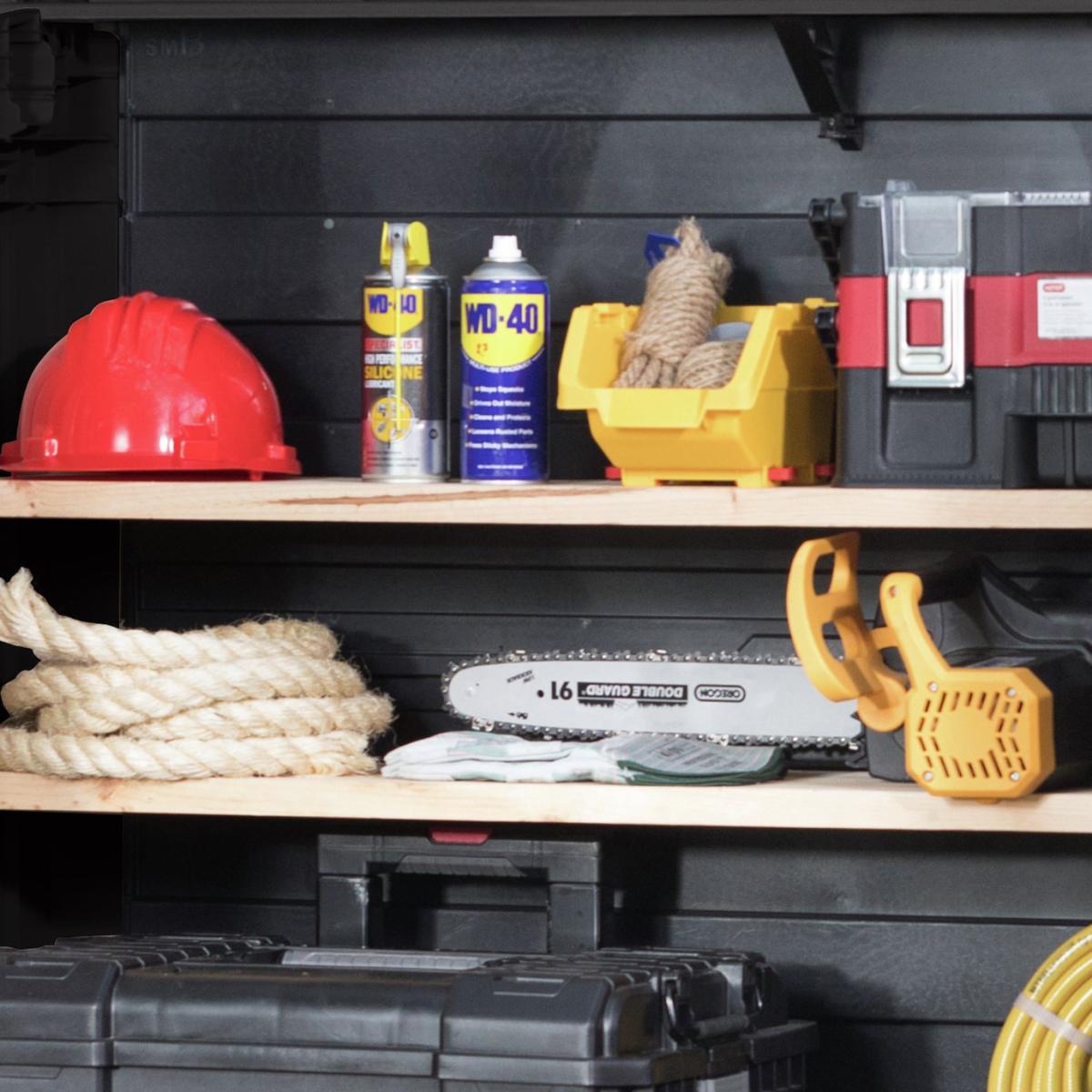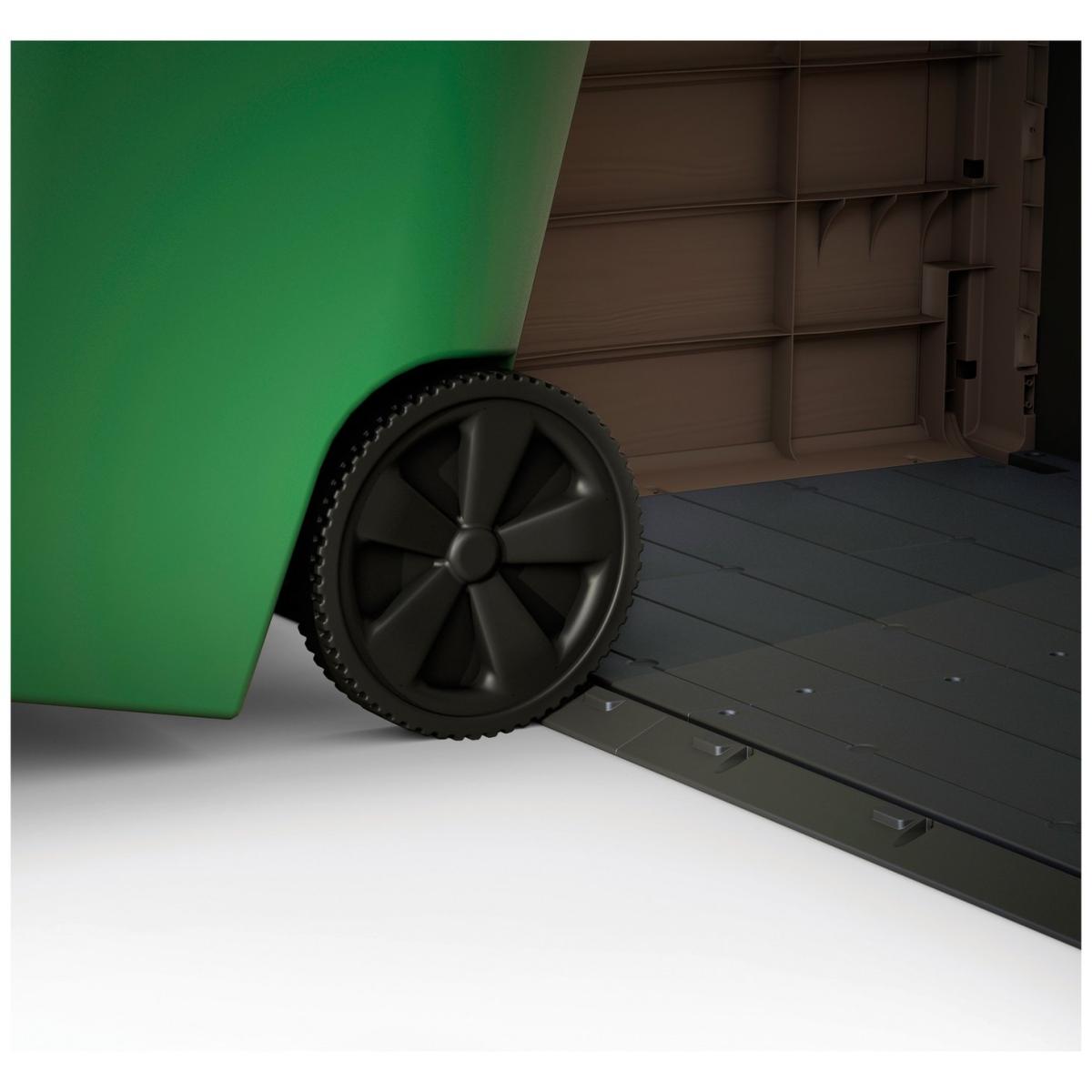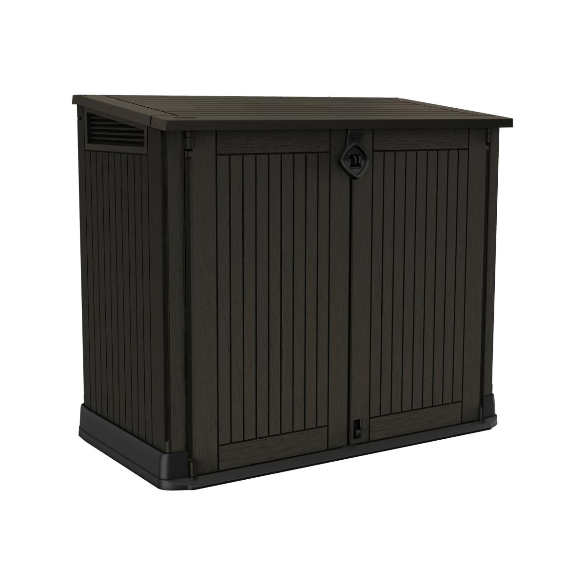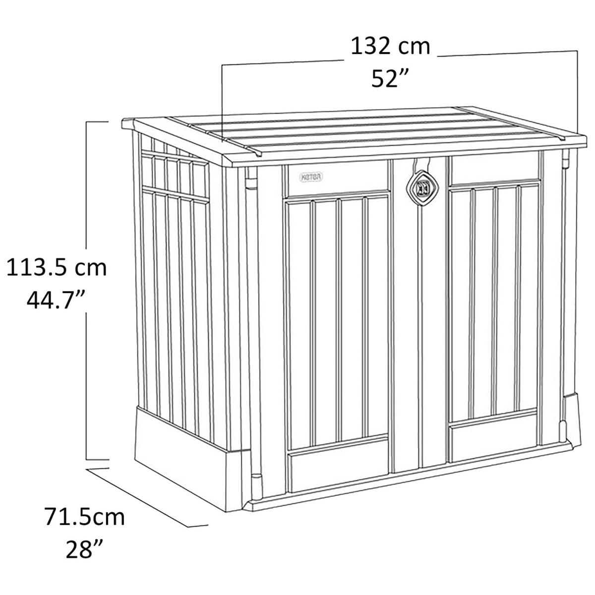The Store It Out MIDI is an ideal storage solution for garden equipment. With its stylish wood-look design, 880. L capacity and durable, weather-resistant construction, it is built to last. It includes built-in ventilation, a sloped floor to protect contents against mud and rainwater and a built-in support for you to add your own shelf. Convenient opening from the top or front and a step-on lock makes access easy when you need it. It can hold 2 x 120. L bins. Lockable for added security (padlock not included). Packaging fits in any car's boot, no delivery needed. Maintenance-free. No rust, dents or peel. UV protected. Made of plastic. Capacity 880 L. Lockable. External size H113.5, W132, D71.5cm. Internal size H108.8, W122, D61cm. Weight 18kg. 2 person self-assembly. Manufacturer's 5 year guarantee.