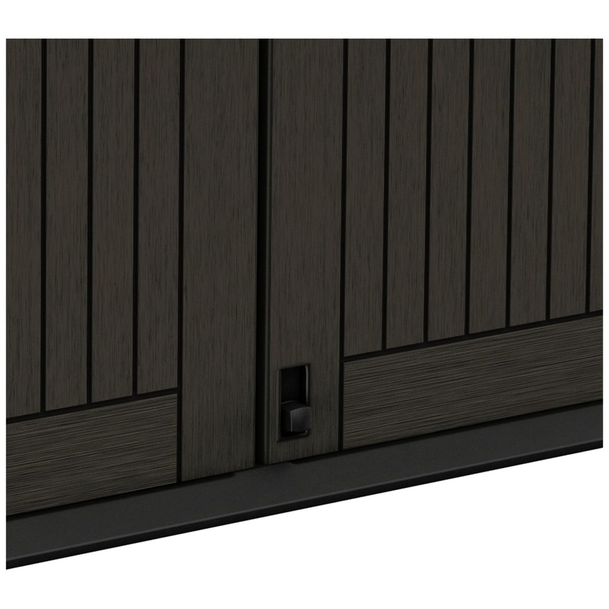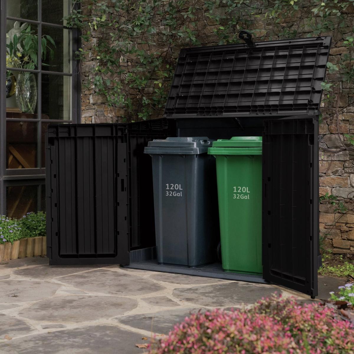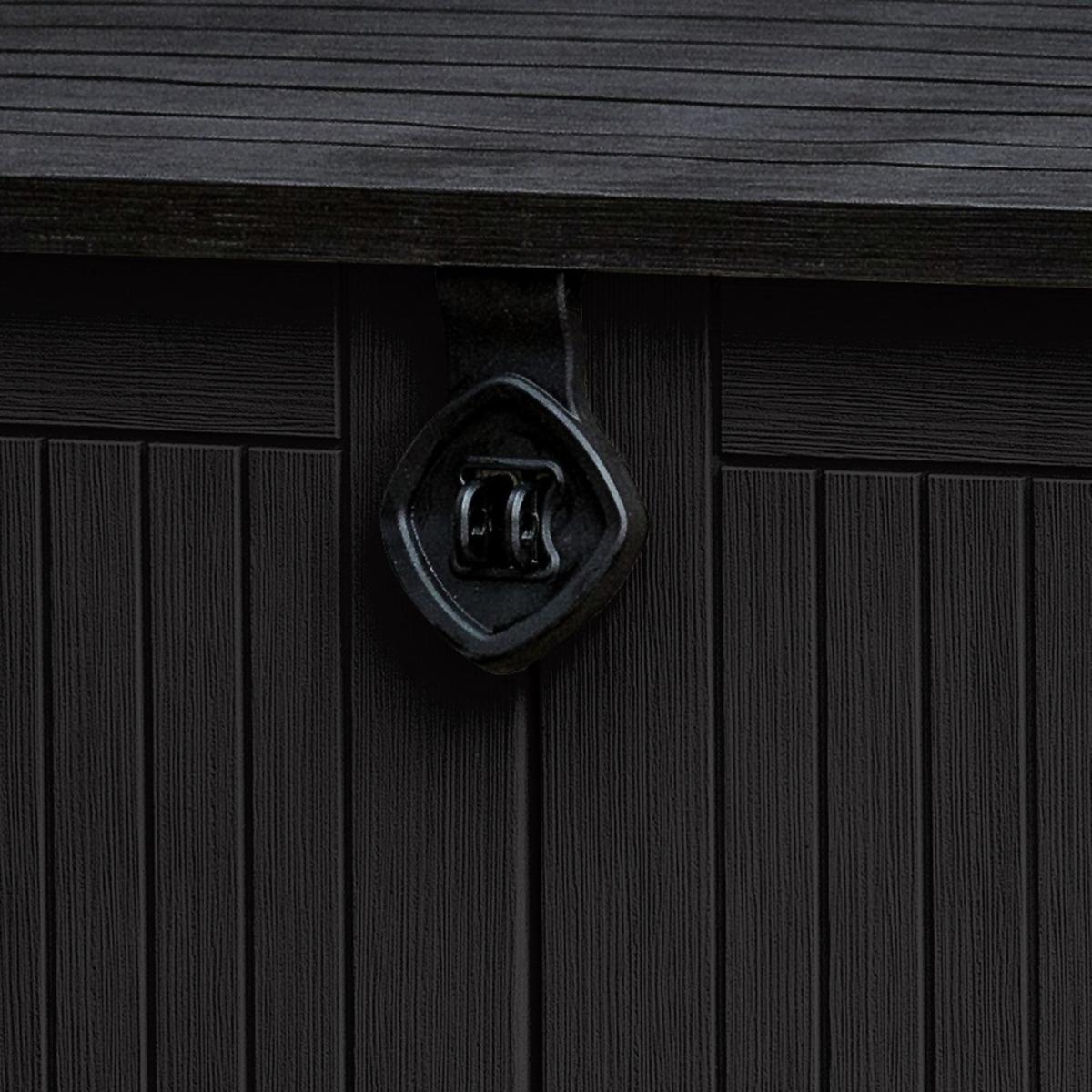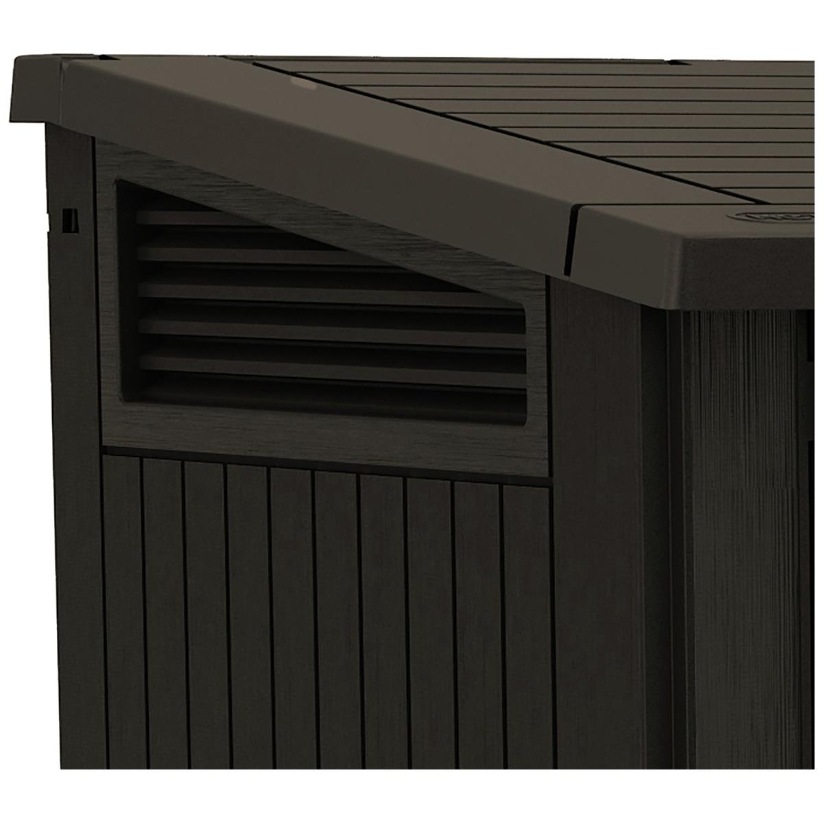 The Store It Out MIDI is an ideal storage solution for garden equipment. With its stylish wood-look design, 880. L capacity and durable, weather-resistant construction, it is built to last. It includes built-in ventilation, a sloped floor to protect contents against mud and rainwater and a built-in support for you to add your own shelf. Convenient opening from the top or front and a step-on lock makes access easy when you need it. It can hold 2 x 120. L bins. Lockable for added security (padlock not included). Packaging fits in any car's boot, no delivery needed. Maintenance-free. No rust, dents or peel. UV protected. Made of plastic. Capacity 880 L. Lockable. External size H113.5, W132, D71.5cm. Internal size H108.8, W122, D61cm. Weight 18kg. 2 person self-assembly. Manufacturer's 5 year guarantee.