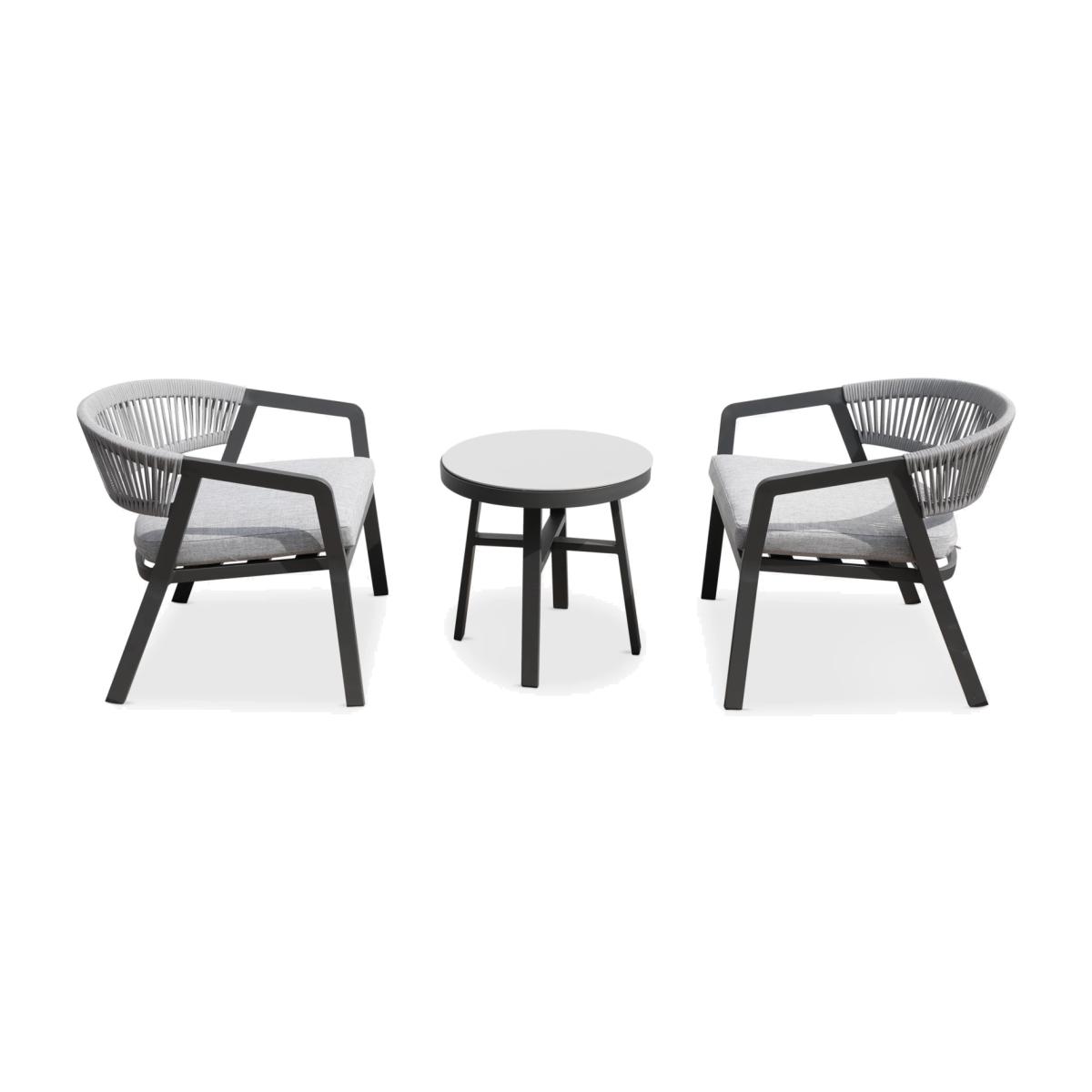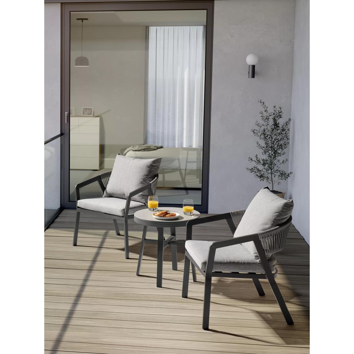The Cassis two-seater companion set from Menos by KETTLER is a modern and weatherproof design for relaxing on balconies or in smaller garden, patio or indoor spaces. The set includes two comfortable round back armchairs and a compact side table with a glass top. The lightweight yet sturdy aluminium frames are powder-coated to prevent rusting and they feature PVC rope weaving on the seating that's tough and waterproof so the set can be left outside all year round. When not in use, the comfortable seating cushion pads should be brought inside. Key features: Garden side table and two garden armchairs 5mm thick safety glass tabletop Sturdy powder-coated aluminium frames Weatherproof furniture Comfortable cushion pads Easy to maintain Want to see it first? You may want to see and get a feel for the furniture in one of our shops before ordering. We'll be able to tell you where the range you'd like to view is on display.