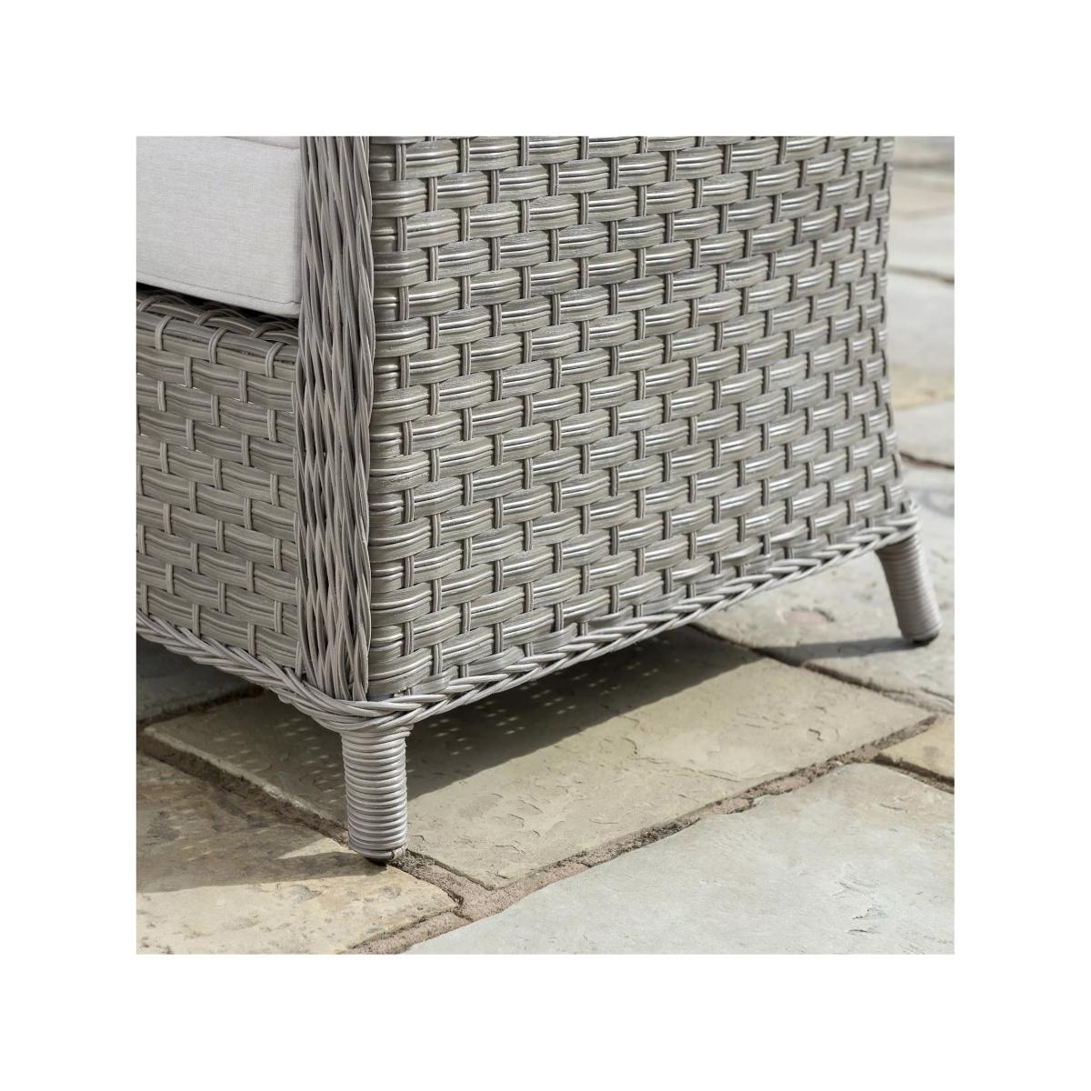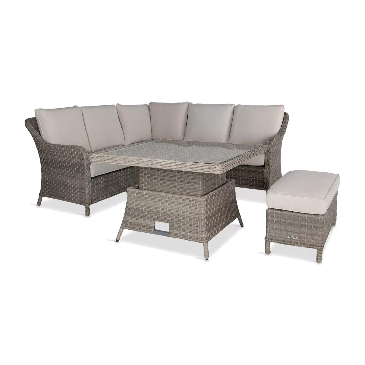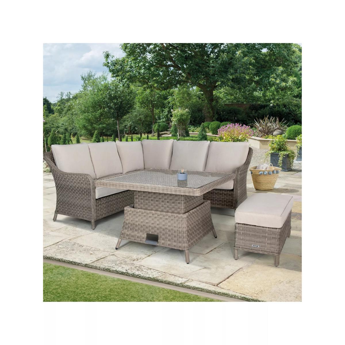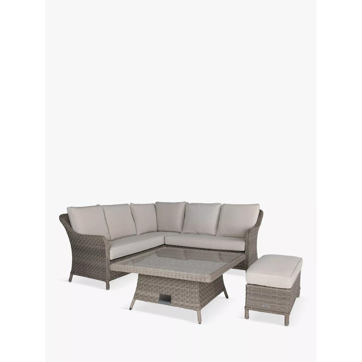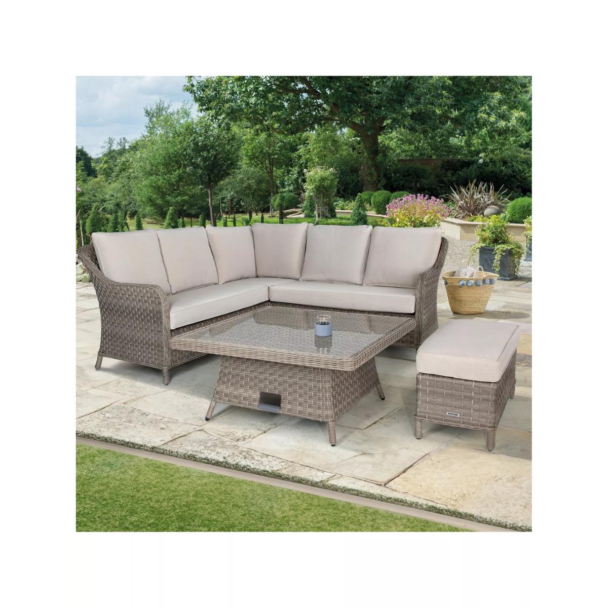 The Charlbury Signature mini corner set has a traditional rattan style but all the benefits of a modern corner set, seating up to six people. The versatile design means you can dine or lounge on this set, indoors or outdoors. The set includes a corner sofa, a small bench and a rectangular high-low table with 5mm toughened, sunken glass so it has a completely flat top and doesn't allow movement. The table is height-adjustable to go from a coffee table to a casual dining table. Made with strong aluminium frames and UV-resistant hand-woven synthetic material, a hard-wearing traditional rattan look. The varied weave patterns include 5mm full round wicker on the edges and arms with 3mm horizontal flat weave and 5mm vertical double half round on the sides. Made for comfort, the cushions retain their shape thanks to the 5cm foam core and double piping. The set can be left outdoors all year round but bring the cushions in during inclement weather and over winter. Key features: Mini corner garden sofa seats up to five people; small garden bench Height-adjustable rectangular garden table with glass top Traditional-style handwoven synthetic wicker Weatherproof, rustproof and UV-resistant Lightweight yet robust aluminium frames Double piped cushions and 5cm foam core cushions Soft, weatherproof cushions Adjustable feet for uneven surfaces Easy to maintain Match with other furniture in the Charlbury range