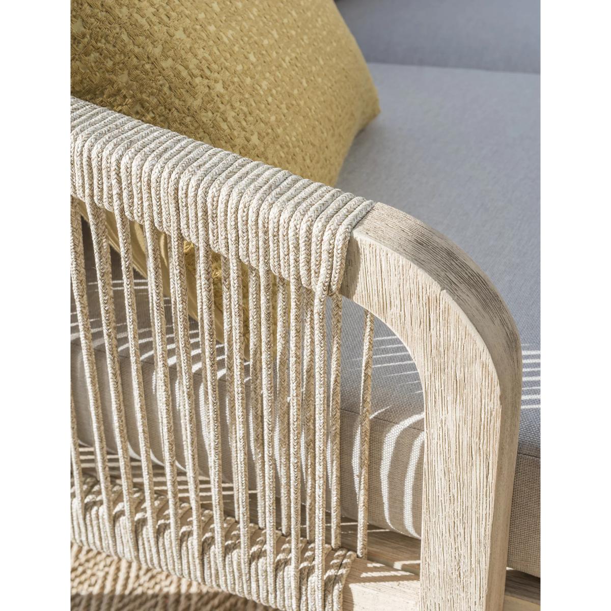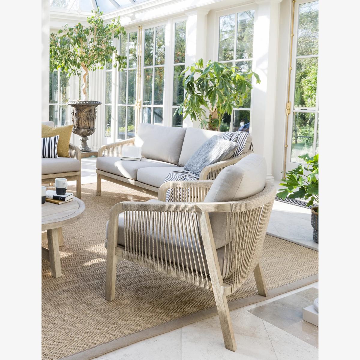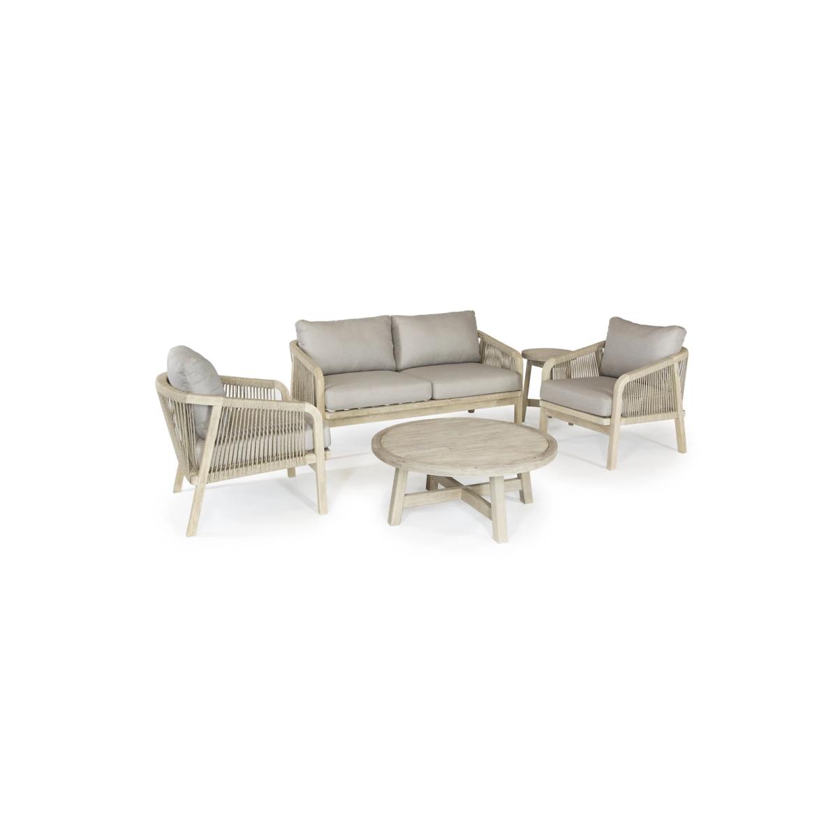 Enjoy leisurely moments with the Cora lounge set from Kettler. This four-seater set includes a sofa and two armchairs with a round coffee table. A beautiful acacia hardwood frame and weatherproof rope detailing create a rustic aesthetic and offer lasting durability. The set is complete with plush cushions for comfort.
