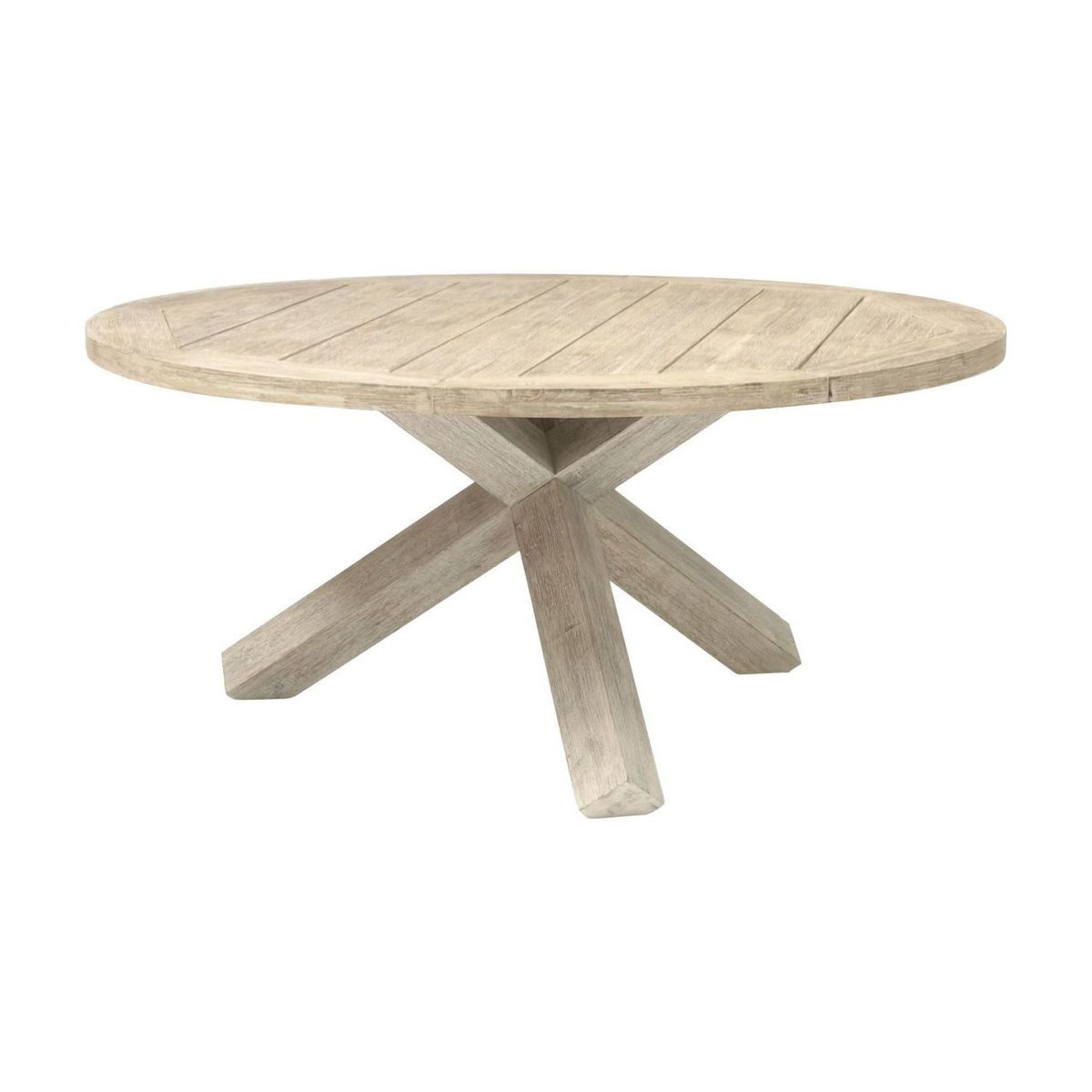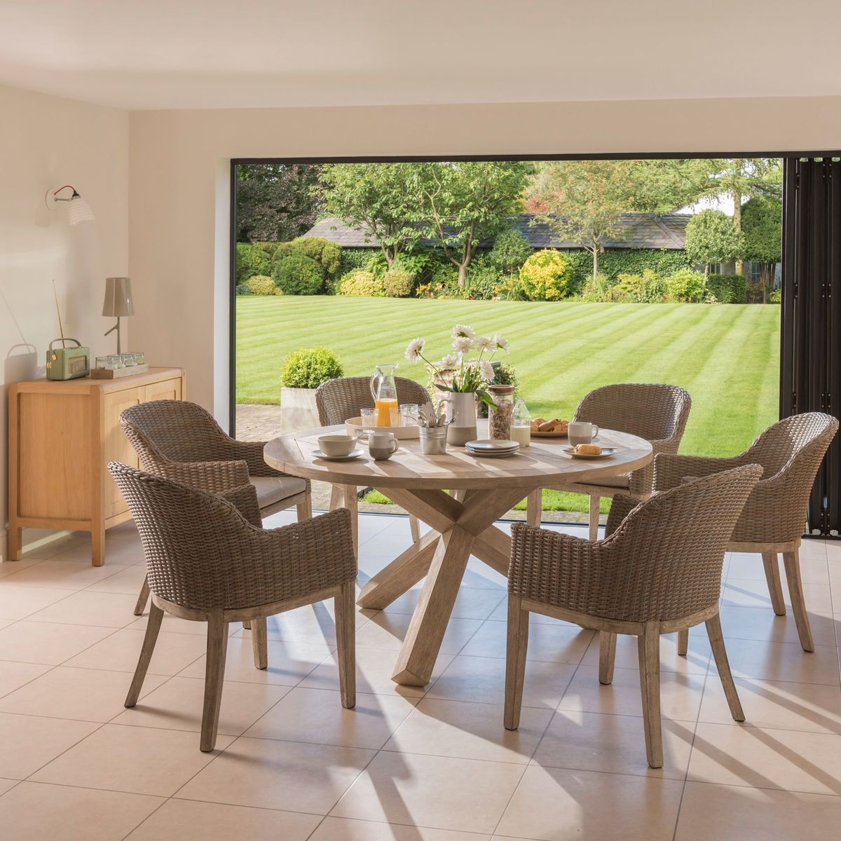 Classic design with distressed white wash finish;Made from FSC certified acacia;Seats up to 6 people;Floor clearance: 29cm;Dine outside and make an impact with this high quality 6 seater round dining table. Combine with the matching Cora dining chair and armchair to create the perfect dining scene.;A wood and weave furniture range, Cora combines FSC certified acacia with synthetic wicker to introduce chairs, tables and sofas to the home or garden.