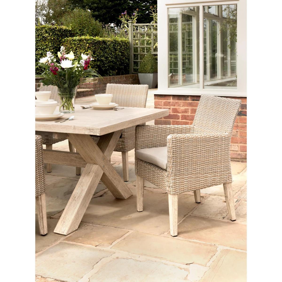 Made from high-quality, hardy FSC-certified acacia wood, this pair of Cora garden armchairs from KETTLER are designed for use outdoors or in a conservatory. With their weather-resistant synthetic wicker high backs and armrests, plus seat pads, they provide comfortable seating at the dining table. Key features: Pair of Cora garden dining armchairs Made of FSC-certified acacia wood Weather-resistant wicker Matches furniture in the Cora range by KETTLER Floor clearance: 29cm Want to see it first? You may want to see and get a feel for the product in one of our shops before ordering. We'll be able to tell you where the range you'd like to view is on display. Choose the perfect outdoor furniture We have a selection of wooden furniture for you to choose from which will suit the home or garden. Below are a few options to consider when choosing your perfect outdoor furniture. Teak A premium and popular wood with an attractive appearance which ages beautifully. Strong, durable and resistant to rot and decay, this furniture requires little maintenance Eucalyptus Distinctive scent and appearance which darkens as it ages. Provides similar natural benefits to teak including moisture resistance, hardness and durability. It's plentiful in supply which makes the furniture an inexpensive choice. Acacia Naturally durable, this wood is incredibly hard and is unlikely to suffer damage during everyday use. It provides similar natural benefits to teak, yet unlike many other hardwoods, acacia is also relatively fast growing which minimises the environmental impact.