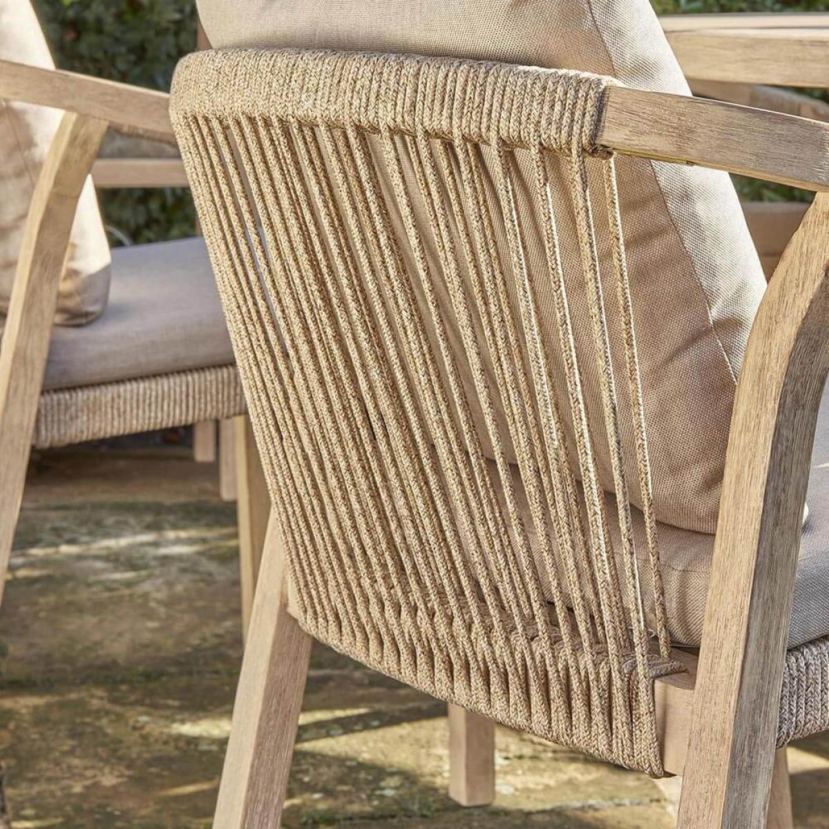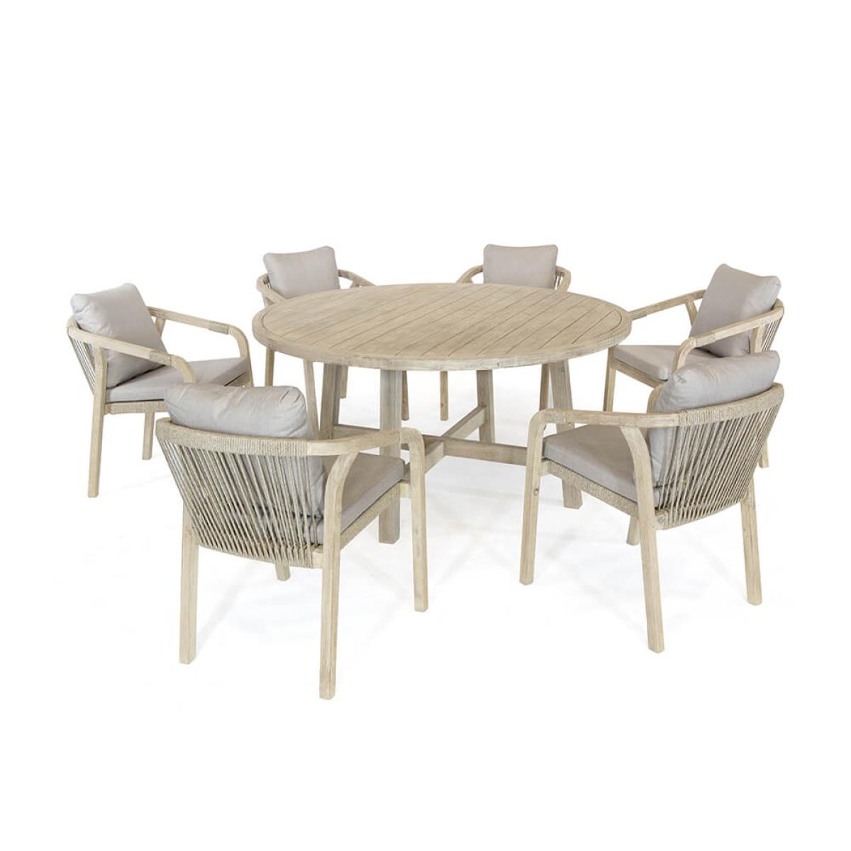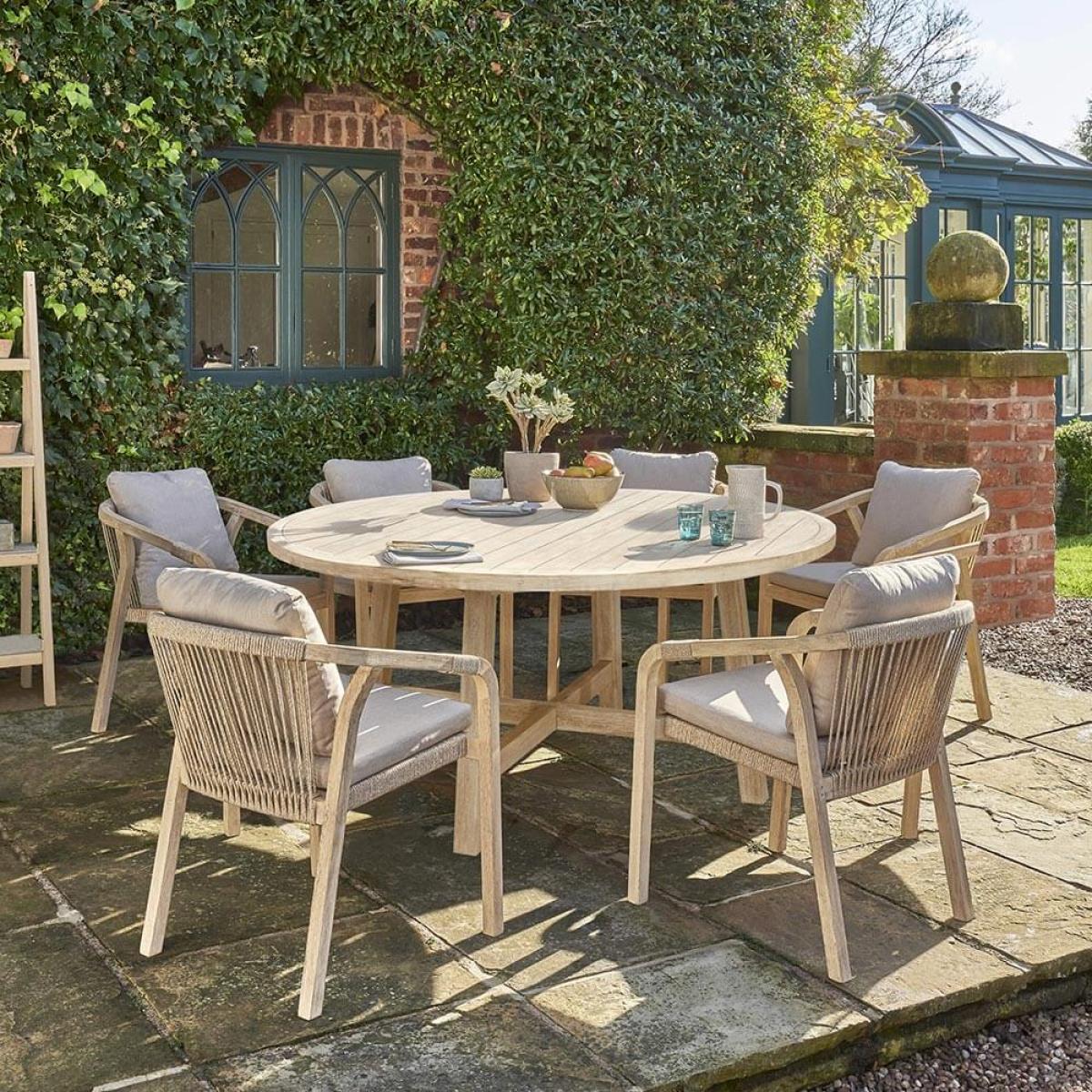 Set Consists of:. About:. Get the family or your close friends over this year and dine in sociable style in the garden upon the elegant Kettler Cora Round 6 Seat Dining table Set. This Acacia wood furniture provides a lovely natural tone dining set for use on patios, decking, lawns and verandas. Equally it is nicely suited to slot into indoor settings too, befitting a conservatory, sun-room or even a dining room. The beautiful grained hues of the acacia wood are light a bright, breathing an elegance into your space. Matched with the unique design chairs this solid wood garden furniture is a true example of the benefits of mixing traditional with contemporary. The timber itself is hardwood and can deal with life outdoors, we do just recommend sticking to a regular semi-annual care routine of dusting and refinishing with. Hardwood products. For best care. A 150cm circular table is ample room to fit 6 people around, whilst a round design only encourages sociable dining. Its base is sturdy and in keeping with the table surface. Accompanying the table are 6 Cora Rope Arm Chairs, these chairs proudly display a memorable rope design making up the seat and backs. The material is UV resistant and expertly complement the wood. These chairs are topped with thick seat and back cushions for superior comfort and inevitable hours of alfresco dining and socialising. They’re resistant against light rain showers but just be sure to store these indoors for heavier weather and certainly the winter months. We foresee many sunny alfresco dining memories shared around this stylish garden dining table set. Special things to note on caring for this set:. Key Features:.