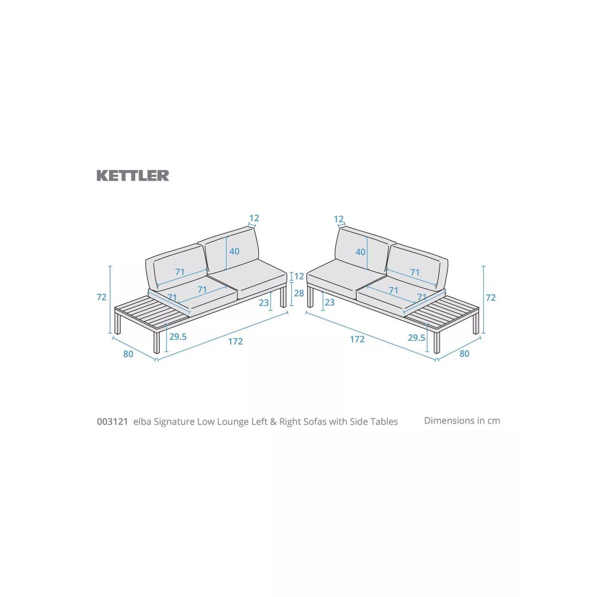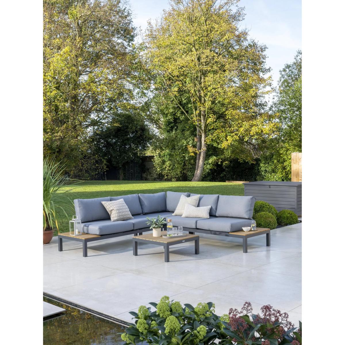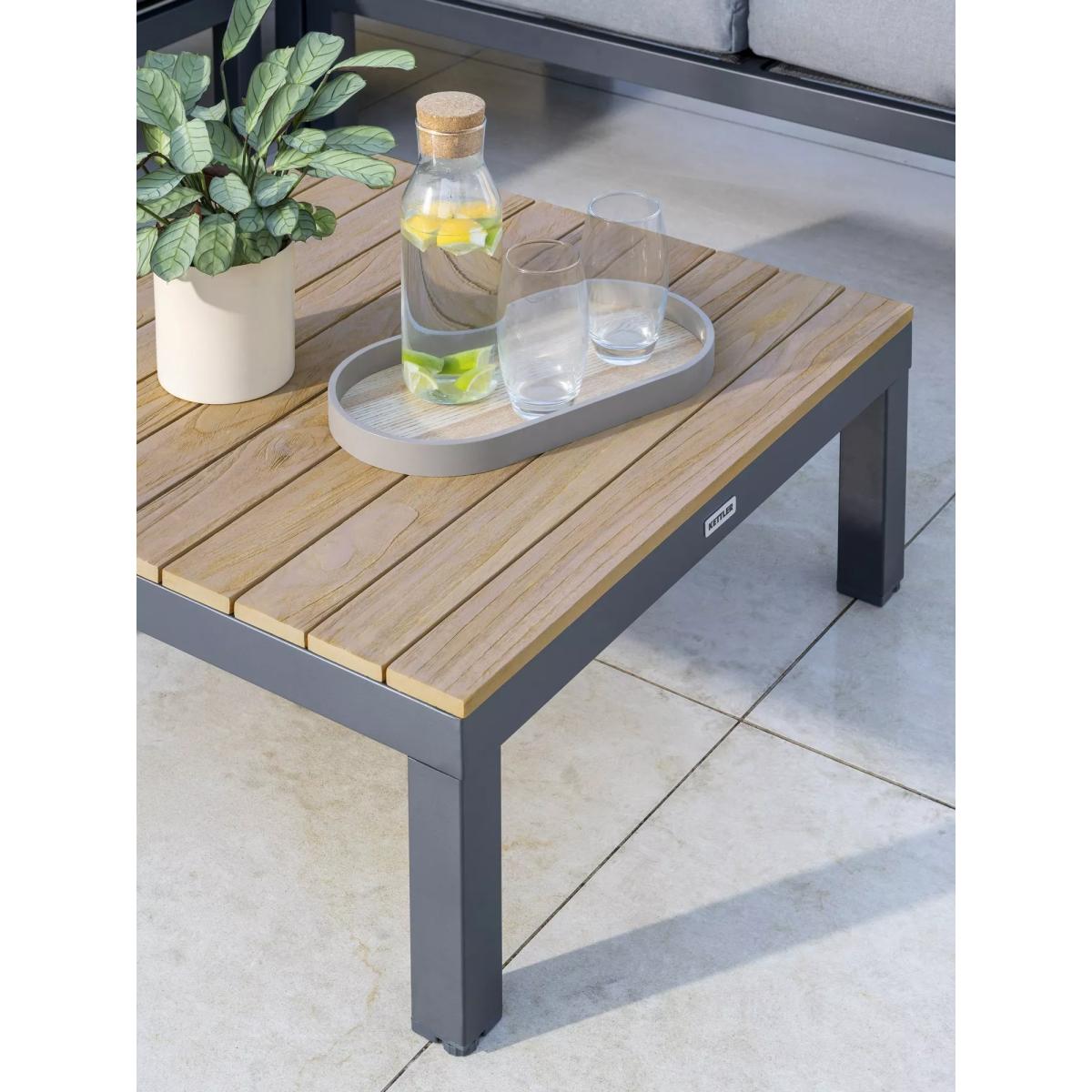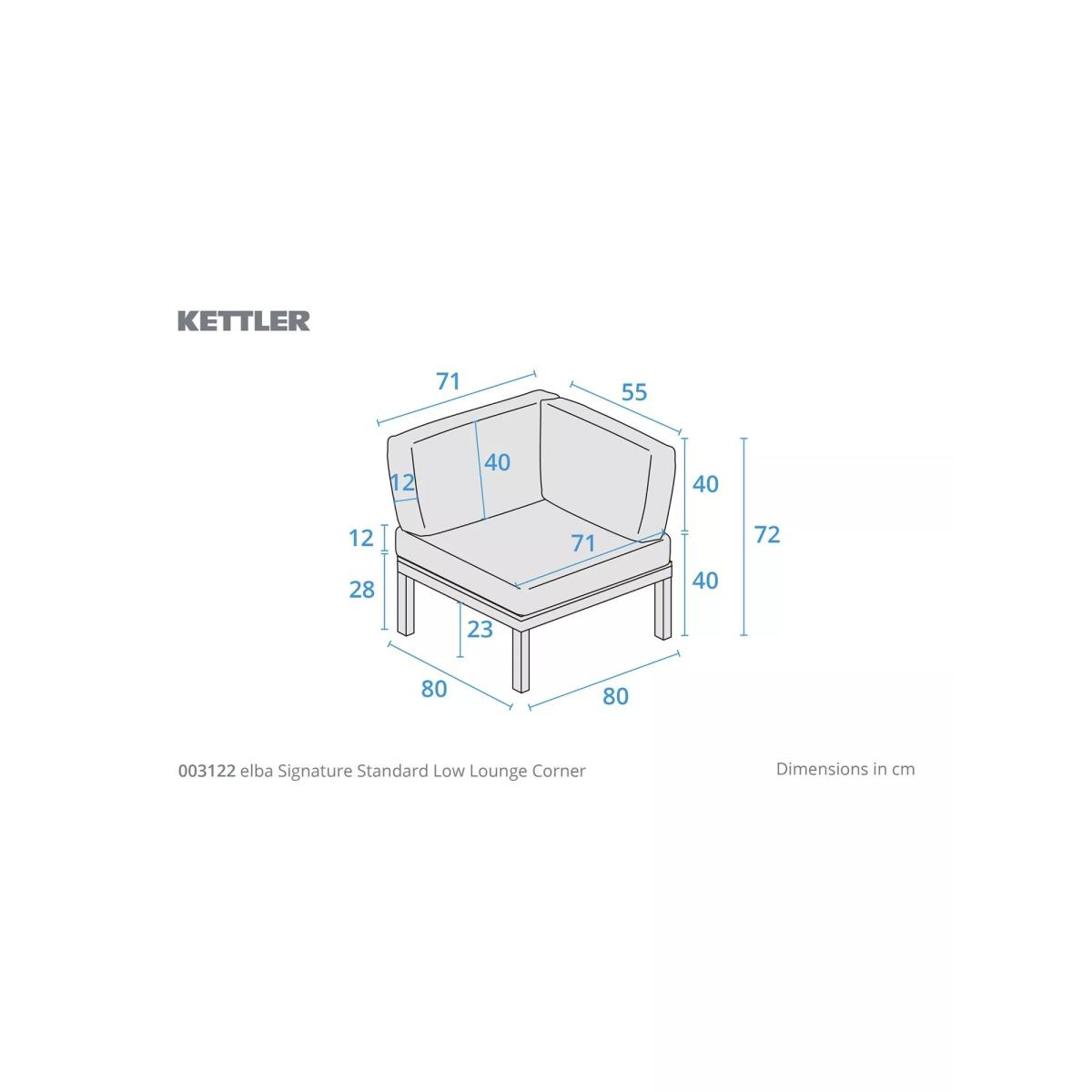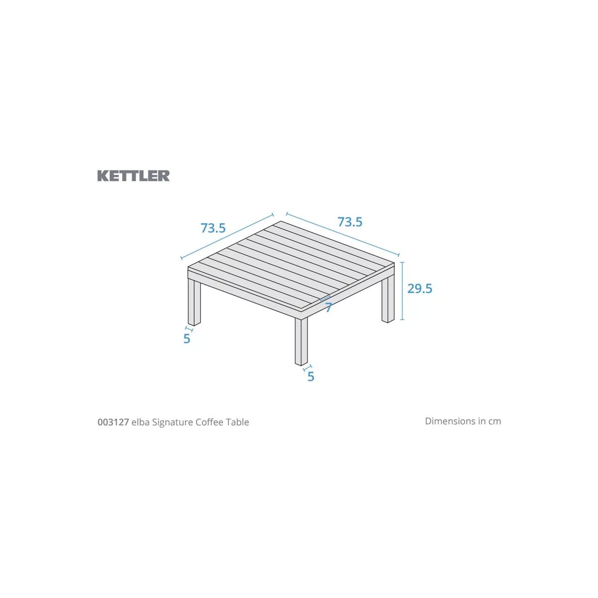 Elba lounge furniture with robust aluminium frames and beautiful wooden side tables and coffee table. Matching the minimalist and modern design of the Elba range of outdoor furniture, it's designed for comfort. The aluminium frames are strong yet lightweight, weatherproof and rust-proof. The set includes a low-height corner sofa that seats up to five people with seat and backrest cushions for comfortable support. Five-seater low corner sofa Robust yet lightweight aluminium frames Wood finish on the sofa side tables and square coffee table tops Comfortable seat and backrest cushions Weatherproof design for outdoor use Part of the KETTLER Elba range of garden furniture Care information Can be left outdoors all year round, excluding the cushions Cover the weatherproof cushions when not in use in order to use immediately. If the cushions get wet from a shower, they take around 20 minutes to 2 hours to dry fully Cushions are sponge clean only. Use a fabric care kit to clean and protect the cushions. Store in a dry, ambient temperature during winter months For the furniture, remove dust regularly with a clean soft brush and wipe down with a clean damp cloth Clean the aluminium frames with warm soapy water, avoiding any harsh chemicals Tree sap and bird droppings should be cleaned off immediately with warm soapy water The wood tabletops require a hardwood cleaner, colour restorer and shield to maintain their good looks