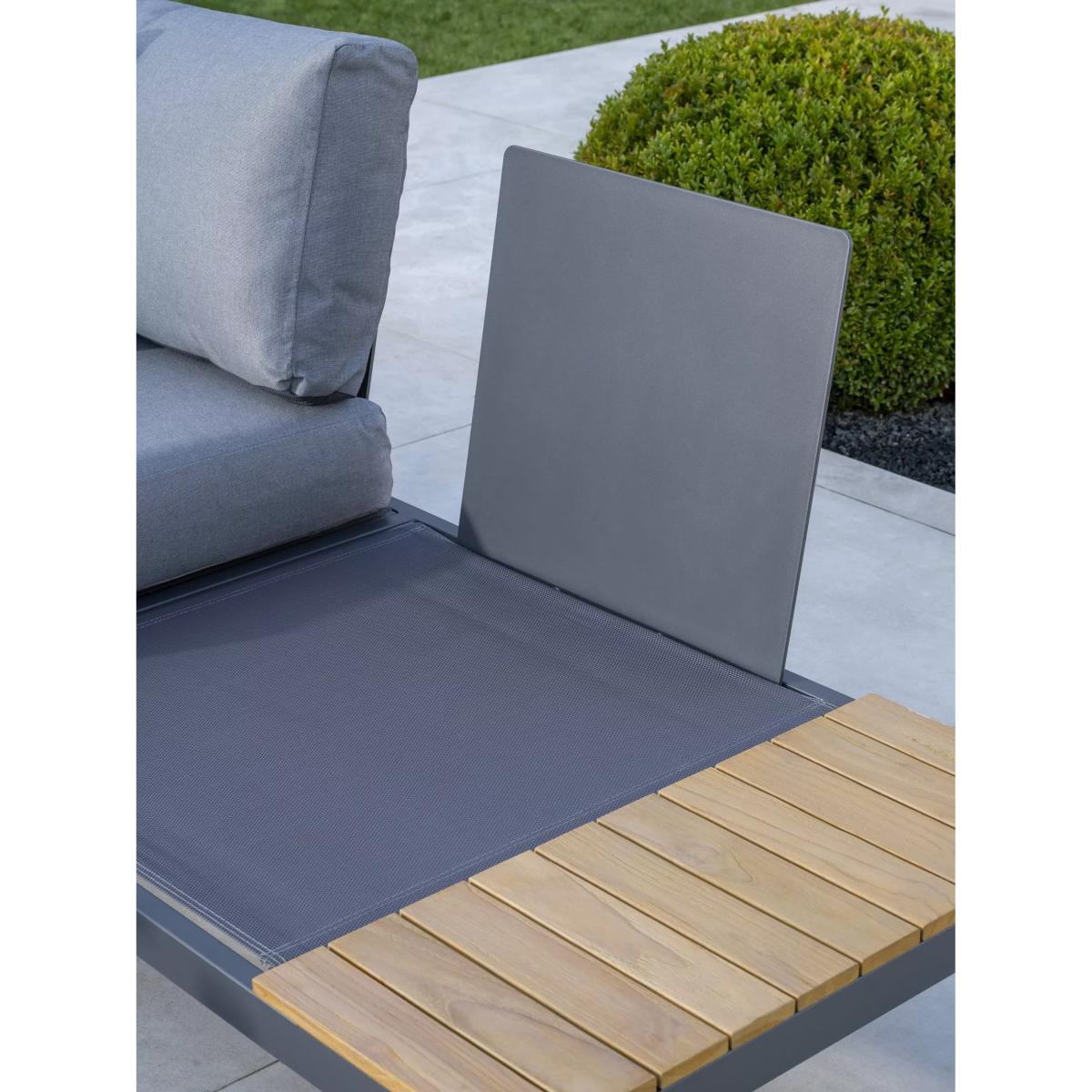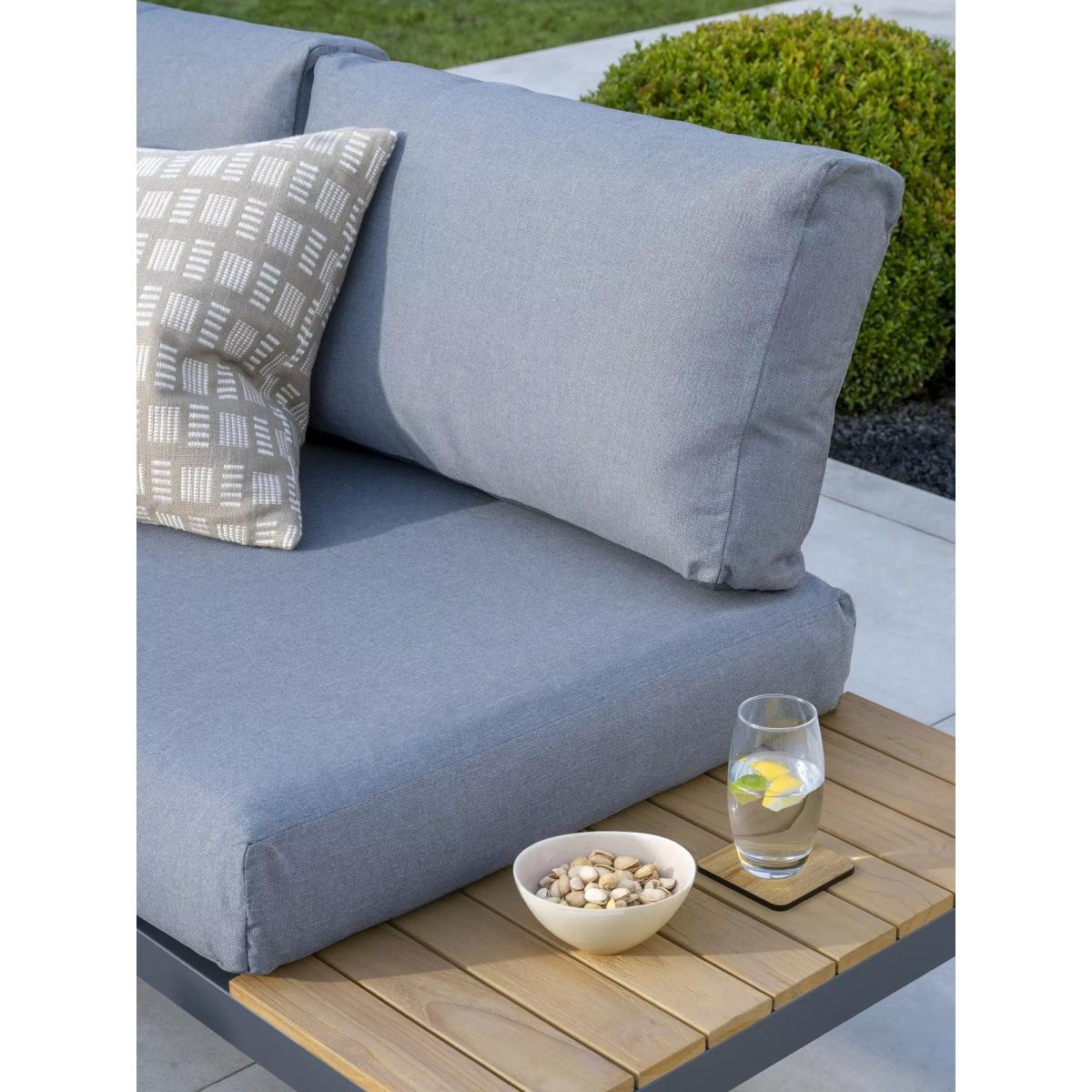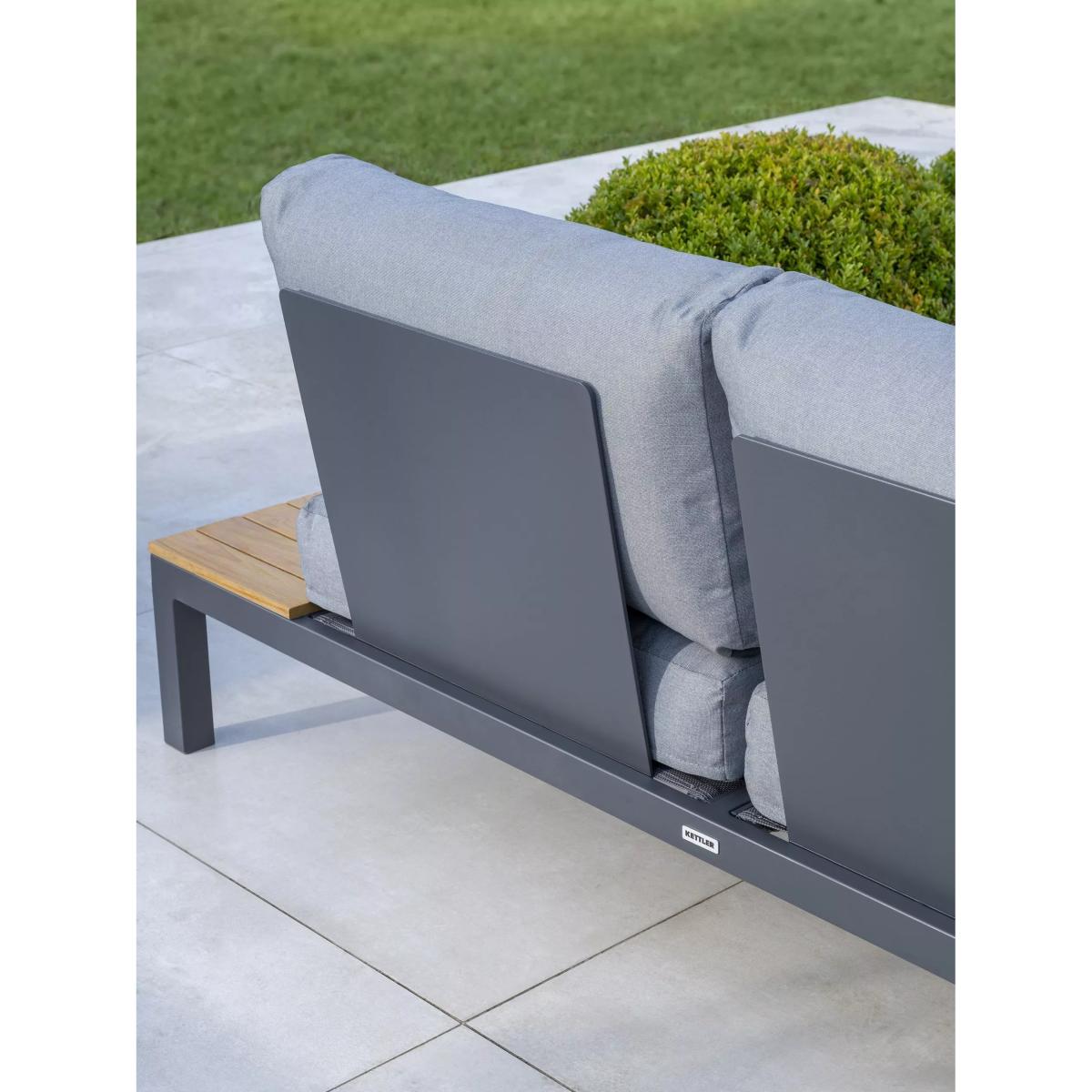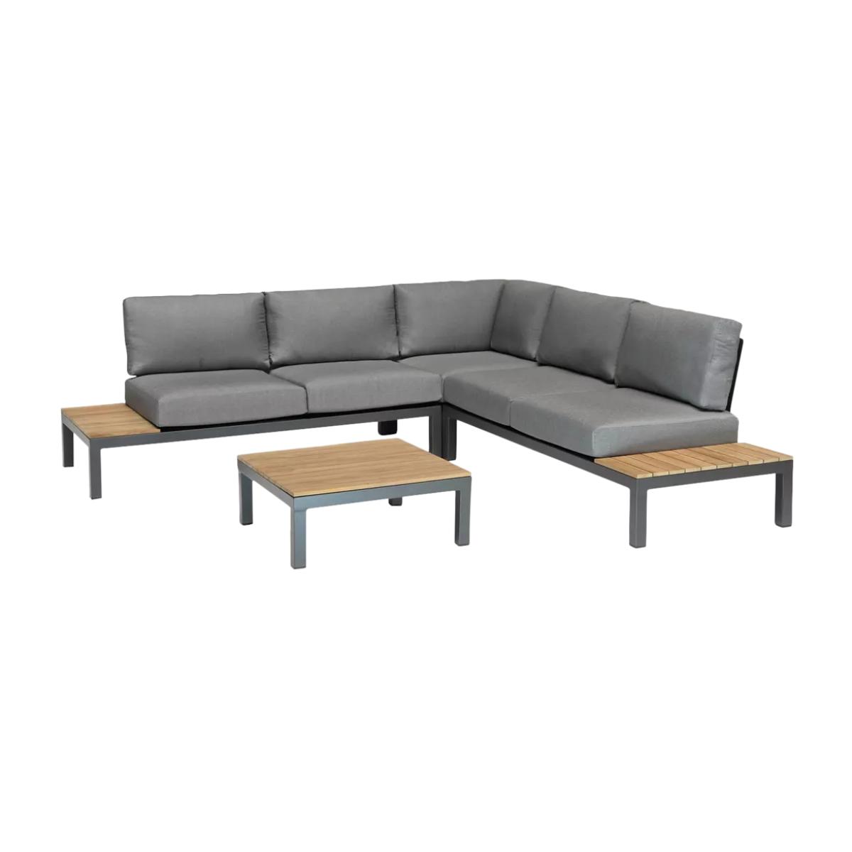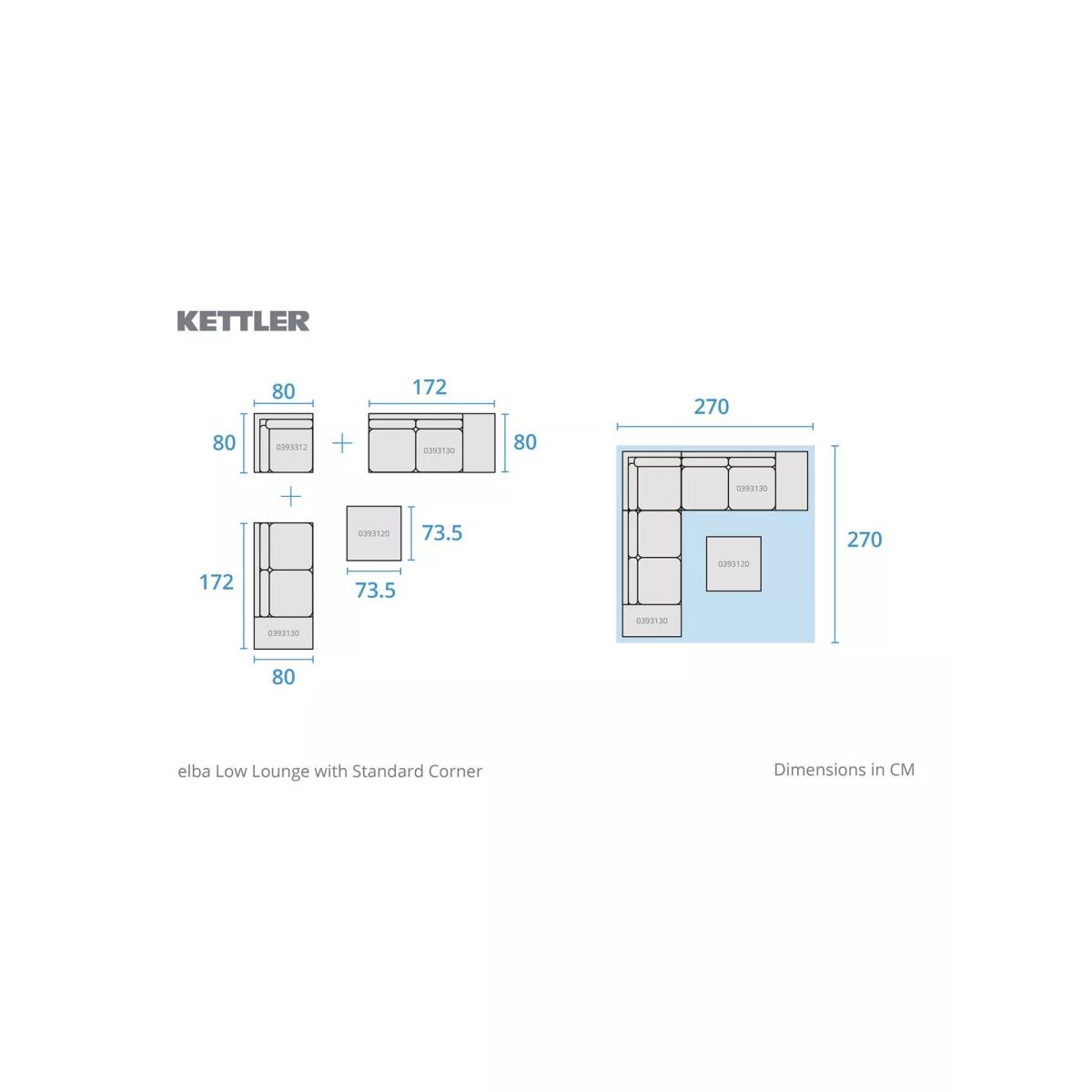 Elba lounge furniture with robust aluminium frames and beautiful wooden side tables and coffee table. Matching the minimalist and modern design of the Elba range of outdoor furniture, it's designed for comfort. The aluminium frames are strong yet lightweight, weatherproof and rust-proof. The set includes a low-height corner sofa that seats up to five people with seat and backrest cushions for comfortable support. Five-seater low corner sofa Robust yet lightweight aluminium frames Wood finish on the sofa side tables and square coffee table tops Comfortable seat and backrest cushions Weatherproof design for outdoor use Part of the KETTLER Elba range of garden furniture Care information Can be left outdoors all year round, excluding the cushions Cover the weatherproof cushions when not in use in order to use immediately. If the cushions get wet from a shower, they take around 20 minutes to 2 hours to dry fully Cushions are sponge clean only. Use a fabric care kit to clean and protect the cushions. Store in a dry, ambient temperature during winter months For the furniture, remove dust regularly with a clean soft brush and wipe down with a clean damp cloth Clean the aluminium frames with warm soapy water, avoiding any harsh chemicals Tree sap and bird droppings should be cleaned off immediately with warm soapy water The wood tabletops require a hardwood cleaner, colour restorer and shield to maintain their good looks