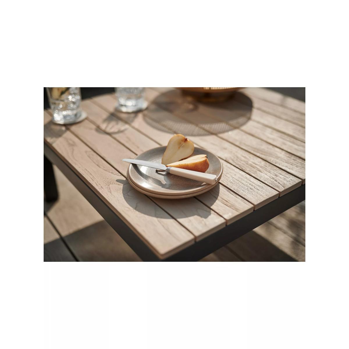 I love this garden table for its clean, modern look and versatile colour palette. The combination of grey and natural wood tones makes it easy to incorporate into a variety of outdoor settings, from contemporary patios to rustic terraces. It works particularly well with neutral or muted outdoor furniture, but can also serve as a statement piece in more colourful or eclectic settings. Practical styling tips include pairing it with cushioned seating for comfort, adding outdoor lanterns or planters around it for visual interest, and keeping the surface clutter-free for a sleek, organised appearance. Its sturdy design and neutral colours make it a reliable choice to anchor a stylish outdoor space that feels both functional and inviting.