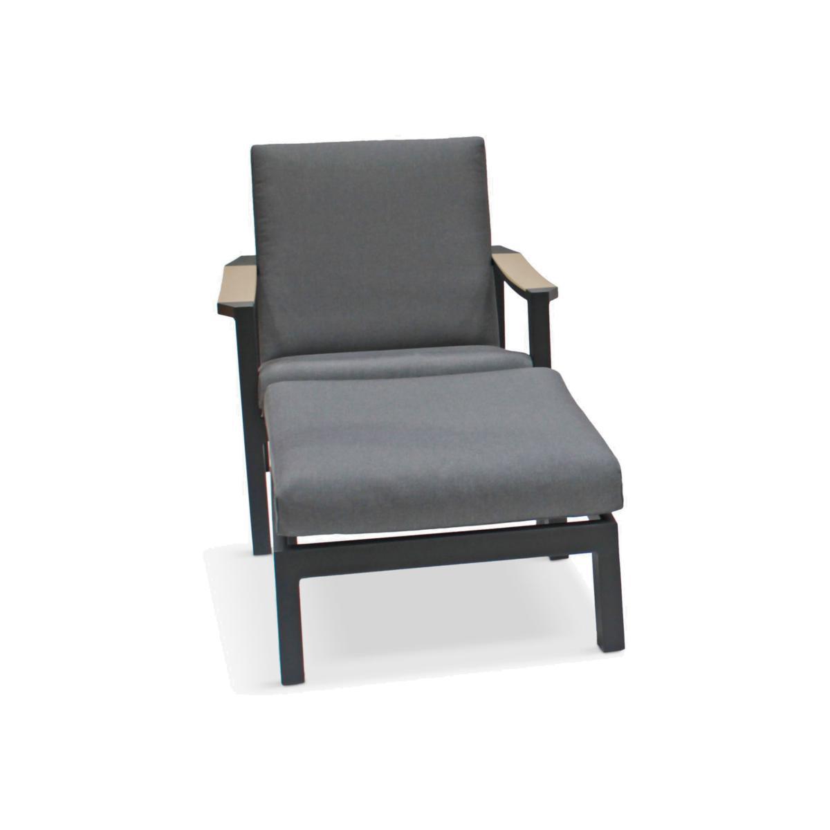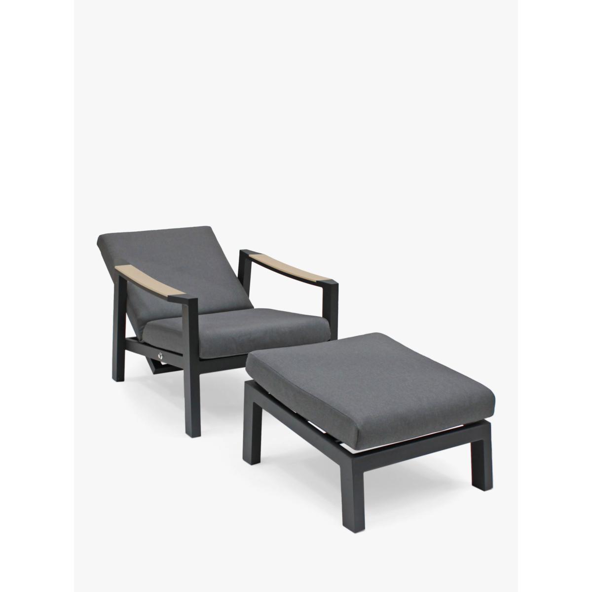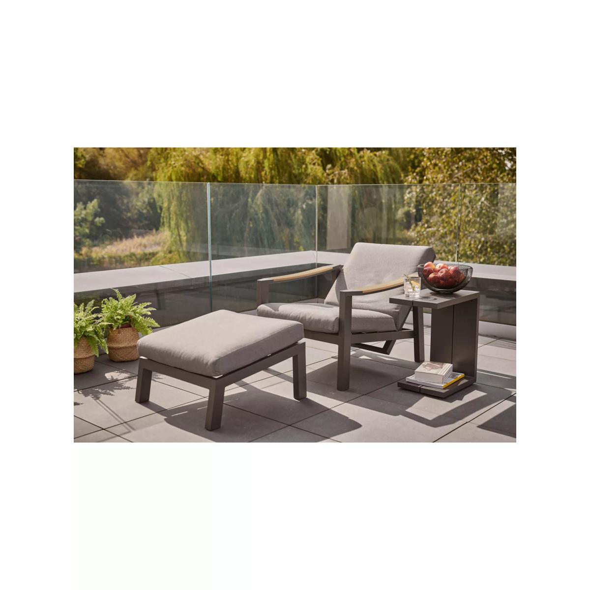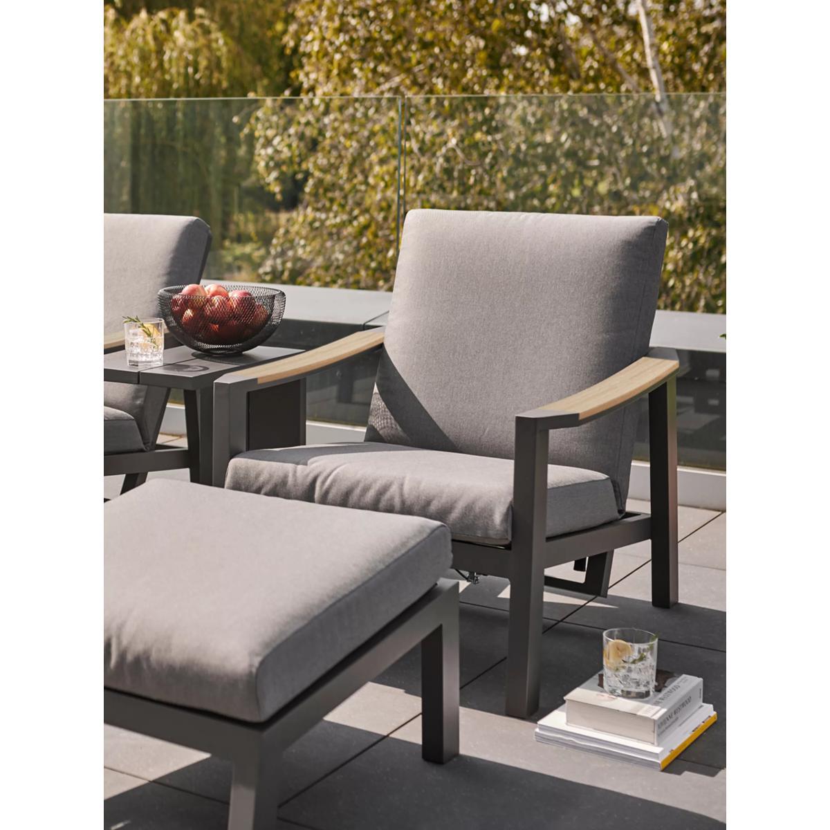 The KETTLER Elba relaxer chair and footstool are made with robust aluminium frames and beautiful teak wood touches on the armrests. Matching the minimalist design of the Elba range of outdoor furniture, the chair and angled stool can be left outdoors all year round. The aluminium legs are weatherproof and rust-proof. The chair and stool have a charcoal finish and foam-core cushioning in a complementary shade providing ultimate relaxation. The textile sling fabric moves with the contours of your body to ensure comfort and the cushions are made to retain their shape year after year. Bring the cushions inside during inclement weather and winter months. Simple to use via a hydraulic system, press the button on the side of the chair frame and push back to recline to your desired position. Key benefits Reclining chair and angled footstool Robust aluminium frames FSC-certified teak wood armrests Textile sling fabric cushioning Want to see it first? You may want to see and get a feel for the furniture in one of our shops before ordering. We'll be able to tell you where the range you'd like to view is on display.