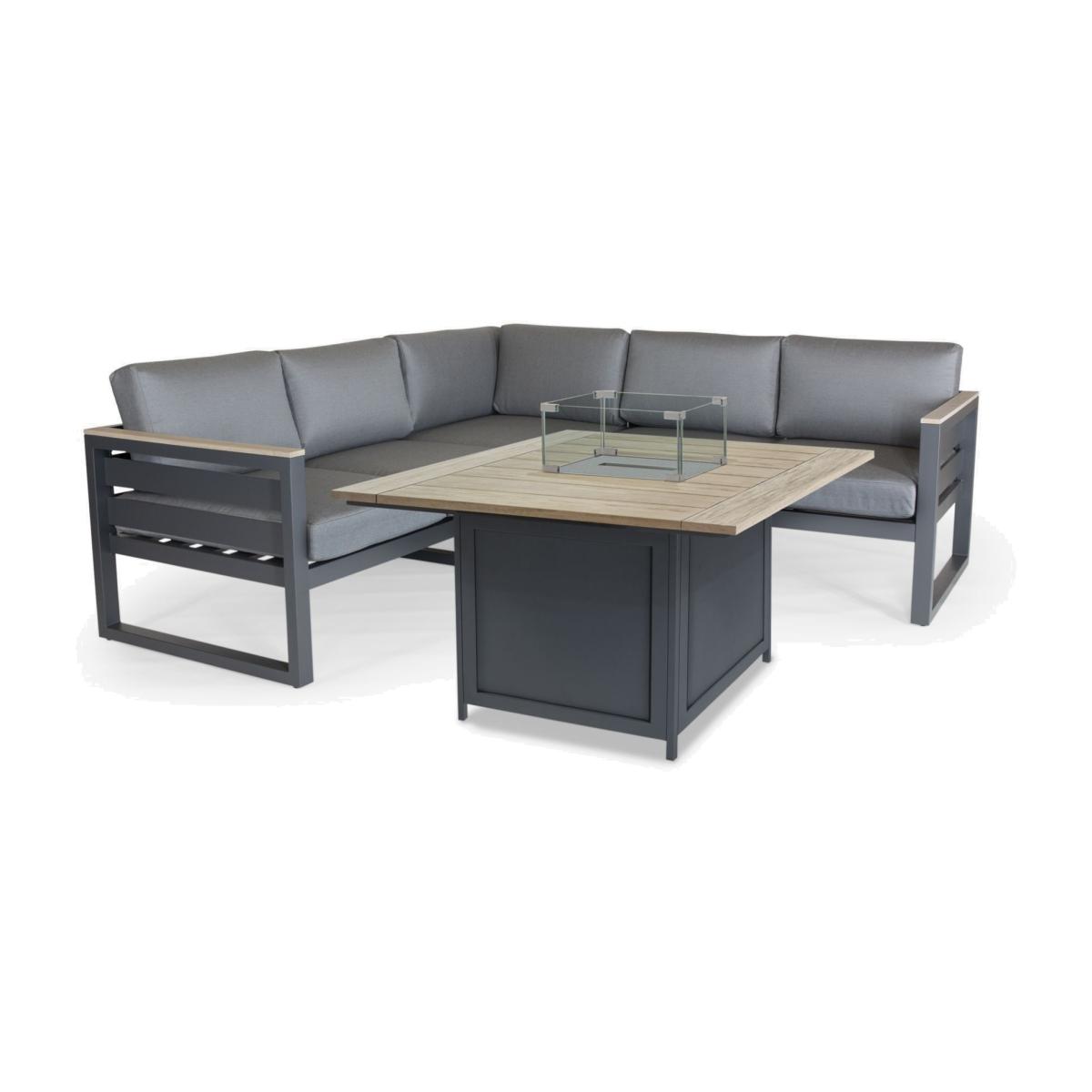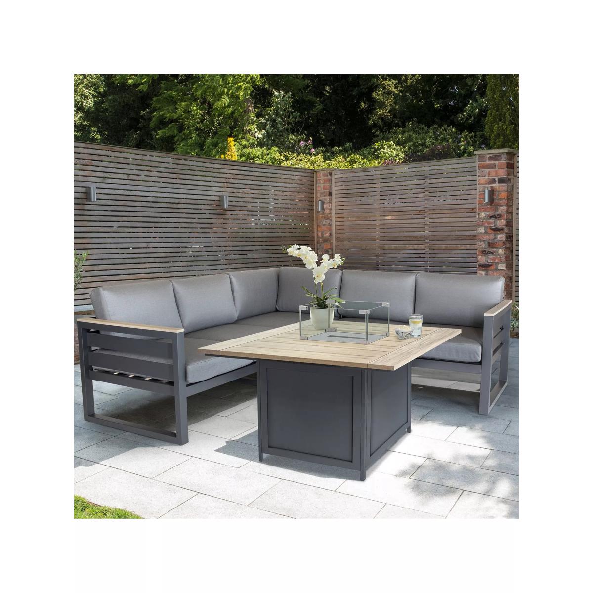 This KETTLER Elba Grande corner lounging set seats up to six people and is made with robust aluminium frames that are weatherproof and rust-proof. The set is completed with beautiful FSC-certified teak wood armrests and an FSC-certified teak wood table top. The square features a firepit in the middle to extend evenings spent outdoors. Matching the minimalist design of the Elba range of outdoor furniture, the set can be left outdoors all year round. Bring the cushions inside during inclement weather and winter months. The 6cm foam-core seat and backrest cushions, in a complementary shade, hold their shape and provide comfortable support for relaxation. Key benefits 6-seater corner lounging set Firepit table Robust aluminium frames FSC-certified teak wood armrests and square table top Comfortable foam-core seat and backrest cushions Matches furniture in the KETTLER Elba range