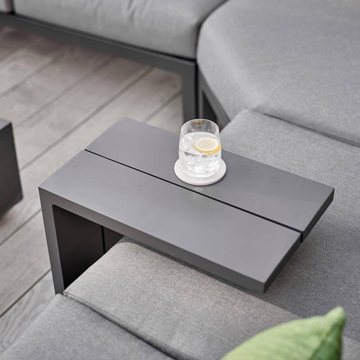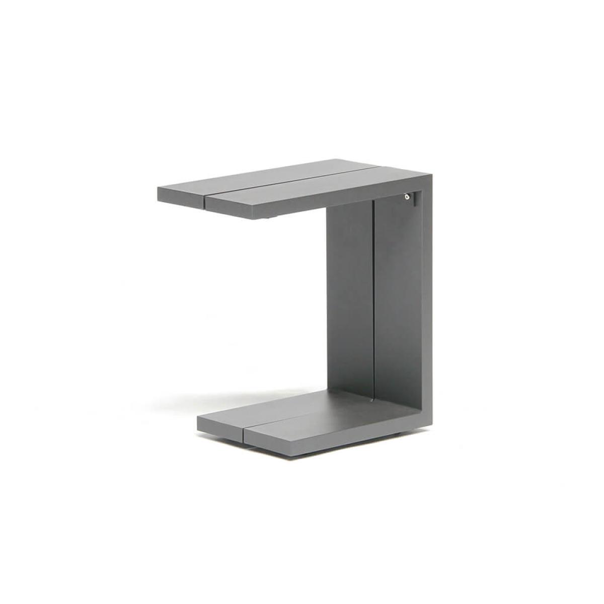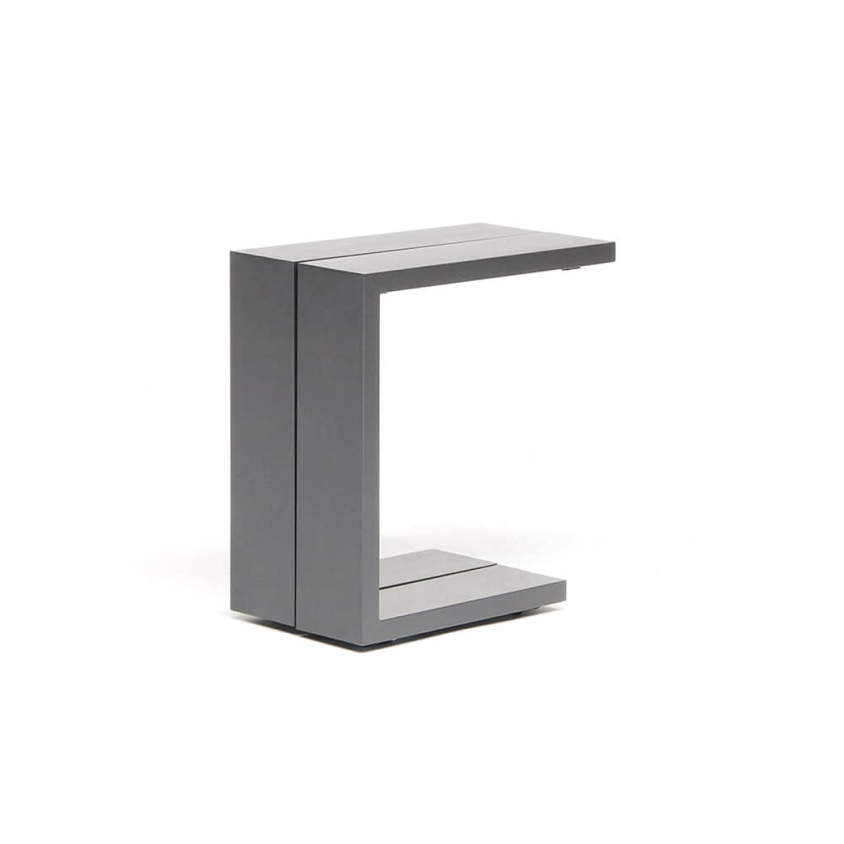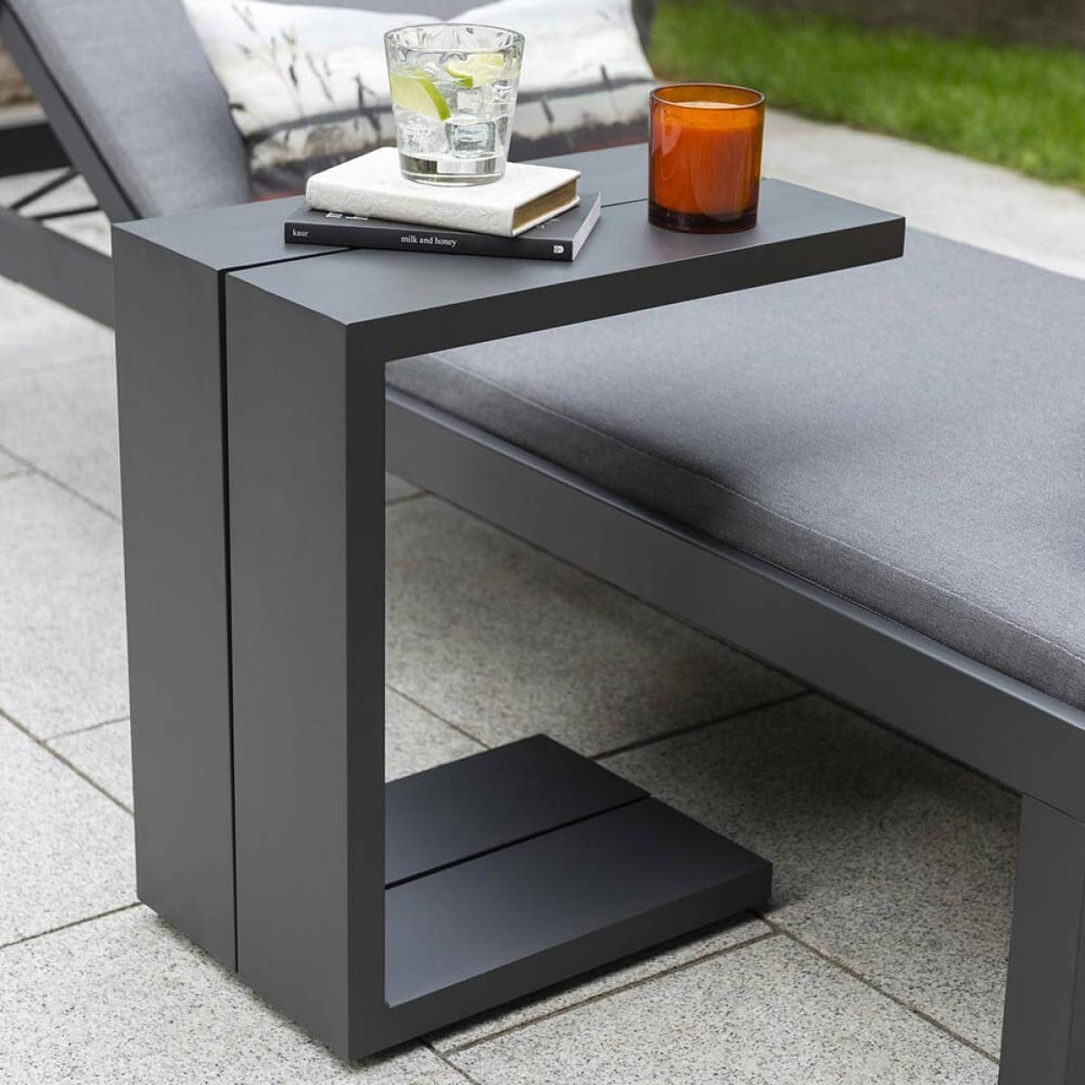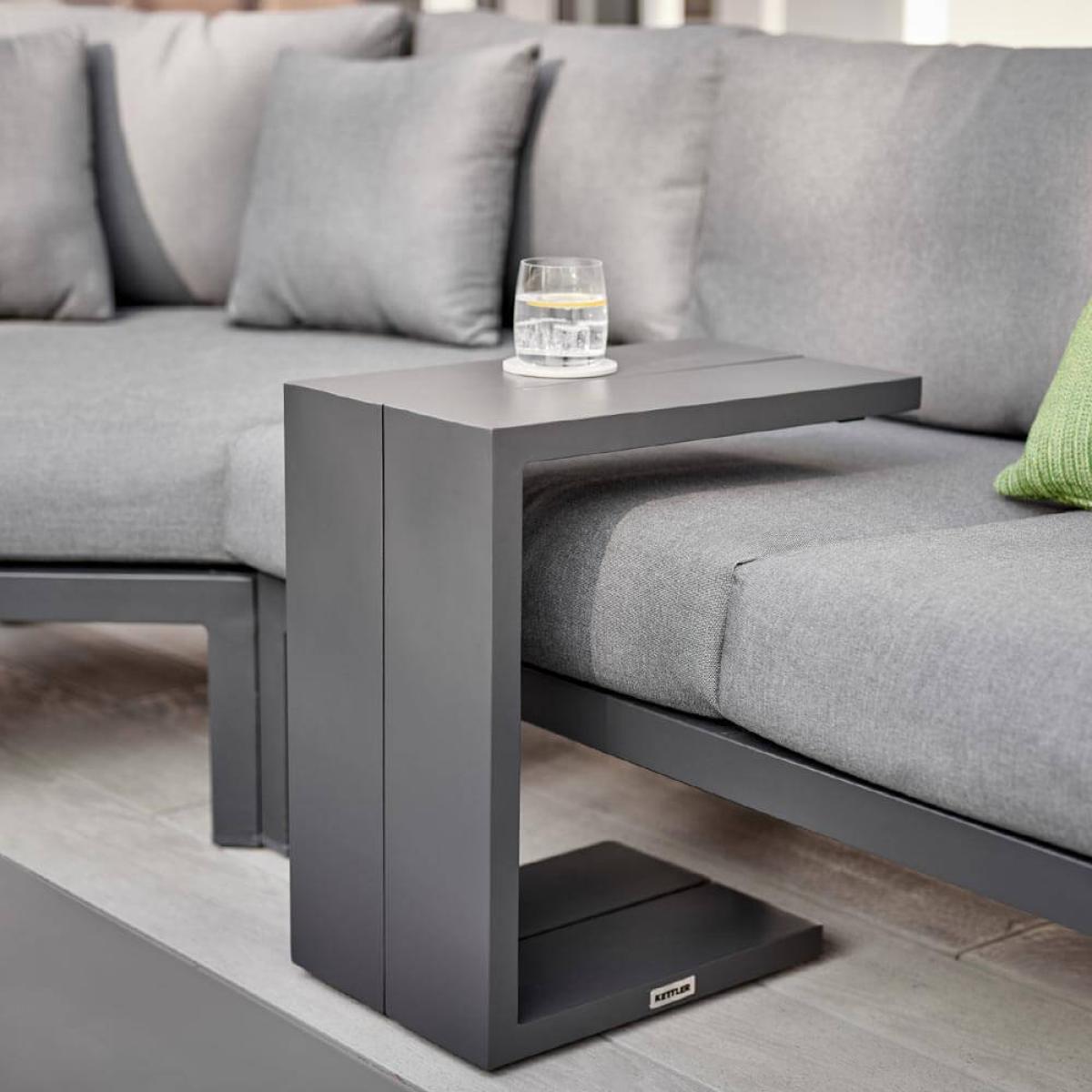 Product consists of:. This fabulous Kettler Elba Side Table is the perfect accompaniment to Kettler’s Elba Lounge ranges. The clever design of this modern metal garden furniture allows it to be placed directly adjacent to the lounge sets and offers an overhanging surface safely above the cushions beneath. Place drinks, small bites and books or magazines at arm’s reach. The on-trend pewter grey is a powder coated cast aluminium that won’t ever rust and wholly suits the other white contemporary aluminium garden furniture offerings in this collection. Key features:.
